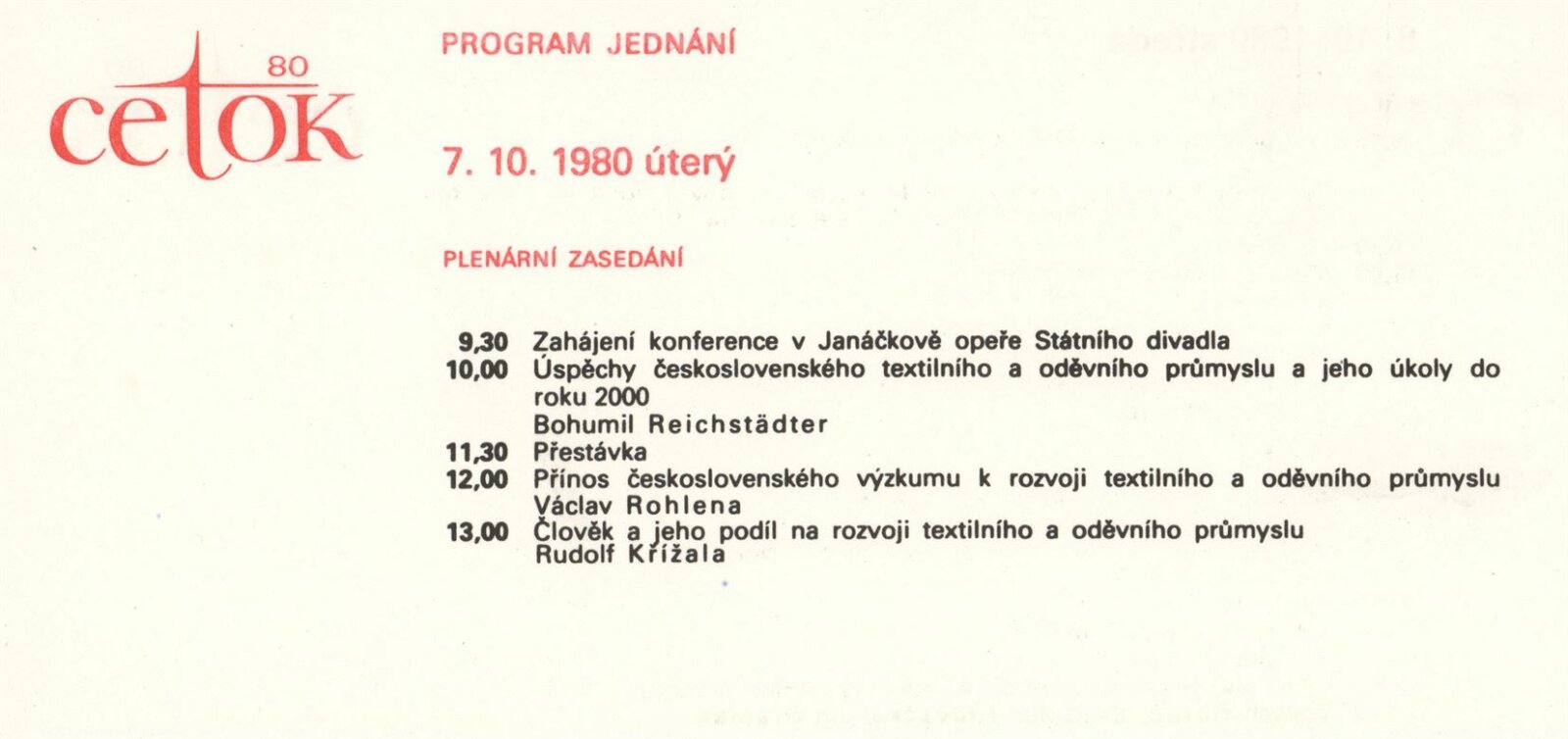 Výstava se konala při příležitosti III. celostátní textilní a oděvní konference CETOK 80. Zahájili ji Miloslav Doležal a Bohumil Reichstädter.