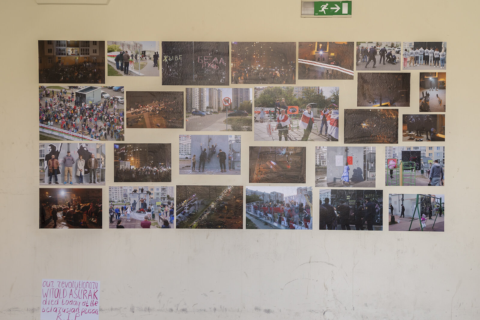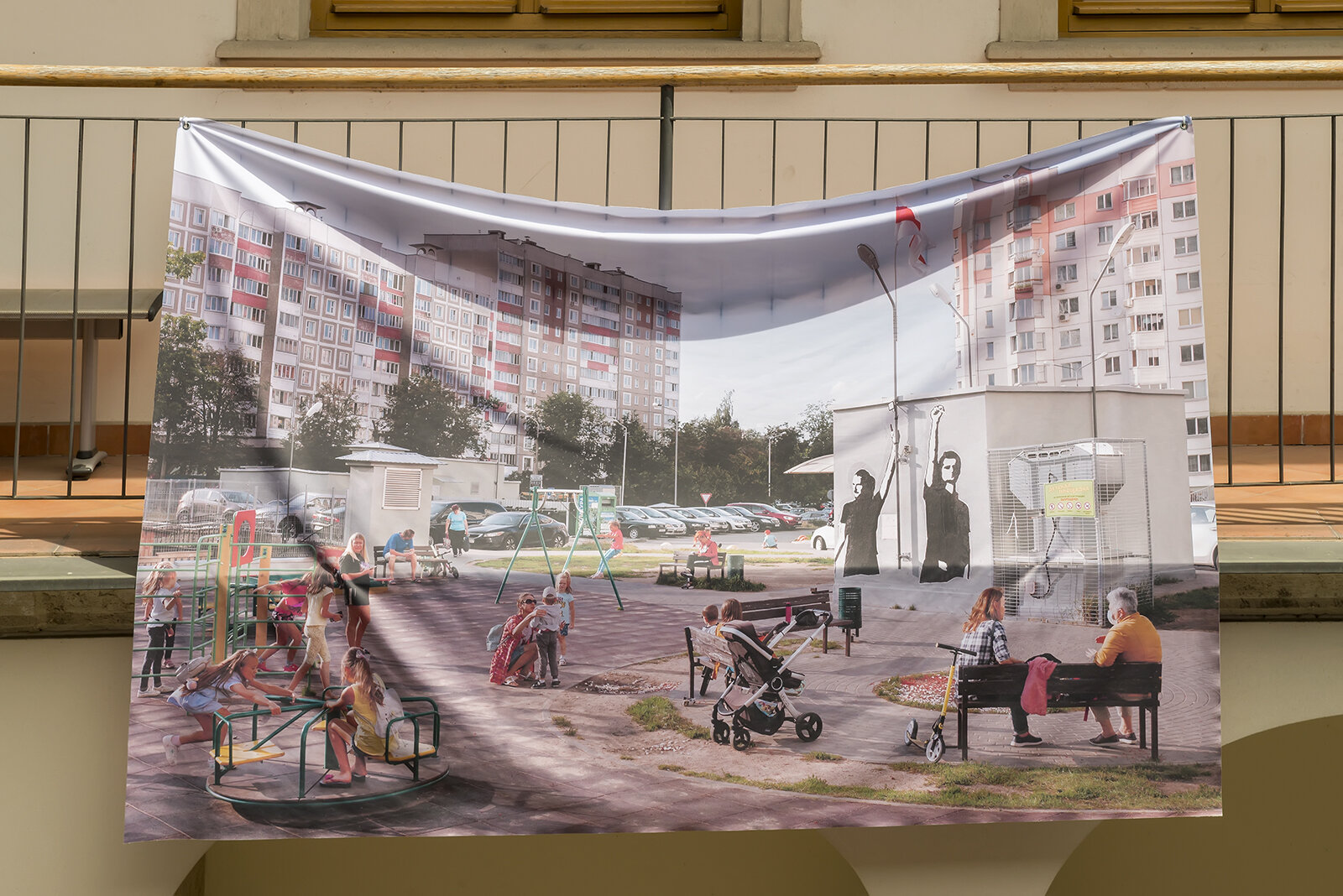 Attsetski’s photographs capture the events and atmosphere of anti-government protests that erupted throughout Belarus after the manipulated presidential election of 9 August 2020. The photographic documentation of the Square of Changes has been further developed since then on an ongoing basis; the “square” in question is in fact a small area among tall prefab buildings that the photographer’s flat windows give on to. It is actually a courtyard in a Minsk housing estate with a playground and a transformer station in the middle. On the wall of the transformer station, an unknown artist painted a graffiti depicting the so-called “DJs of change.” They were among the first protagonists of the protests, two sound engineers who played the protest song Expecting Changes during a pro-regime election rally and raised their hands in a gesture of triumph. They were subsequently arrested, and after their release they had to flee the country to escape further persecution.