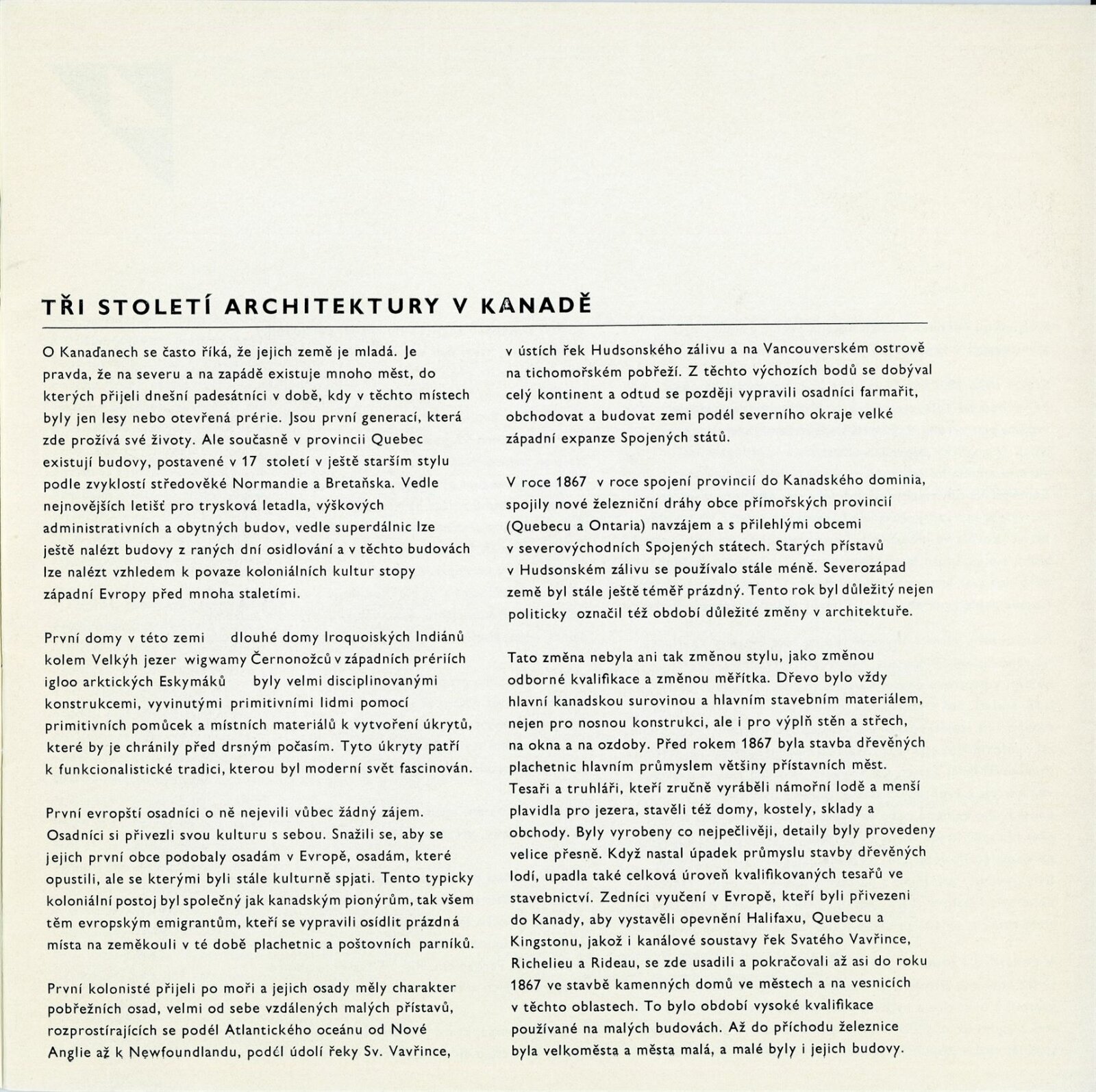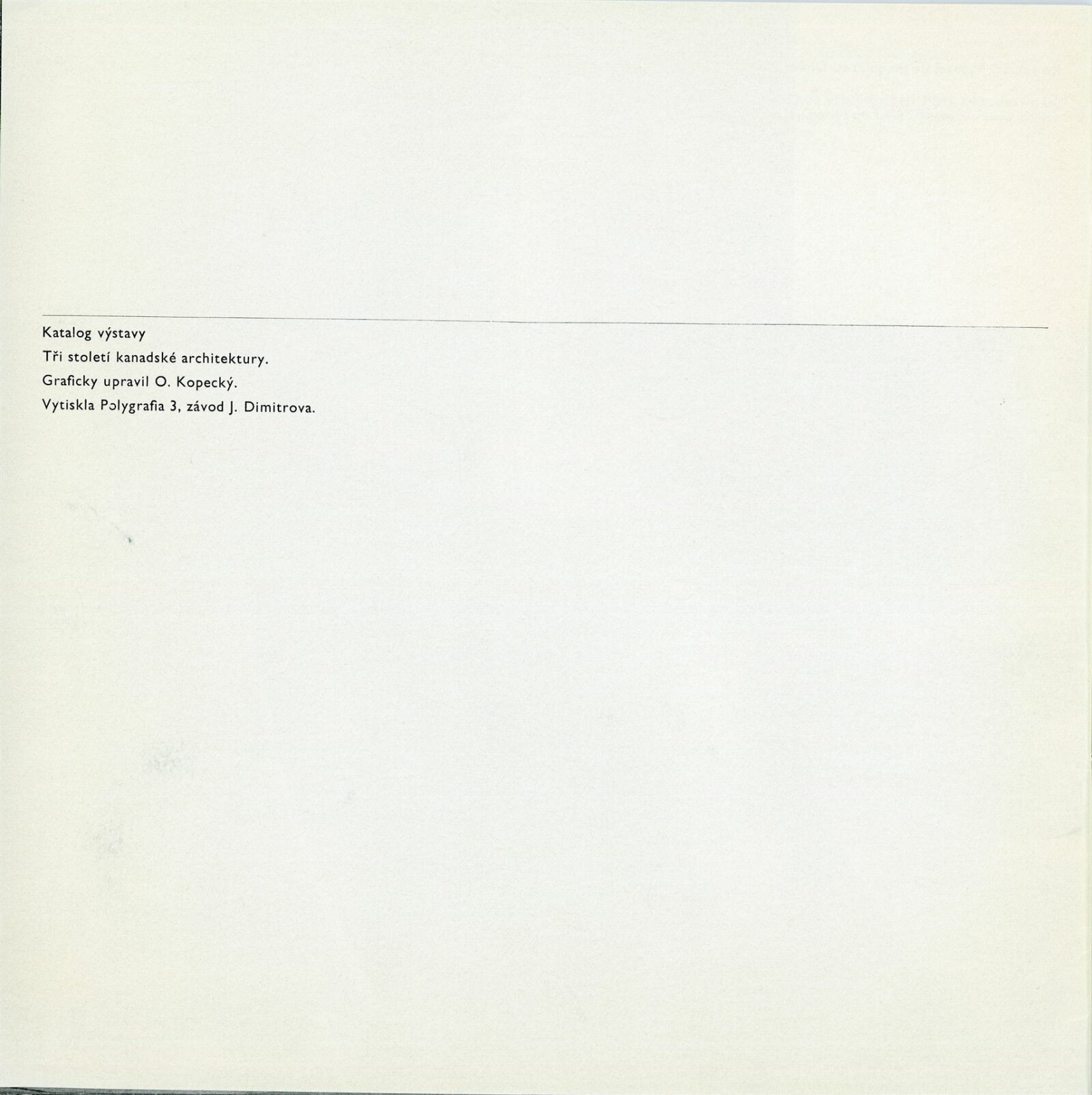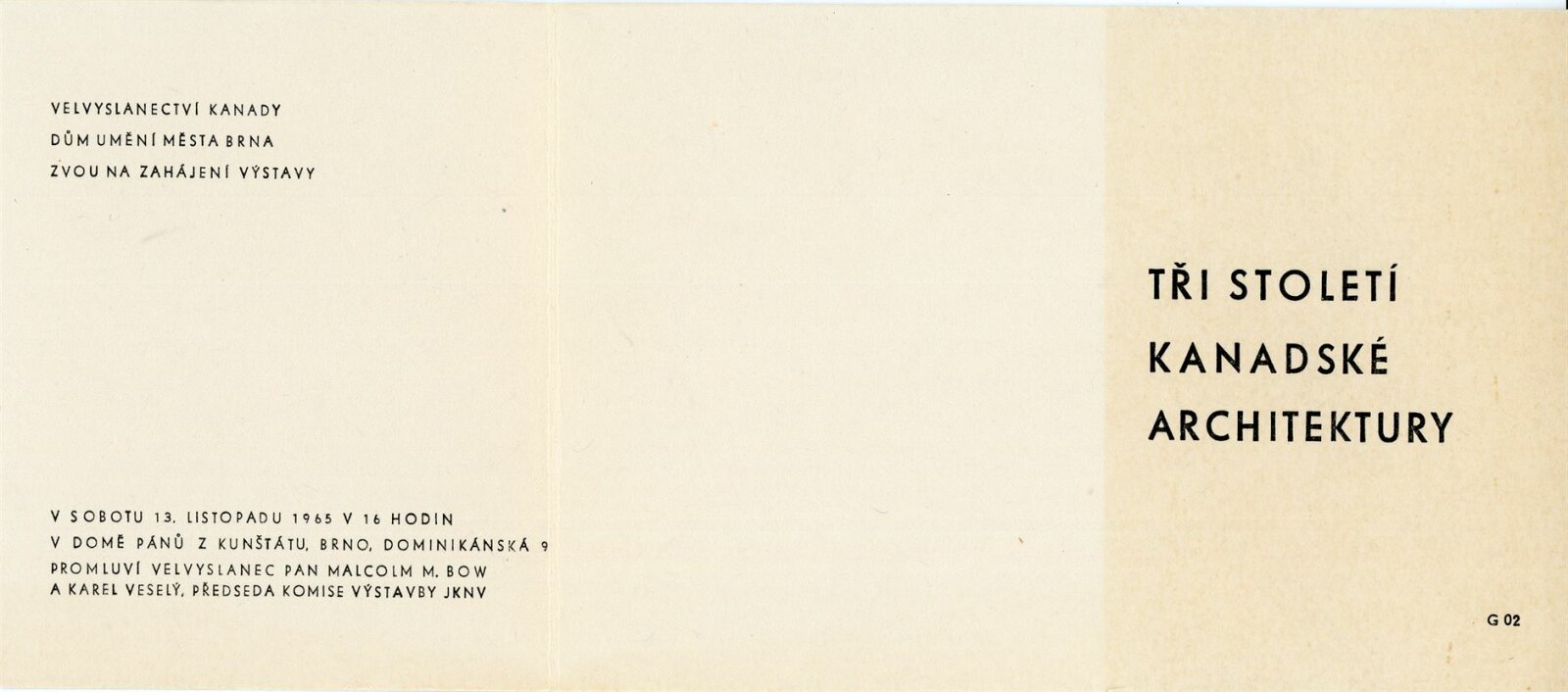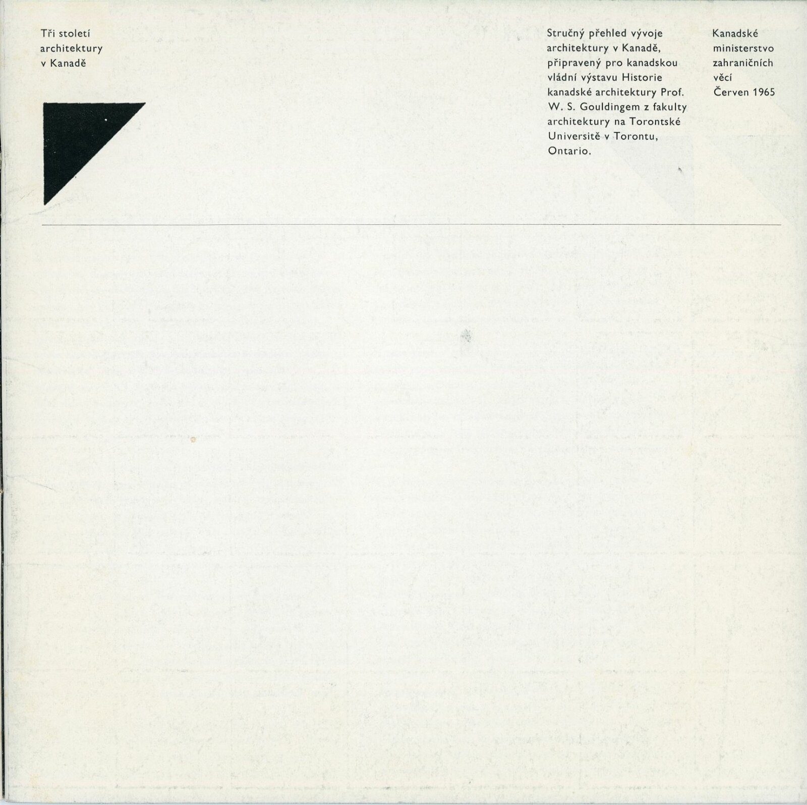 Tři století kanadské architektury: Dům umění města Brna / Dům pánů z Kunštátu, 13. 11. – 12. 12. 1965 / Katalog putovní výstavy. Tři století architektury v Kanadě: Kanadské velvyslanectví, červen / Praha: Kanadské velvyslanectví. – 26 s., obr., stručný přehled vývoje architektury v Kanadě (připravený pro kanadskou vládní výstavu W. S. Gouldingem), DPK 287. – MZK; MG
