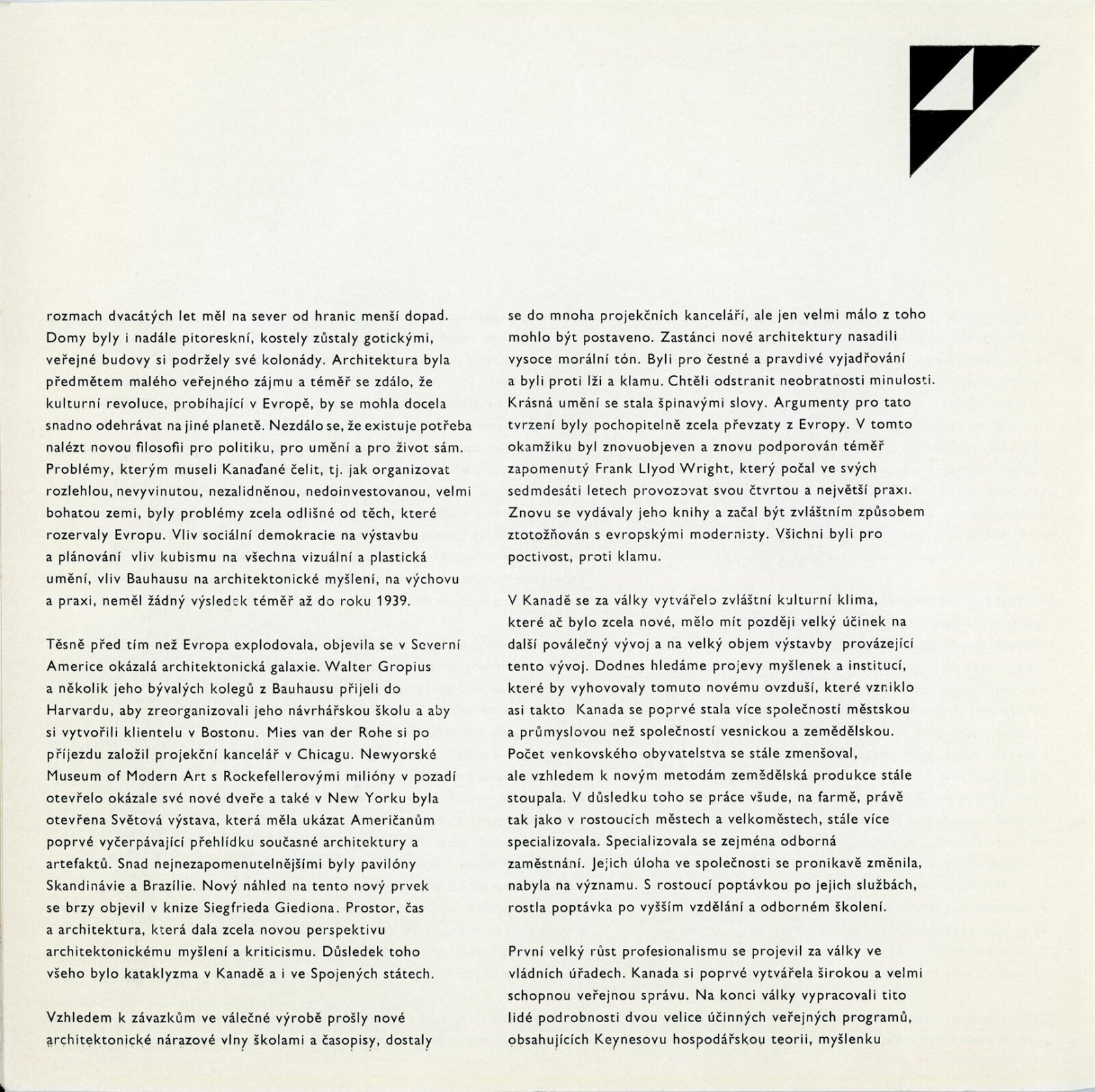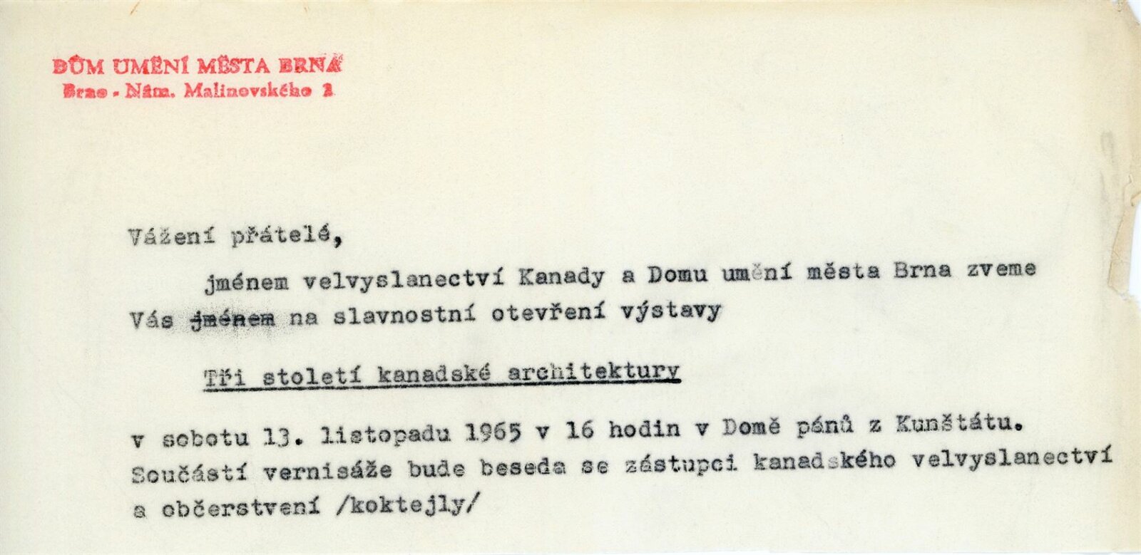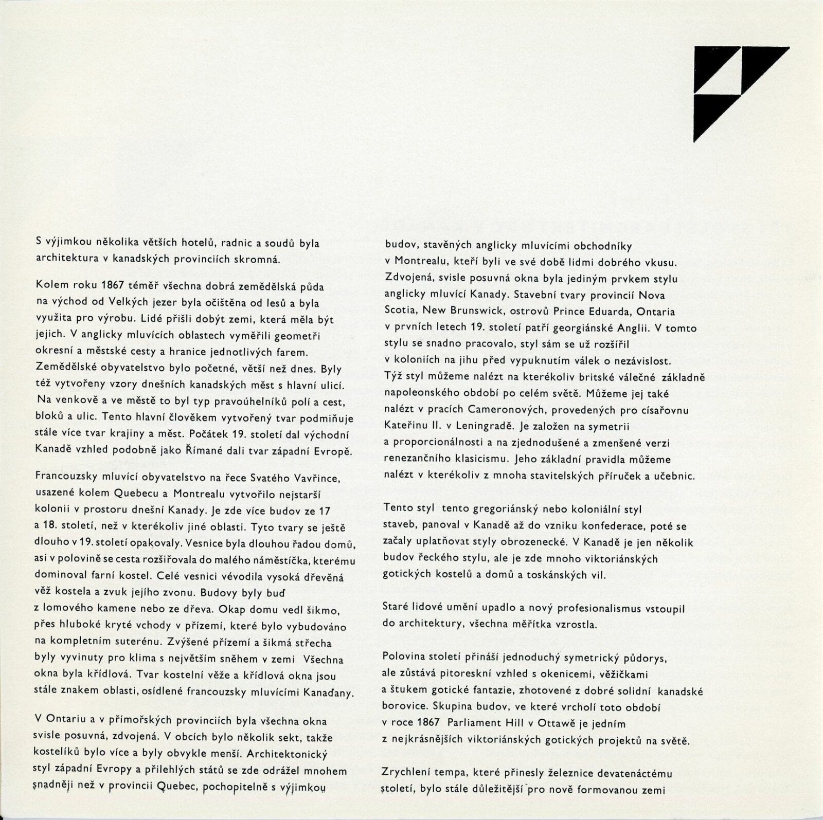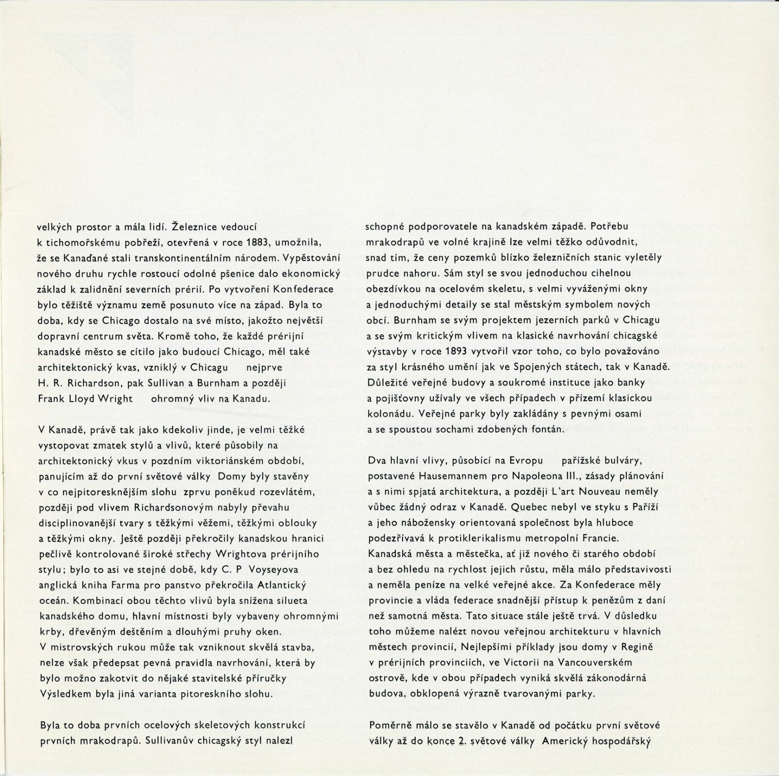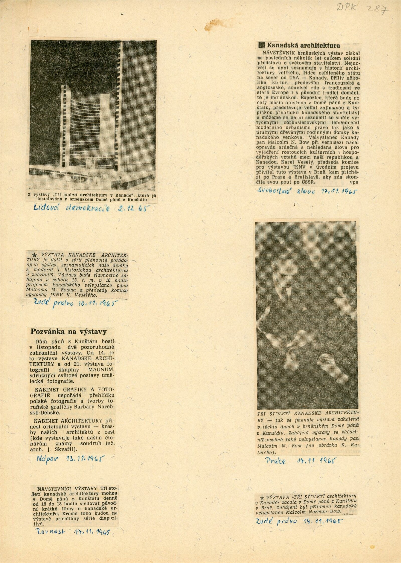 Tři století kanadské architektury: Dům umění města Brna / Dům pánů z Kunštátu, 13. 11. – 12. 12. 1965 / Katalog putovní výstavy. Tři století architektury v Kanadě: Kanadské velvyslanectví, červen / Praha: Kanadské velvyslanectví. – 26 s., obr., stručný přehled vývoje architektury v Kanadě (připravený pro kanadskou vládní výstavu W. S. Gouldingem), DPK 287. – MZK; MG