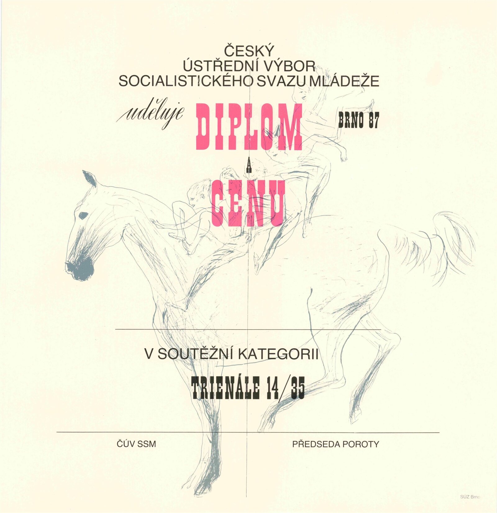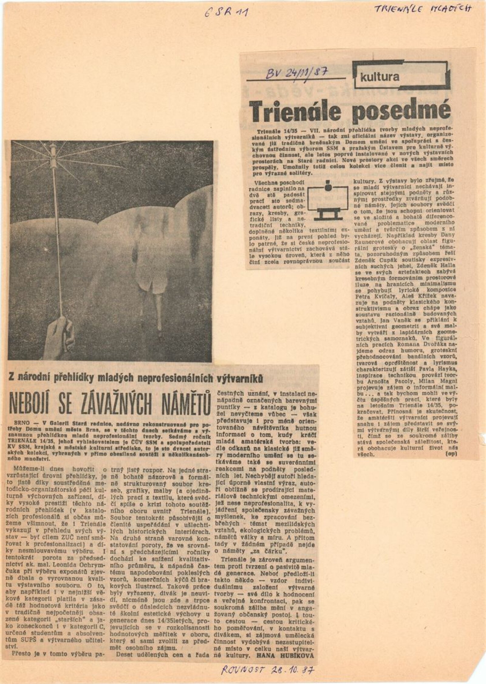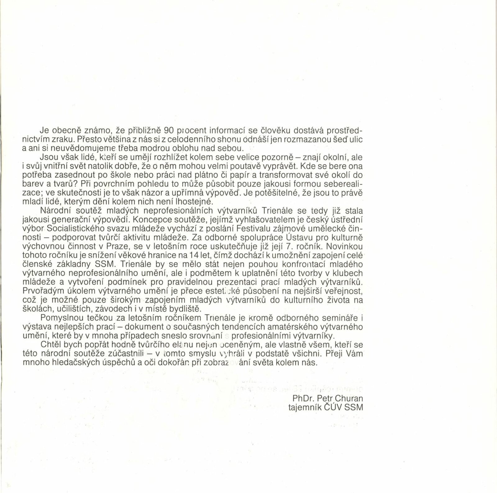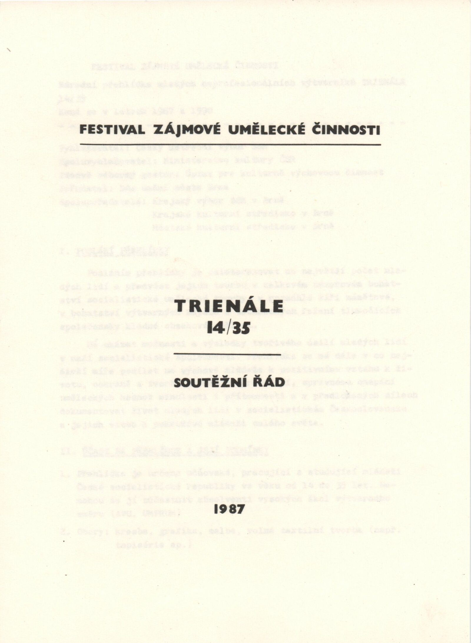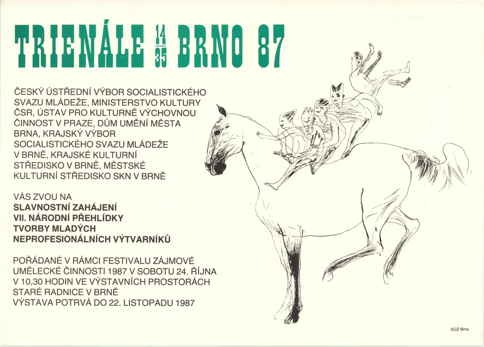 Trienále 14/35. VII. národní přehlídka tvorby mladých neprofesionálních výtvarníků. Brno 87: Galerie Stará radnice, 24. 10. – 22. 11. 1987 / Texty: Petr Churan, Jiří Valoch. – Brno: DUmB, 1987. – [26] s., obr., GSR 11