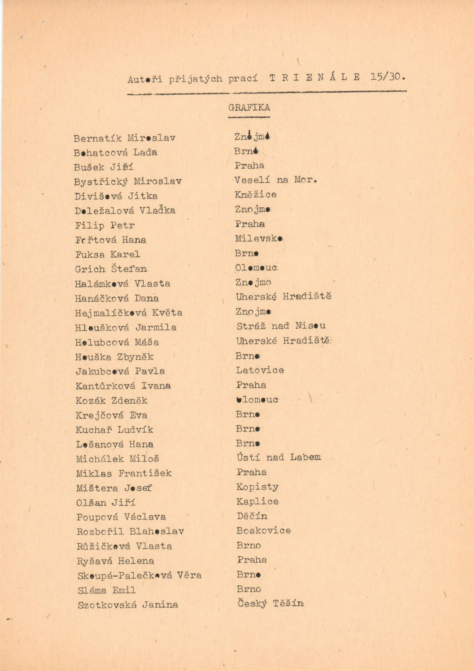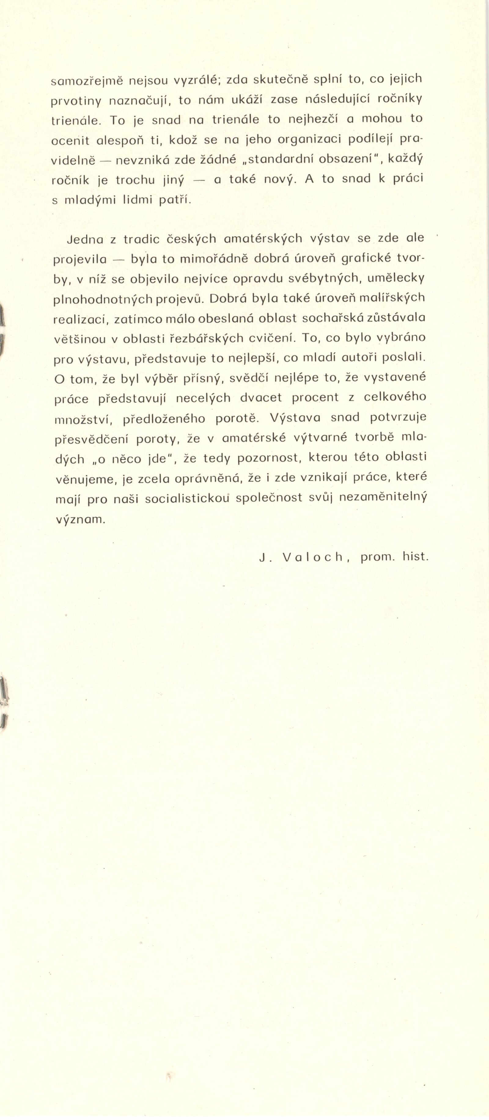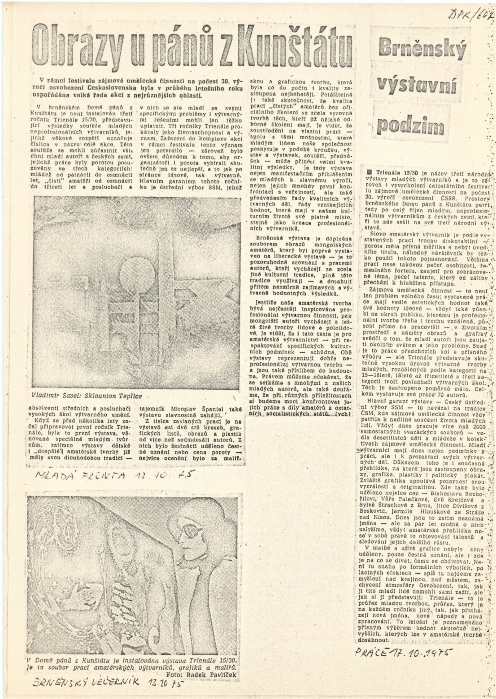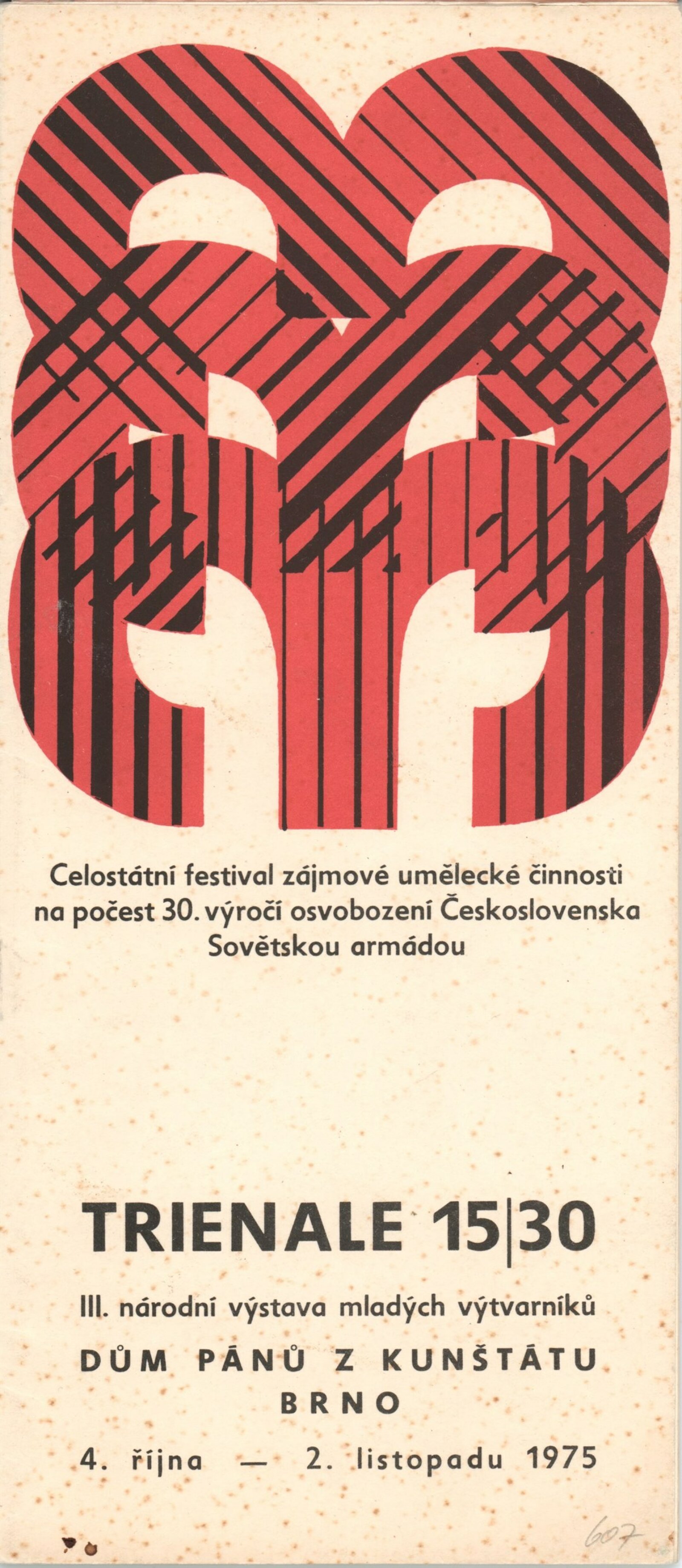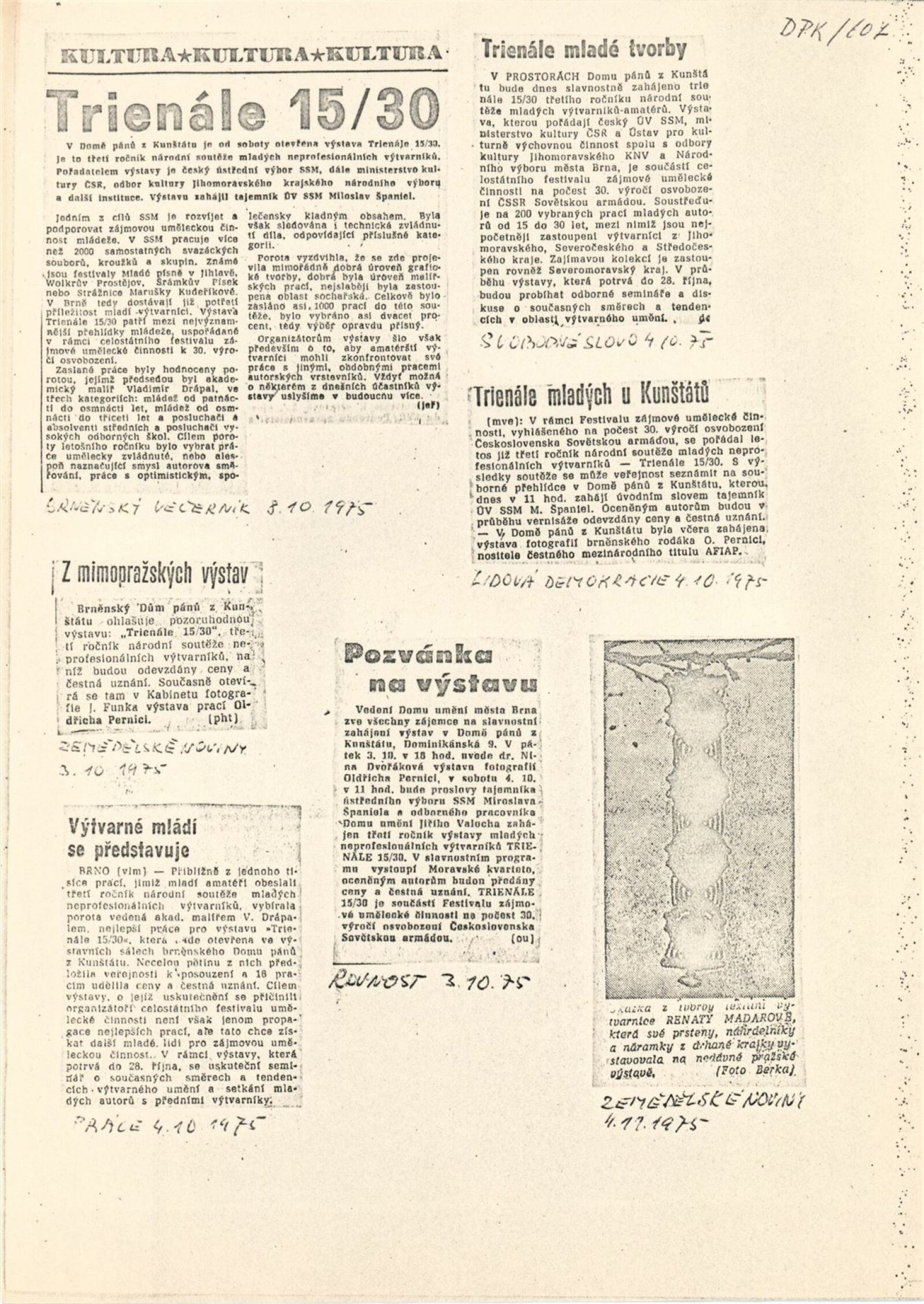 Trienále 15/30. III. národní výstava mladých výtvarníků: Dům umění / Dům pánů z Kunštátu, 4. 10. – 2. 11. 1975 / Texty: Oldřich Janota, Jiří Valoch. – Brno: DUmB, 1975. – 12 s., obr., seznam autorů a prací 12 s., celostátní festival zájmové umělecké činnosti na počest 30. výročí osvobození Československa Sovětskou armádou, DPK 607