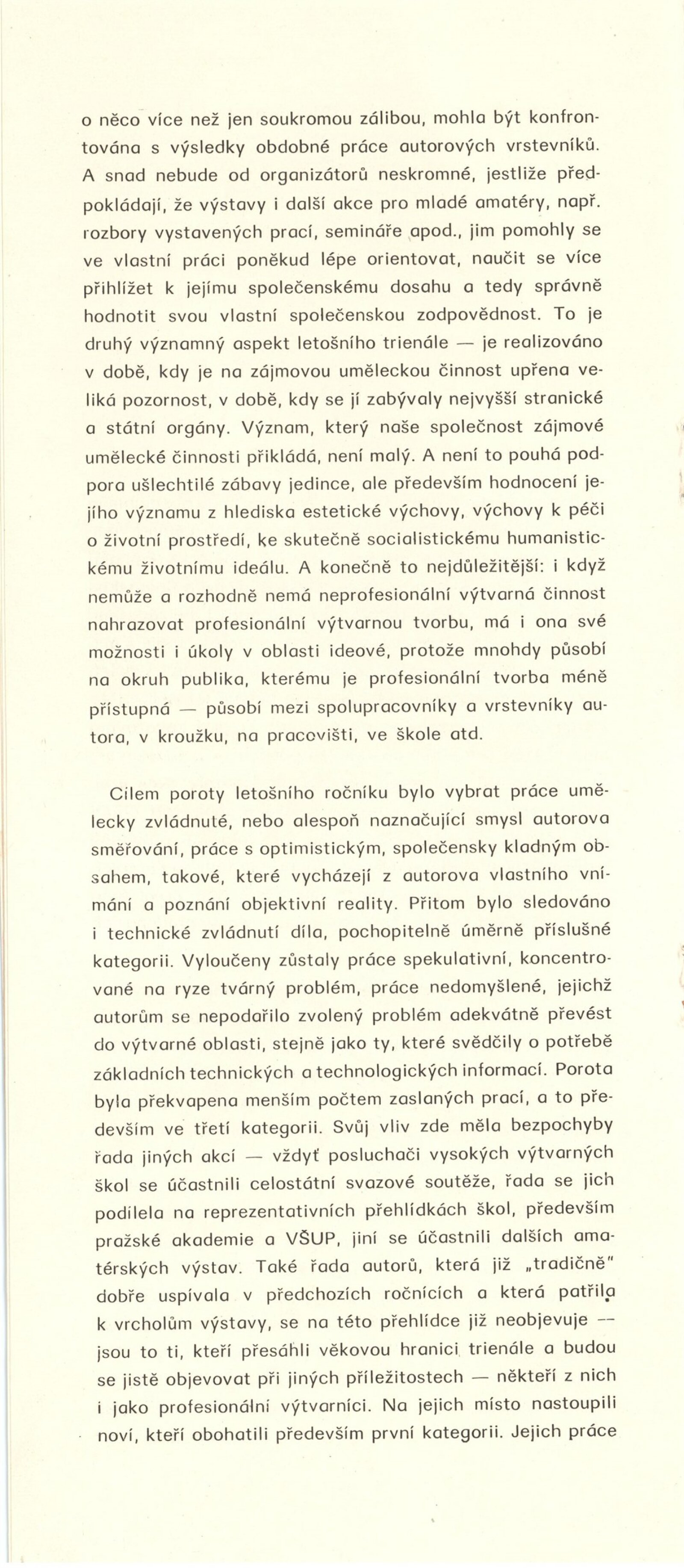 katalog výstavy, soutěžní řád celostátního festivalu zájmové umělecké činnosti, plakát trienále, seznam autorů a děl, ceny a čestná uznání, rezoluce oborového aktivu amatérského výtvarnictví, koncept výstavy, seznam čestných hostů pro pozvánky, prezenční listina tiskové besedy a schůze k trienále, návrh rozpočtu, dohoda o spolupráci na zajištění trienále, zpráva pro tisk, pozvání na tisk. besedu, provozní korespondence (Jiří Valoch a Jiří Rykr), doporučení autorů k účasti na trienále – bianco, žádost o povolení výstavy, recenze v tisku