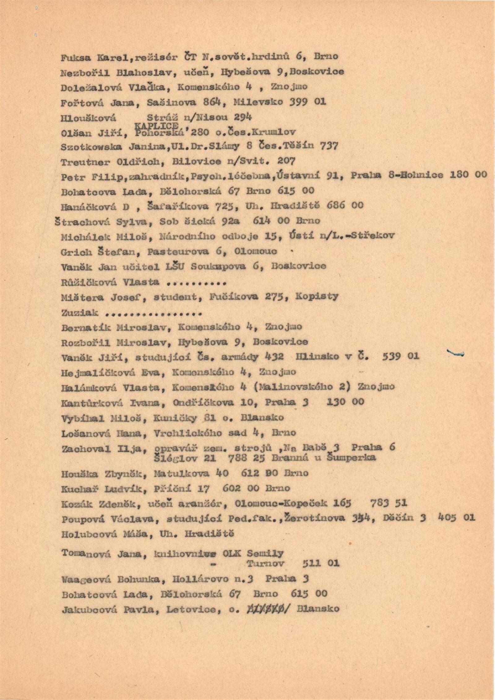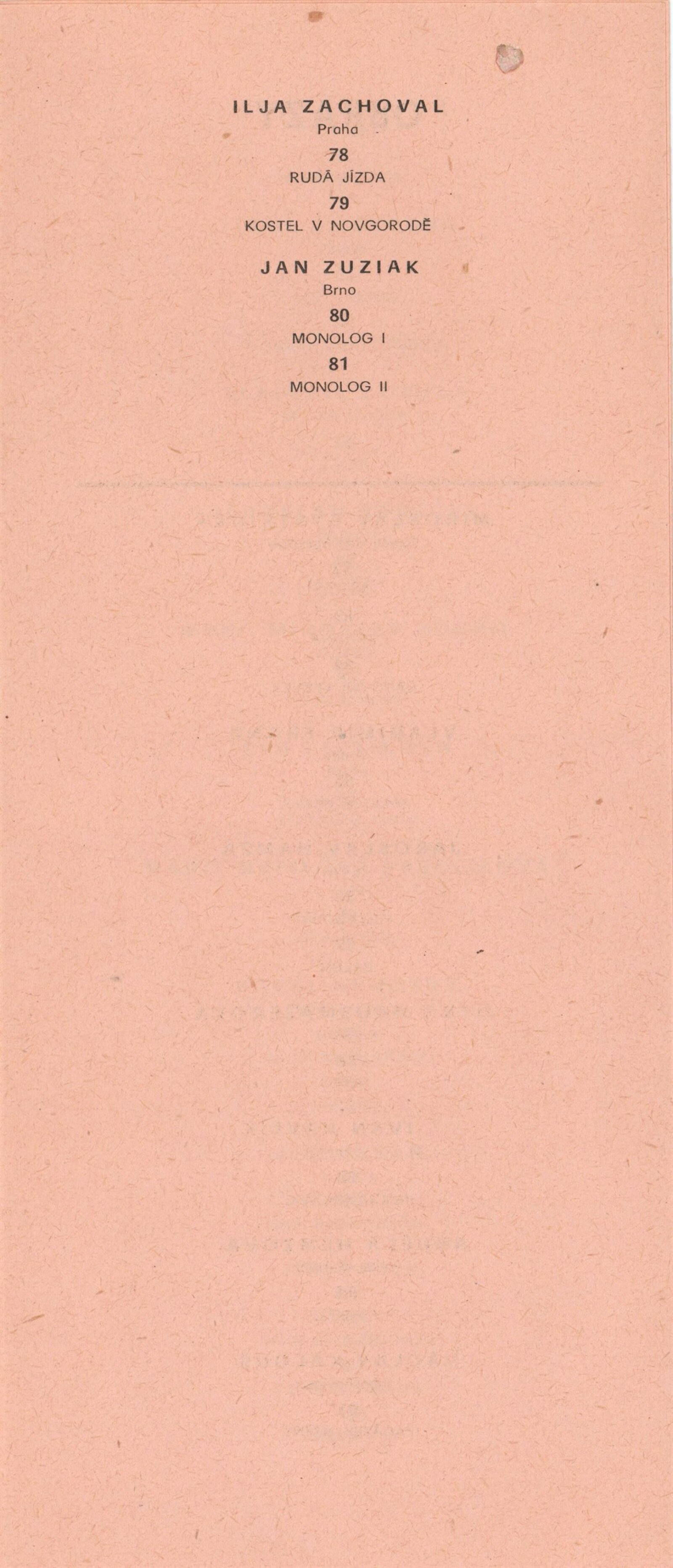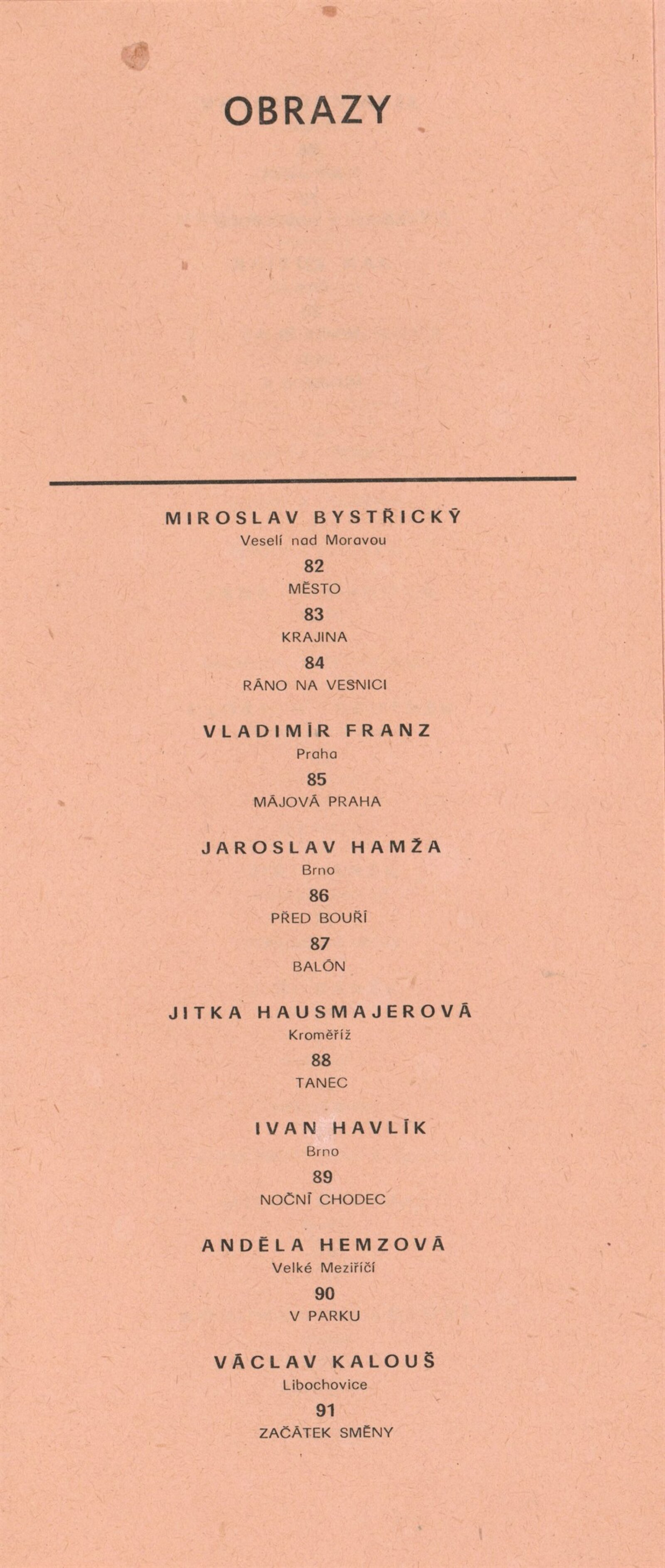 Miroslav Bernatík, Lada Bohatcová, Jiří Bušek, Miroslav Bystřický, Jitka Divišová, Vlaďka Doležalová, Petr Filip, Hana Fořtová, Karel Fuksa, Štefan Grich, Vlasta Halámková, Dana Hanáčková, Eva Hejmalíčková, Jarmila Hloušková, Máša Holubcová, Zbyněk Houška, Pavla Jakubcová, Ivana Kantůrková, Zdeněk Kozák, Eva Krejčová, Ludvík Kuchař, Hana Lošanová, Miloš Michálek, František Miklas, Josef Mištera, Jiří Olšan, Václava Poupová, Blahoslav Rozbořil, Vlasta Růžičková, Helena Ryšavá, Věra Skoupá-Palečková, Emil Sláma, Janina Szotkowská, Vladimír Šavel, Václava Šrůtková, Sylva Štrachová, Jana Tomanová, Oldřich Treutner, Jiří Vaněk, Miloš Vybíhal, Bohunka Waagerová, Ilja Zachoval, Jan Zuziak, Vladimír Franz, Jaroslav Hamža, Jitka Hausmajerová, Ivan Havlík, Anděla Hemzová, Václav Kalouš, Roman Karpaš, Jana Kmentová, Vladimír Kodrla, Jaroslav Koreček, Miroslav Koupil, Eva Leštinová, Marie Nepilová-Preclíková, Pavel Novotný, Jiří Olšan, Jiří Pátík, Karel Pavlikovský, Karel Rechlík, Veronika Richterová, Josef Škrášek, Richard Šmarda, Oldřich Toman, Olga Weidenthalerová, Josef Pancurák, Petra Rokosová, Eva Kučerová