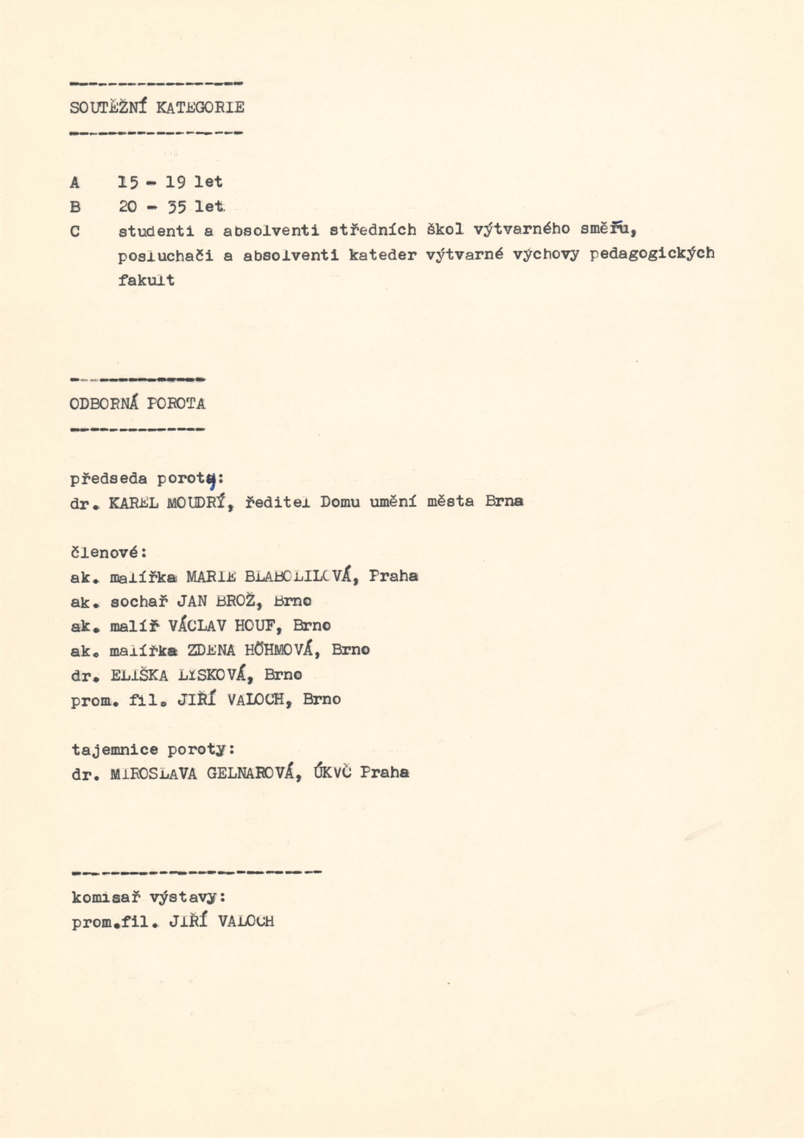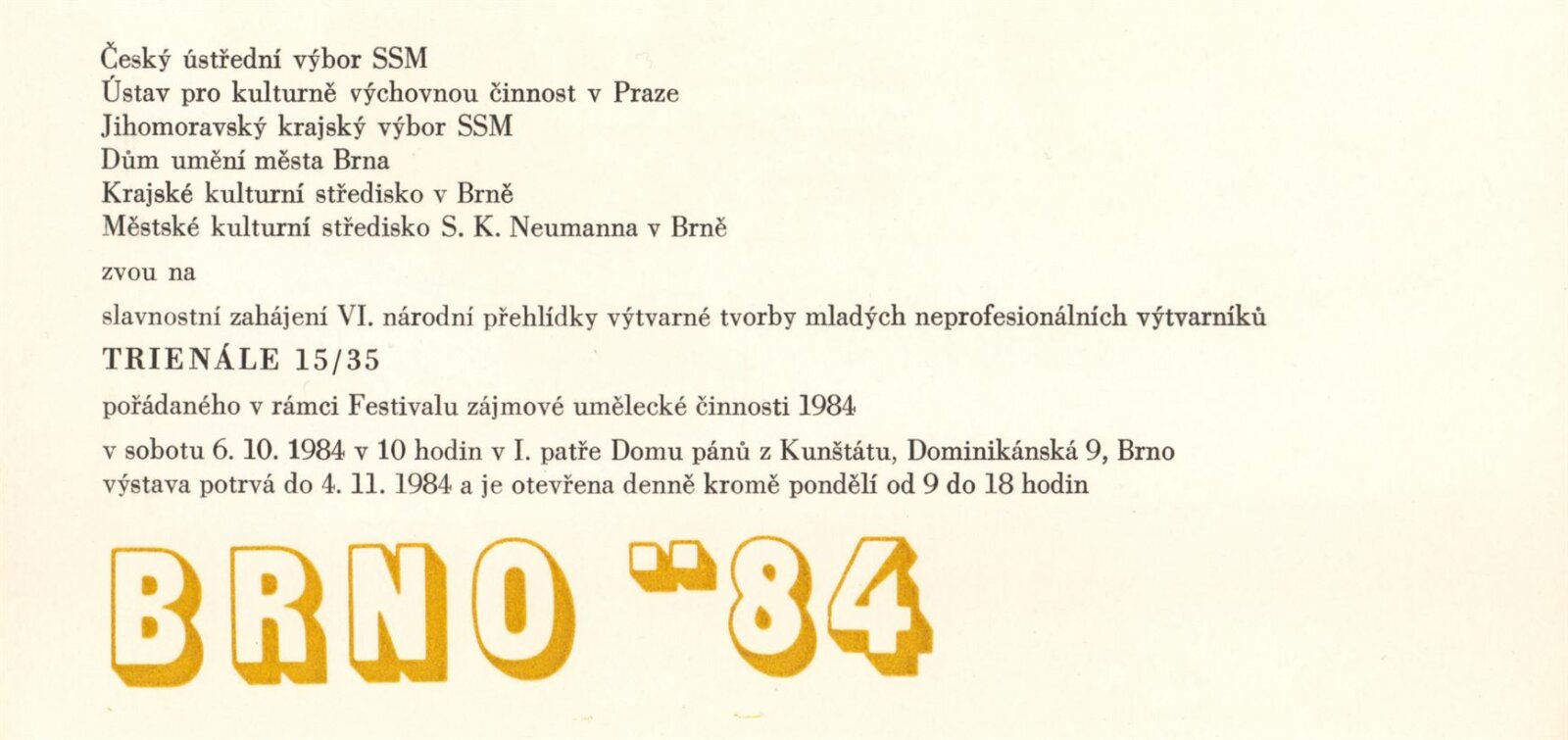 Trienále 15/35. VI. národní přehlídka výtvarné tvorby mladých neprofesionálních výtvarníků Brno 1984: Dům umění / Dům pánů z Kunštátu, 6. 10. – 4. 11. 1984 / Texty: Jaroslav Koutný, Jiří Valoch. – Brno: DUmB, 1984. – 33 s., obr., DPK 827. – MZK; MG; MMB