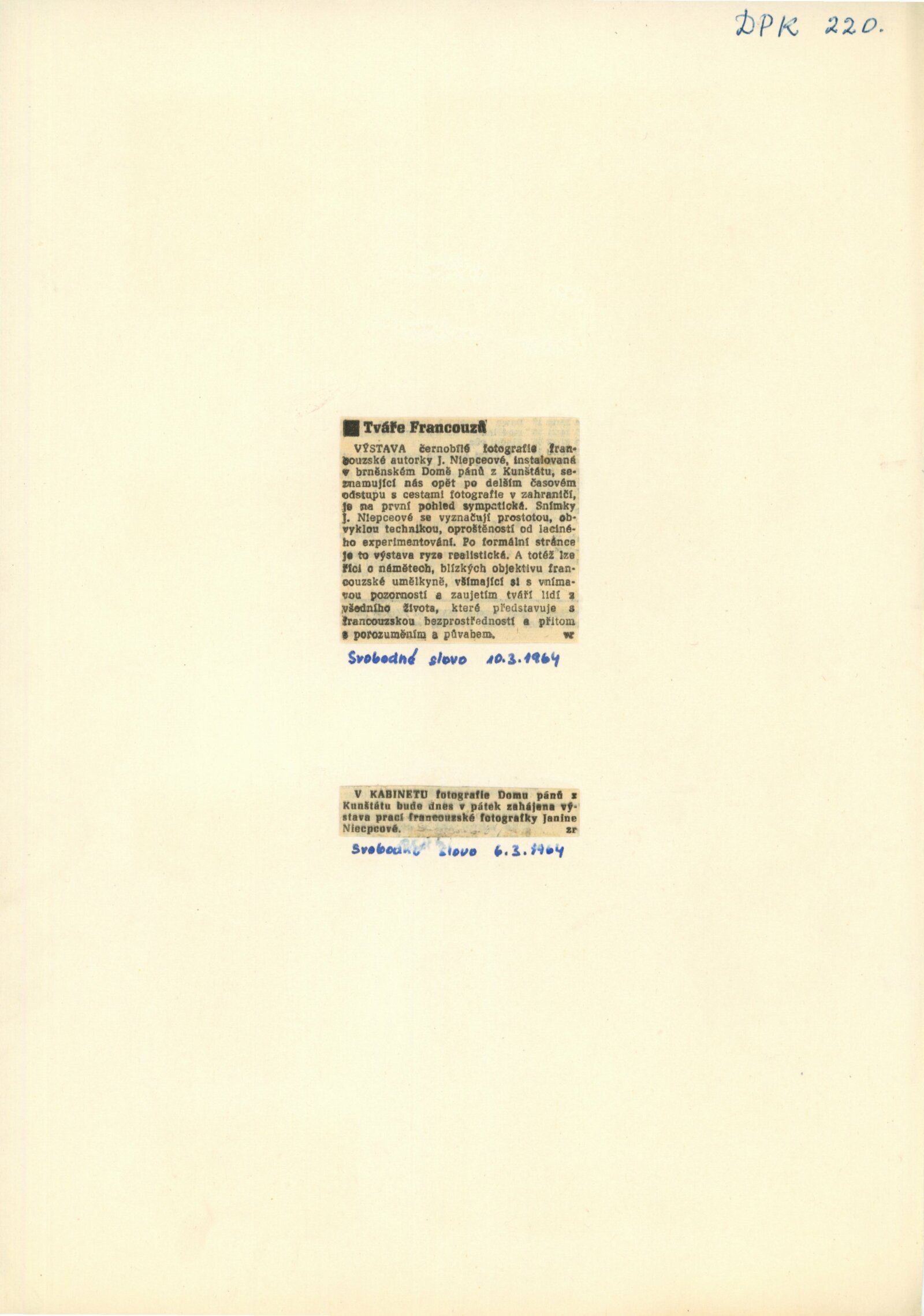 společná pozvánka DPK 219–221, medailon umělkyně, strojopis, seznam vystavených děl, korespondence (o realizaci výstavy – Československá společnost pro mezinárodní styky, předání výstav do Galerie umění Karlovy Vary), provozní korespondence, recenze v tisku