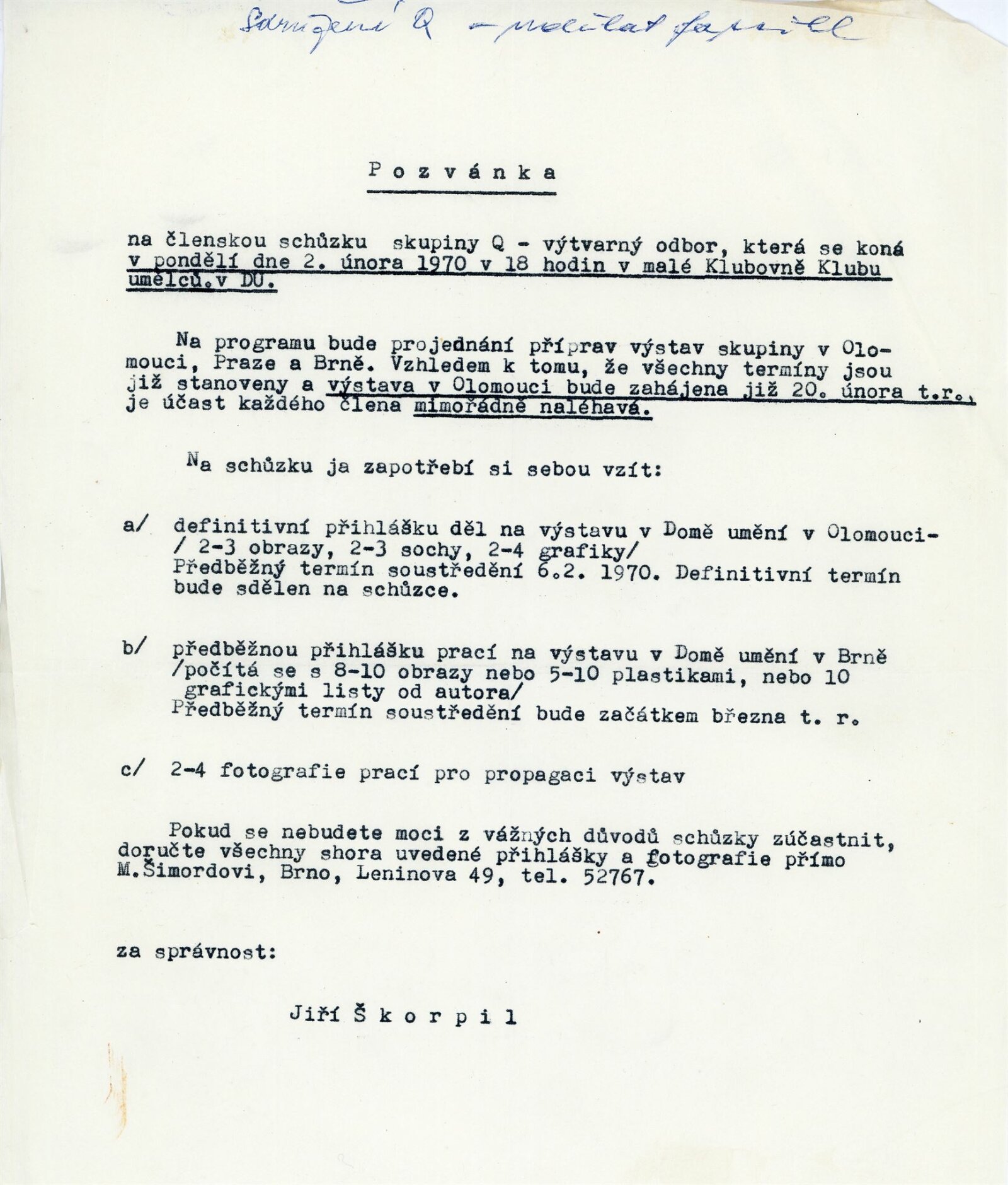 pozvánka, fotografie z vernisáže a výstavy, plakát na podvečery „Q“, smlouva Domu umění s vystavovatelem, informační zprávy o výstavě a podvečerech „Q“ z Domu umění, úvodní slovo k výstavě, pozvánka na členskou schůzku sdružení „Q“, oběžníky skupiny „Q“, programy podvečerů „Q“