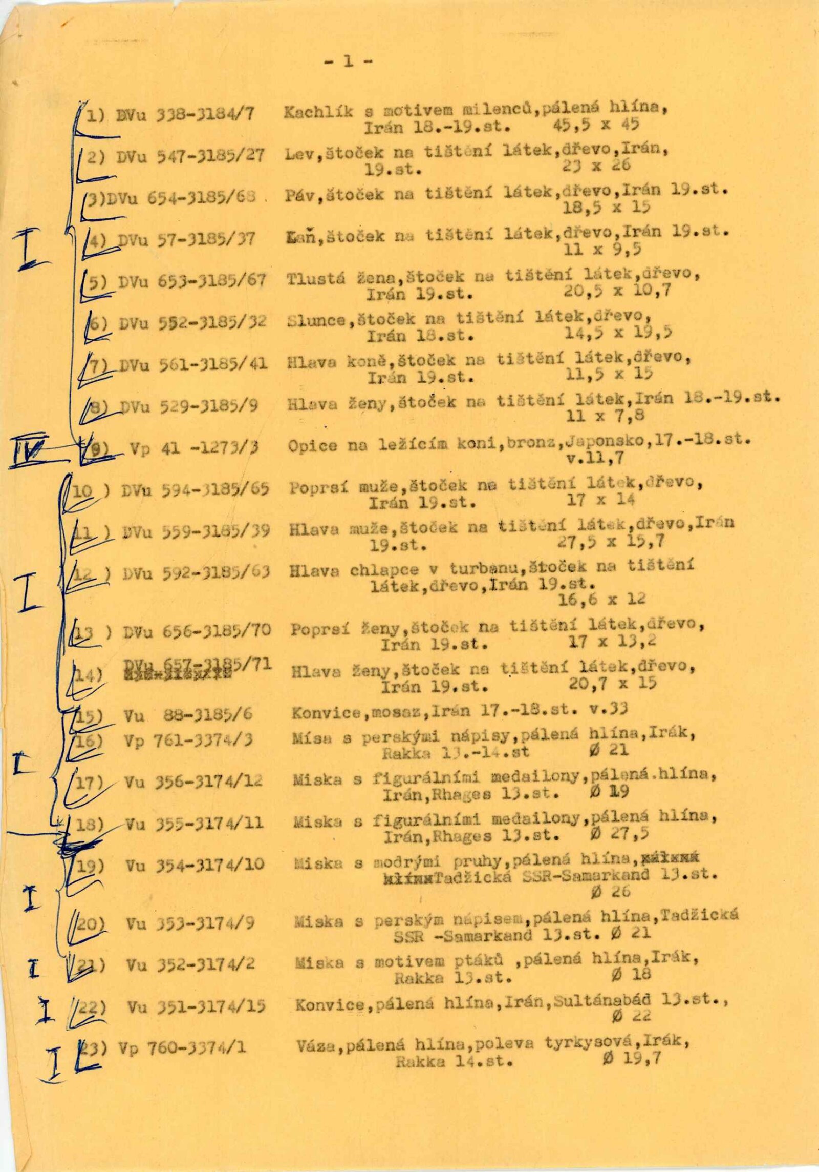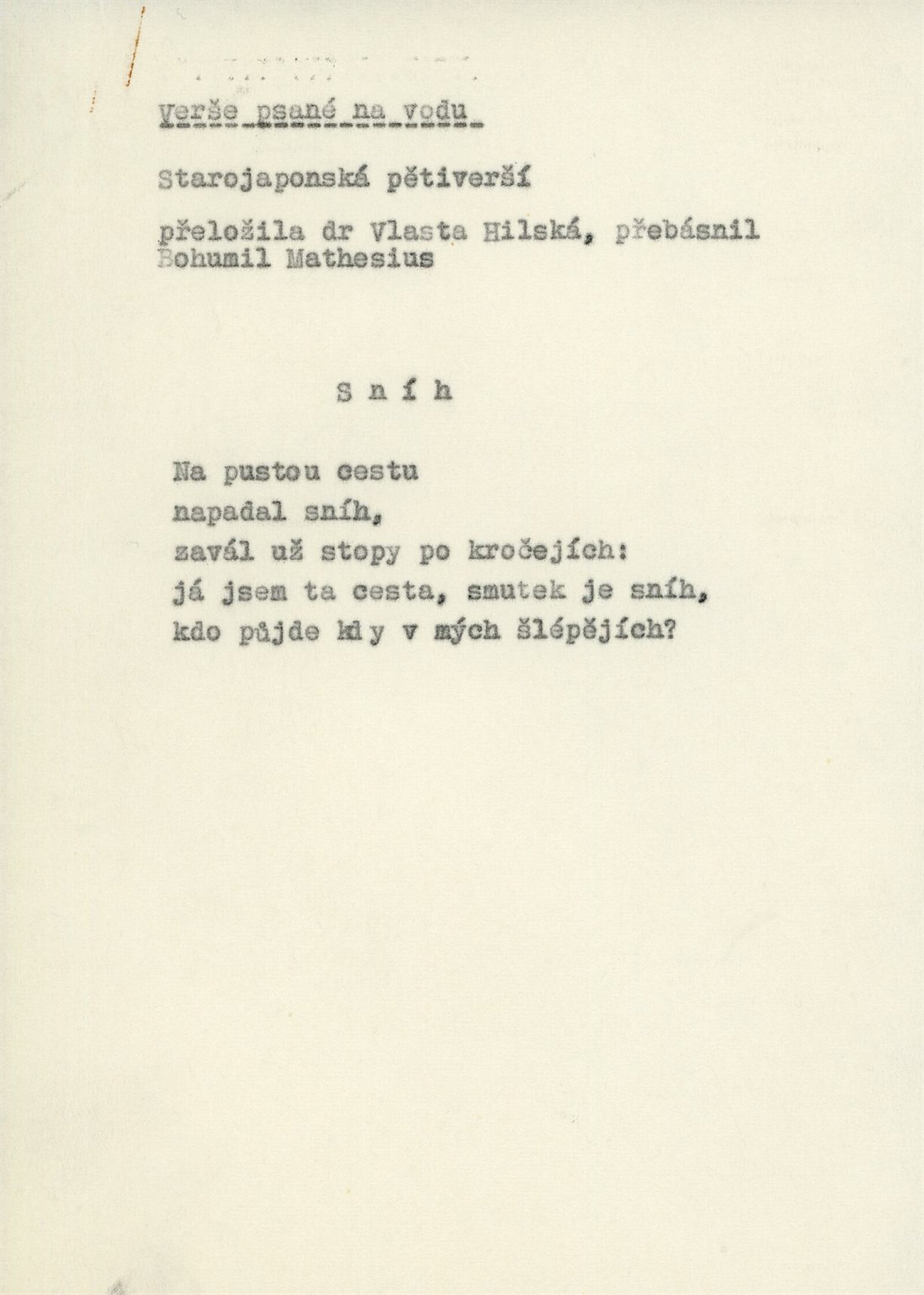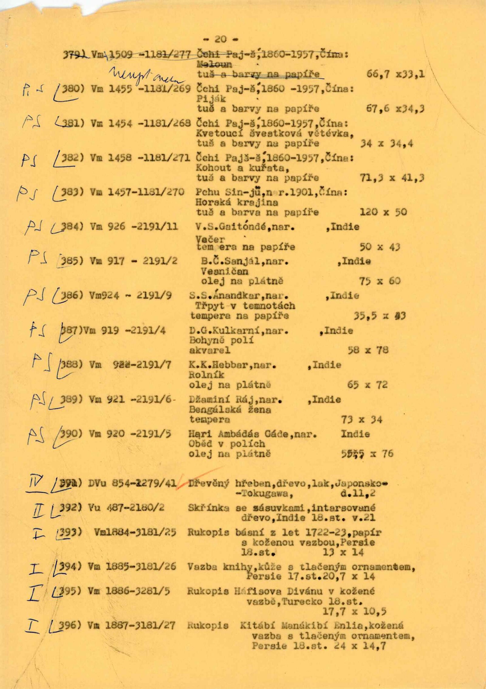 katalog, strojopis Verše psané na vodu, text katalogu, soupis exponátů s rozvržením pro instalaci výstavy, fotografie exponátů a instalace, žádost o povolení výstavy, korespondence (s Náprstkovým muzeem, poděkování řediteli NG J. Kroftovi), seznam pozvaných zemí, dokumentace o instalačním zařízení, reverzy, recenze v tisku