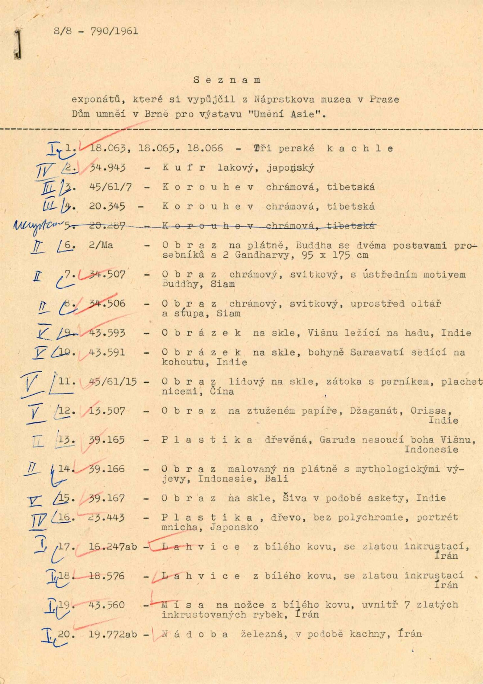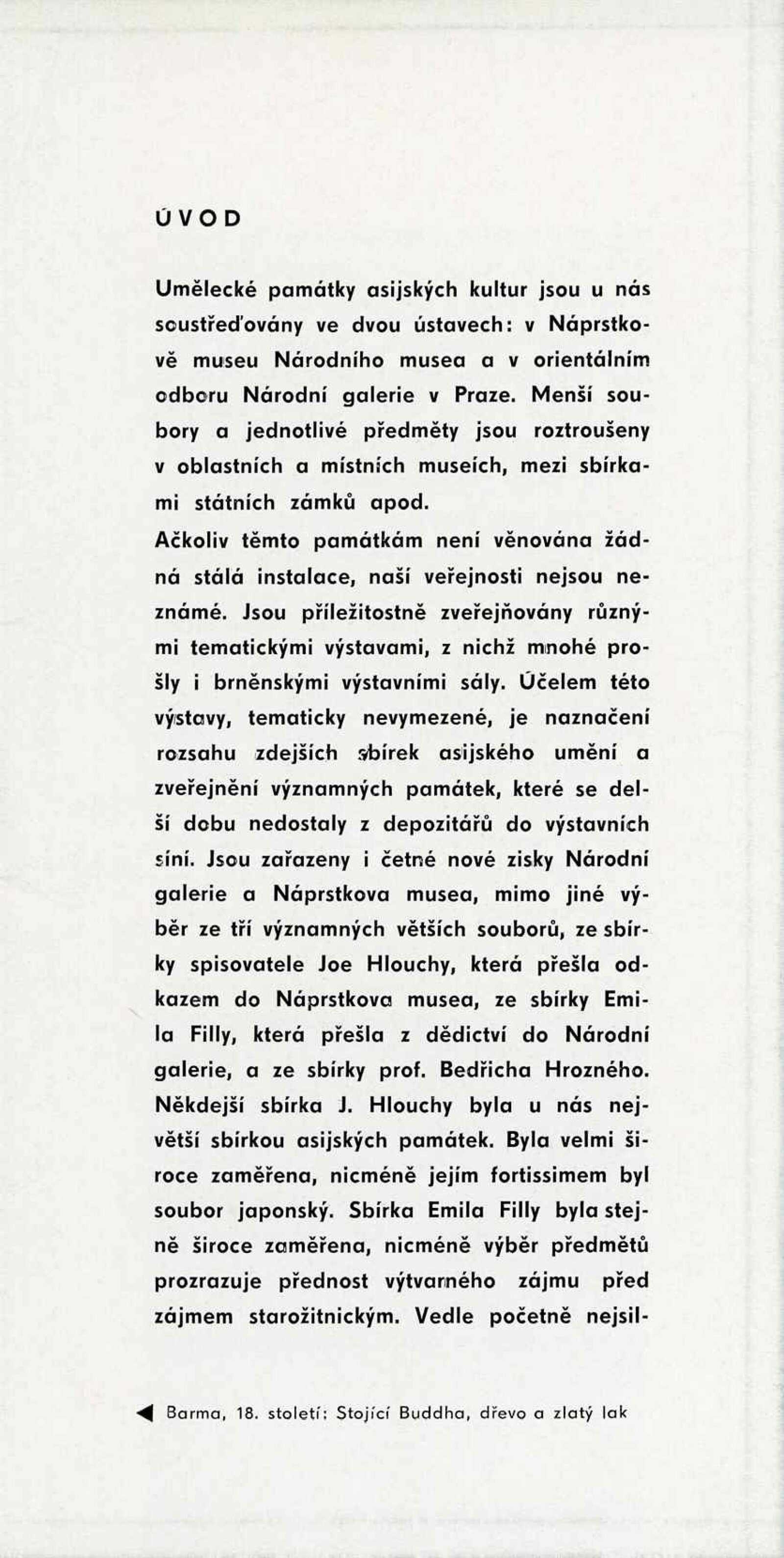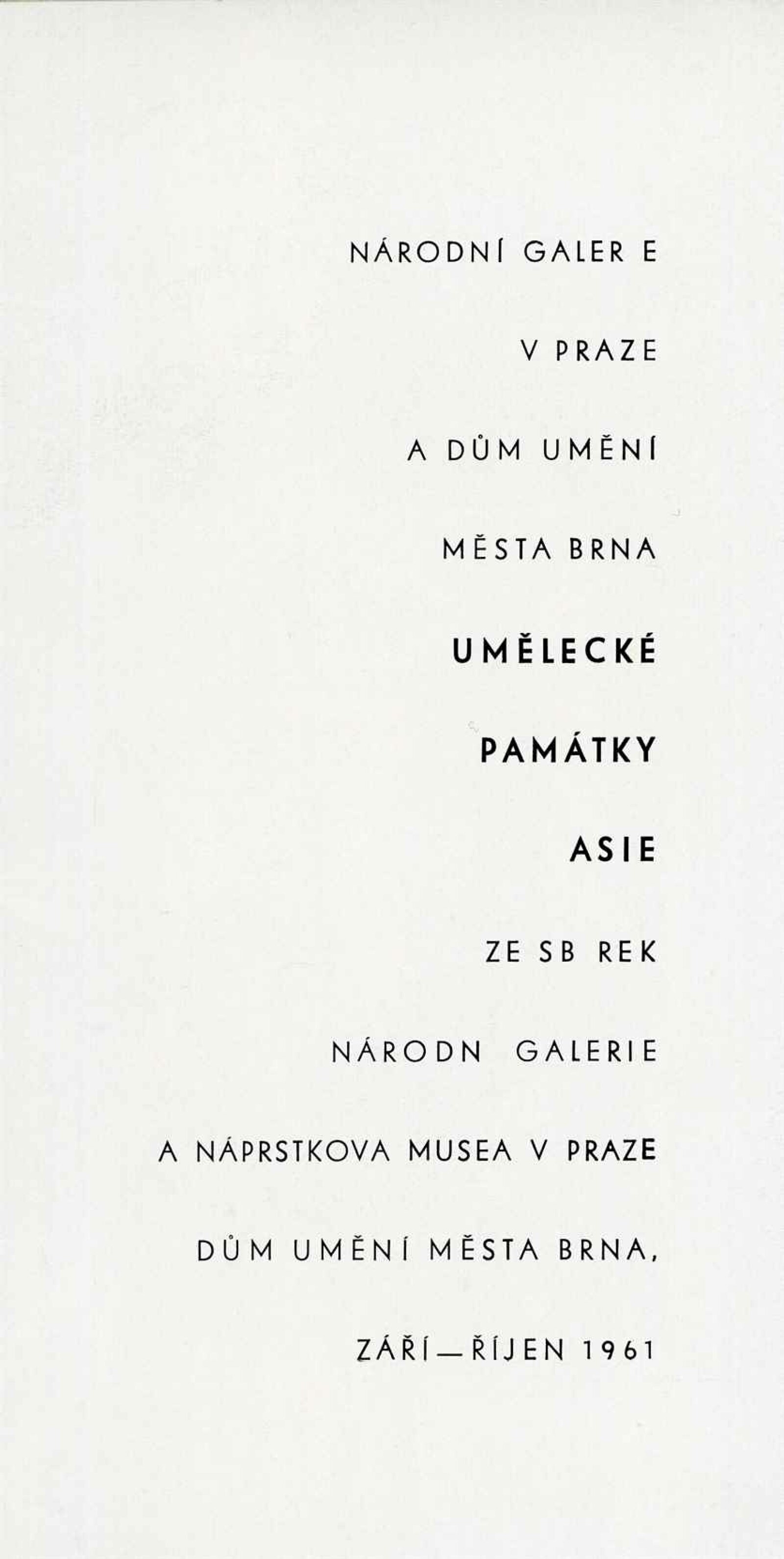 Umělecké památky Asie ze sbírek Národní galerie a Náprstkova musea v Praze: Dům umění města Brna, 3. 9. – 22. 10. 1961 / Text: Lubor Hájek. – Brno: DUmB, 1961. – 16 s., obr., DU 400. – MG