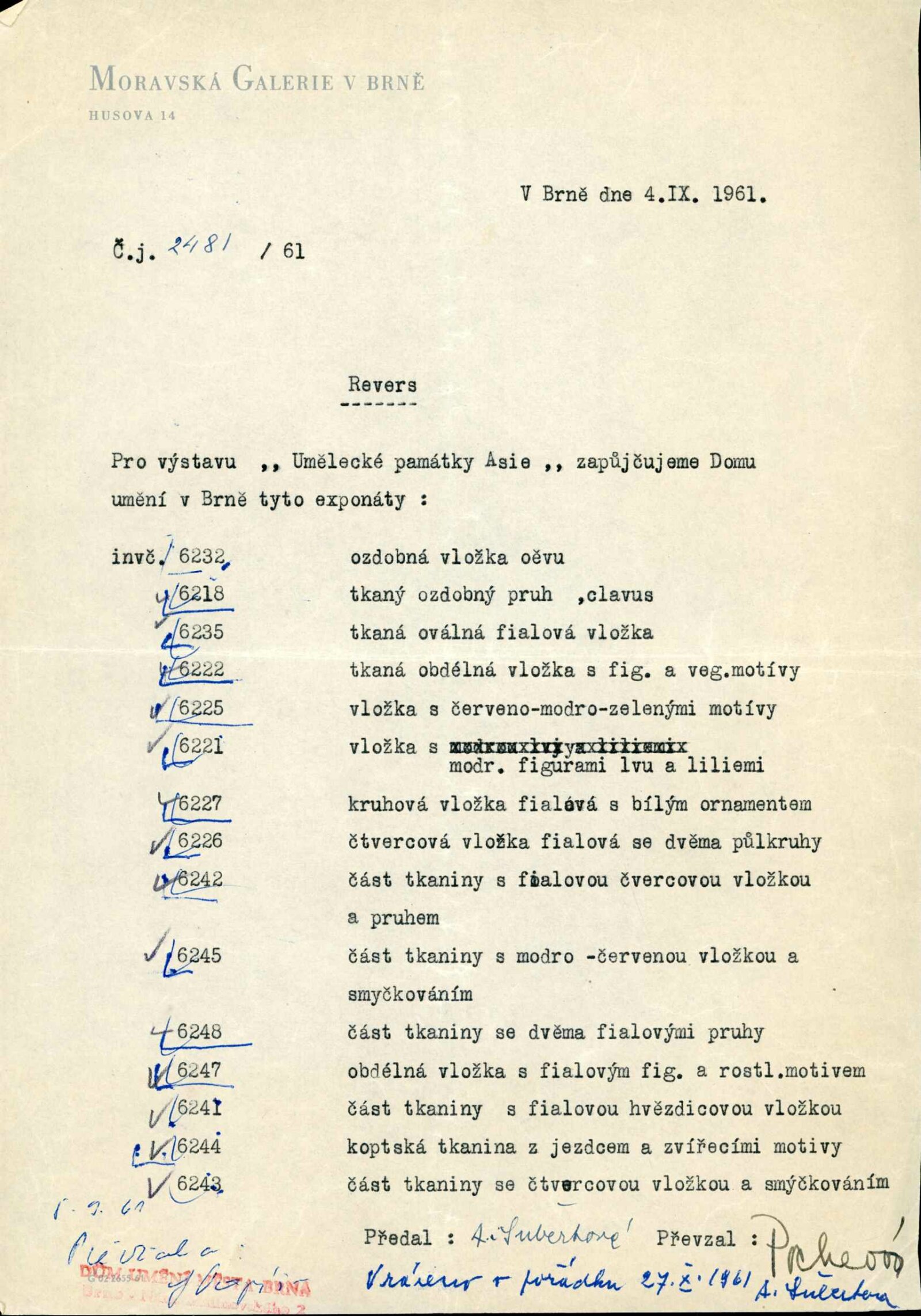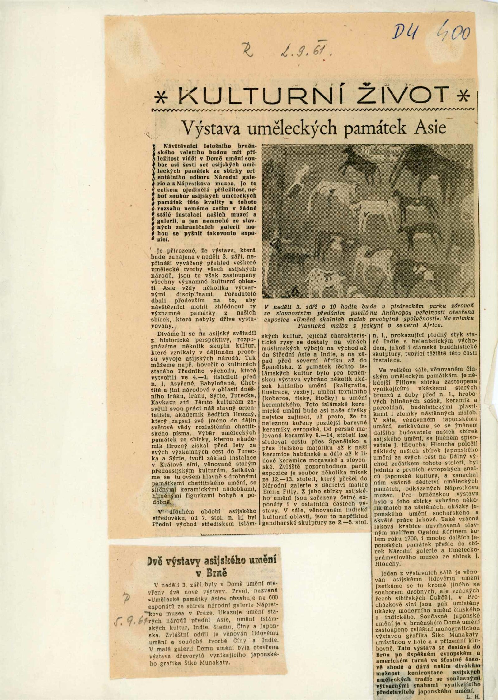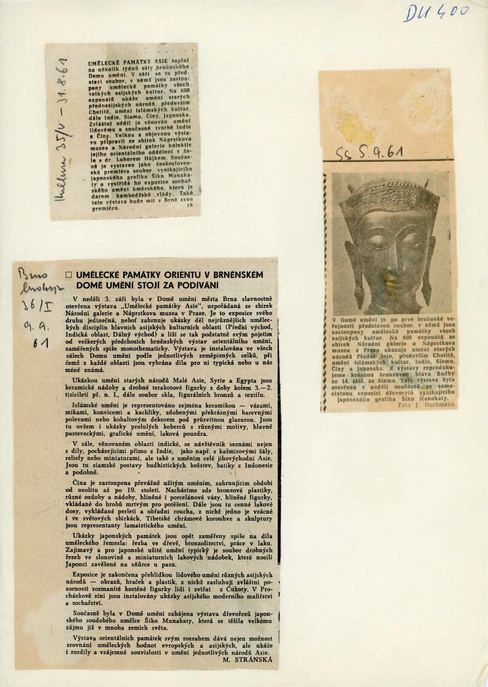 Umělecké památky Asie ze sbírek Národní galerie a Náprstkova musea v Praze: Dům umění města Brna, 3. 9. – 22. 10. 1961 / Text: Lubor Hájek. – Brno: DUmB, 1961. – 16 s., obr., DU 400. – MG