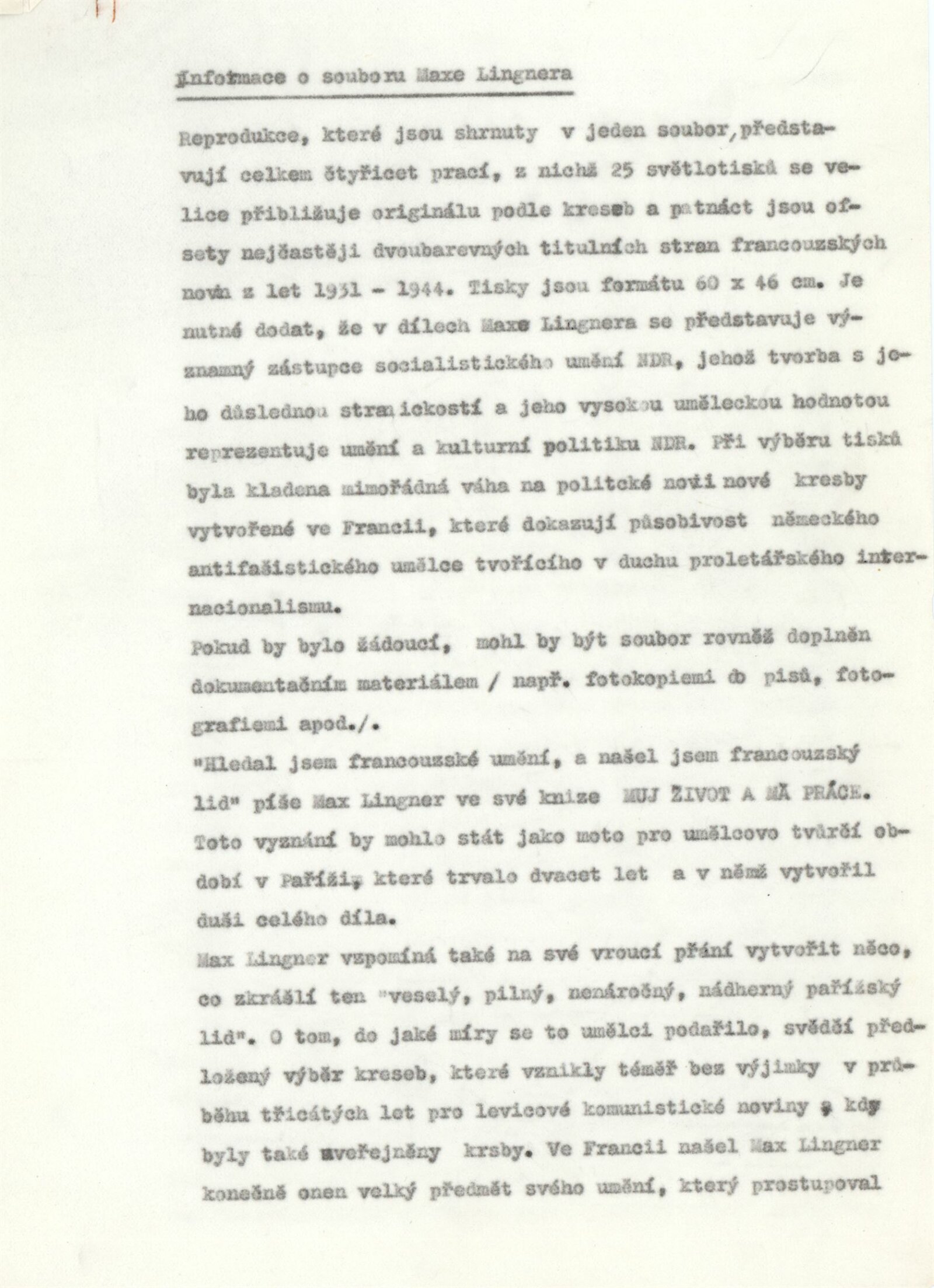 pozvánka, text o výstavě Umělecké poklady muzeí a galerií, informace o souboru Maxe Lingnera, provozní korespondence (Kulturní a informační středisko NDR), žádost o povolení výstavy
