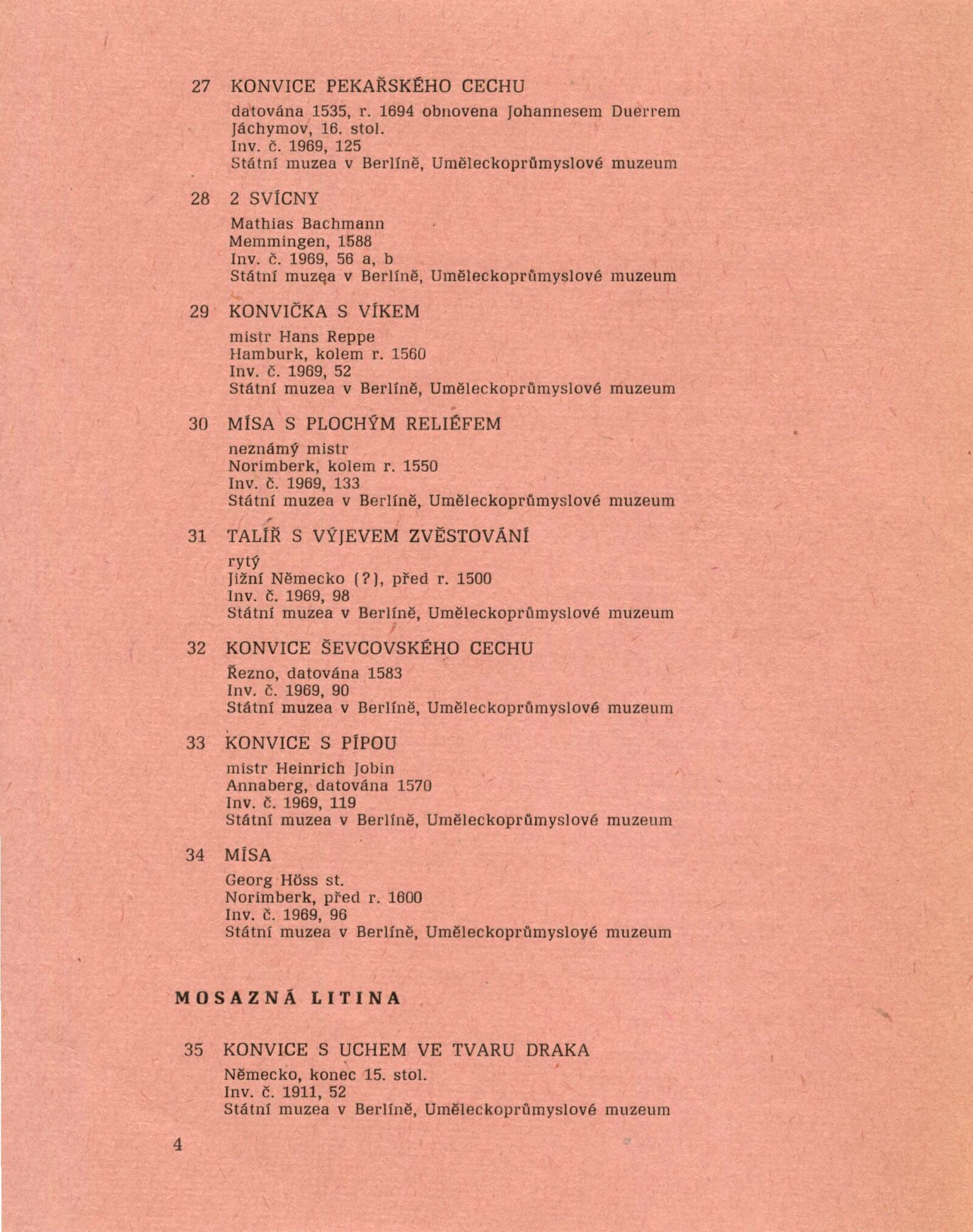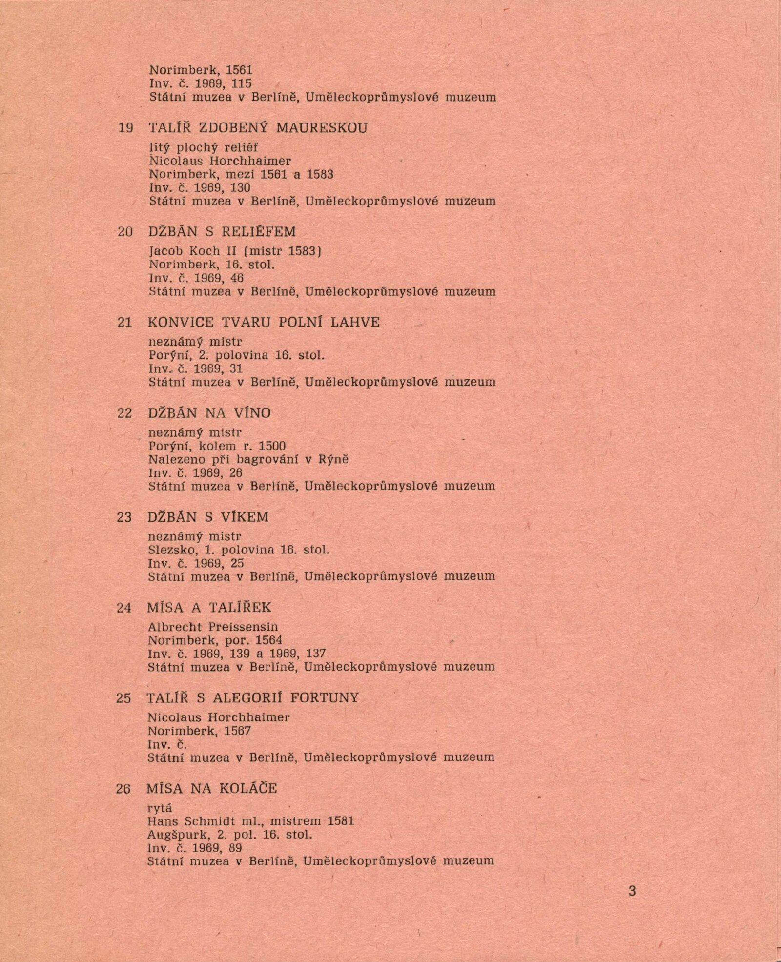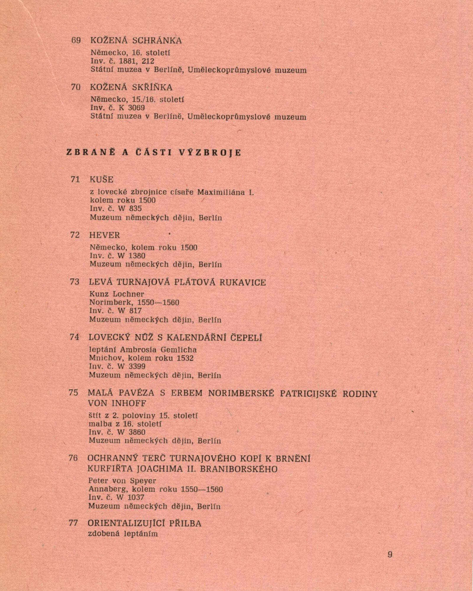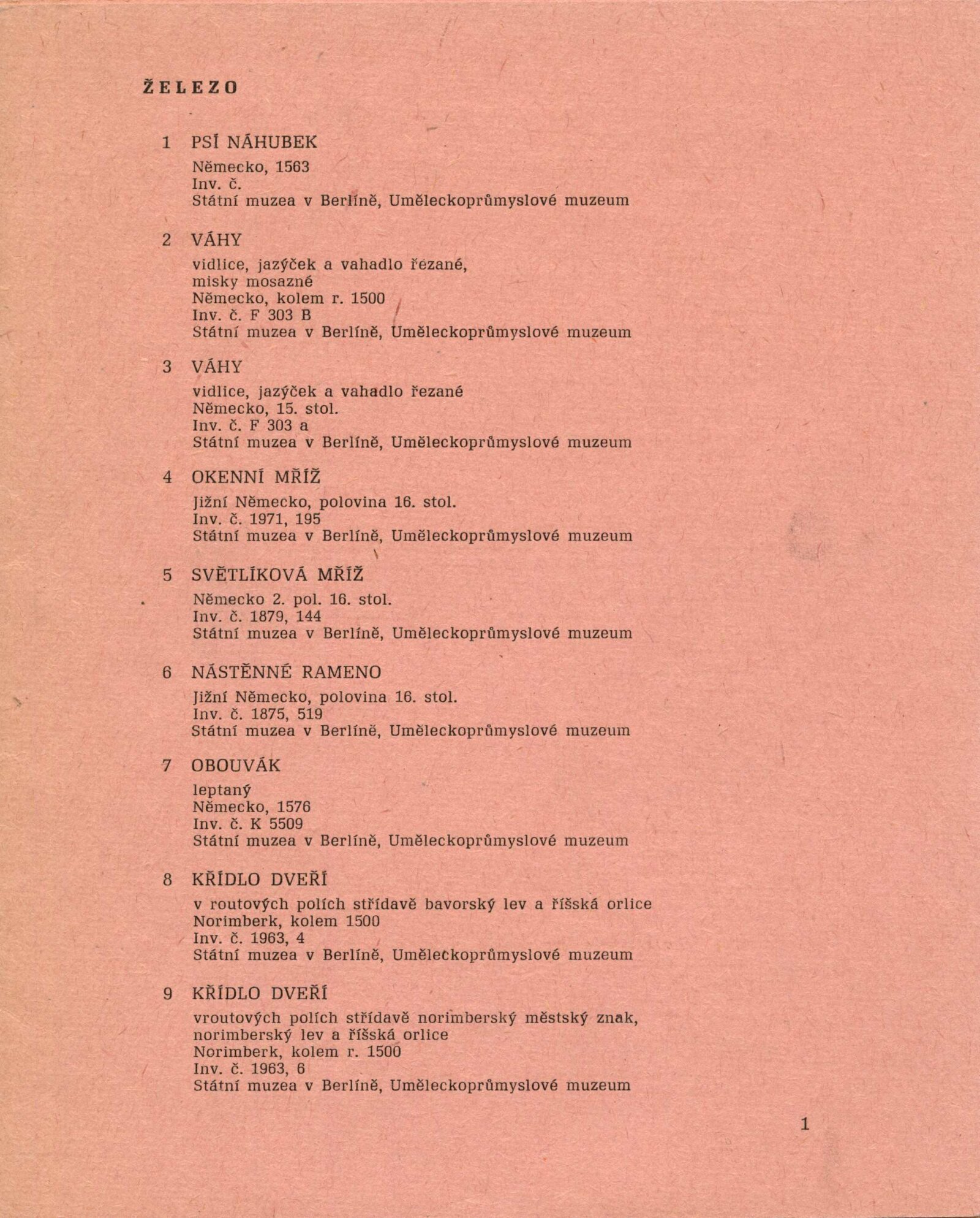 Umělecká řemesla doby Dürerovy a německé renesance: Dům umění / Dům pánů z Kunštátu, 10. 1. – 28. 1. 1973 / Převzatý katalog. Umělecké řemeslo doby Dürera a německé renesance. Výstava u příležitosti pětistého výročí narození Albrechta Dürera: Uměleckoprůmyslové muzeum, 1972 / Text: Günter Schade. – Praha: Uměleckoprůmyslové muzeum, 1972. – 11 s., 16 s., obr. příl., 1 l. bar. obr., seznam exponátů 14 s., DPK 526. – MG