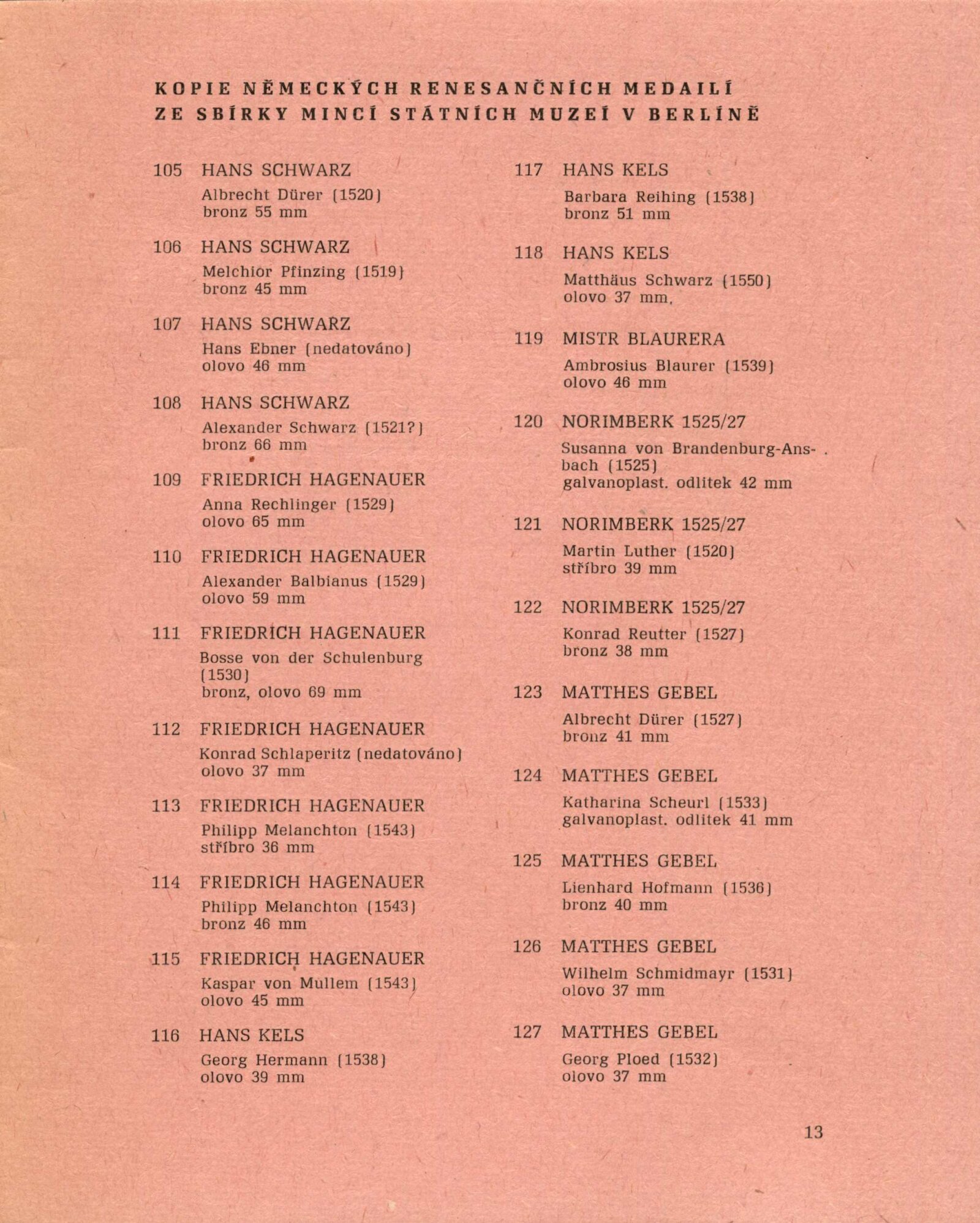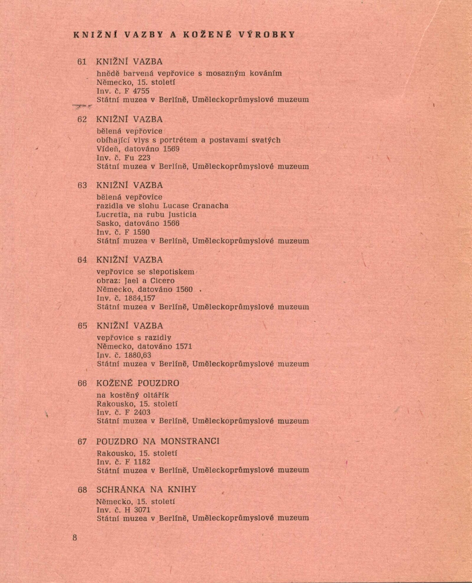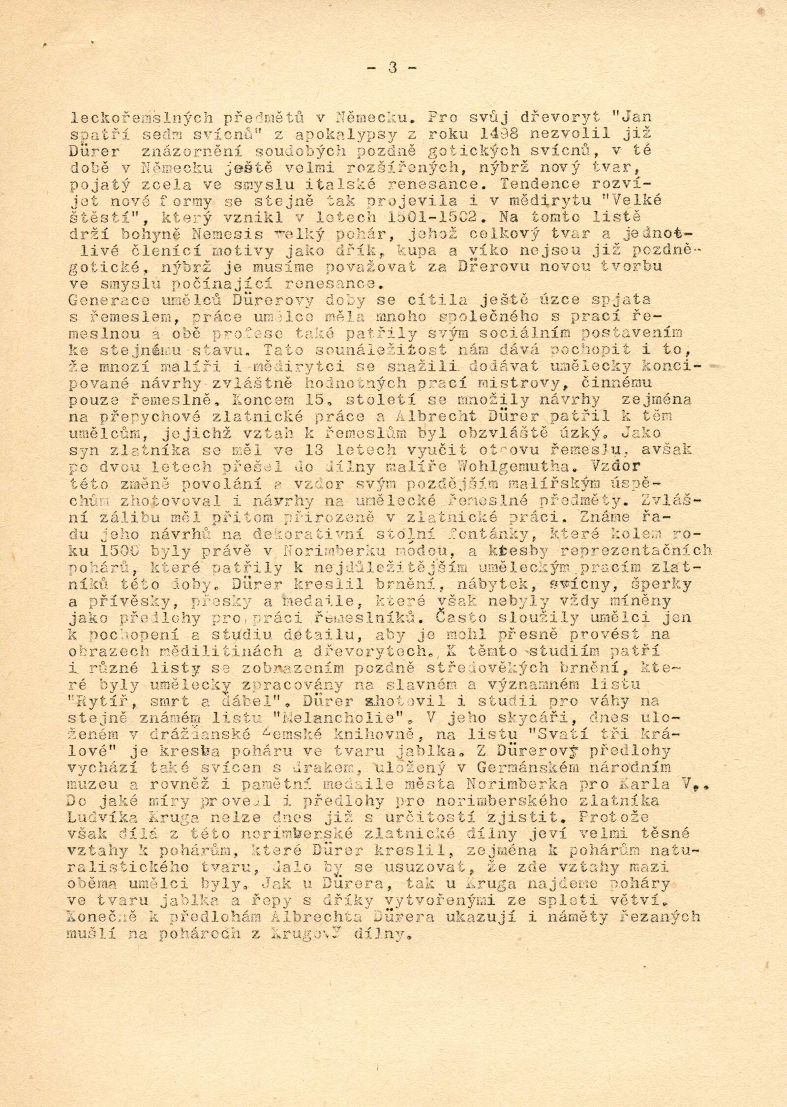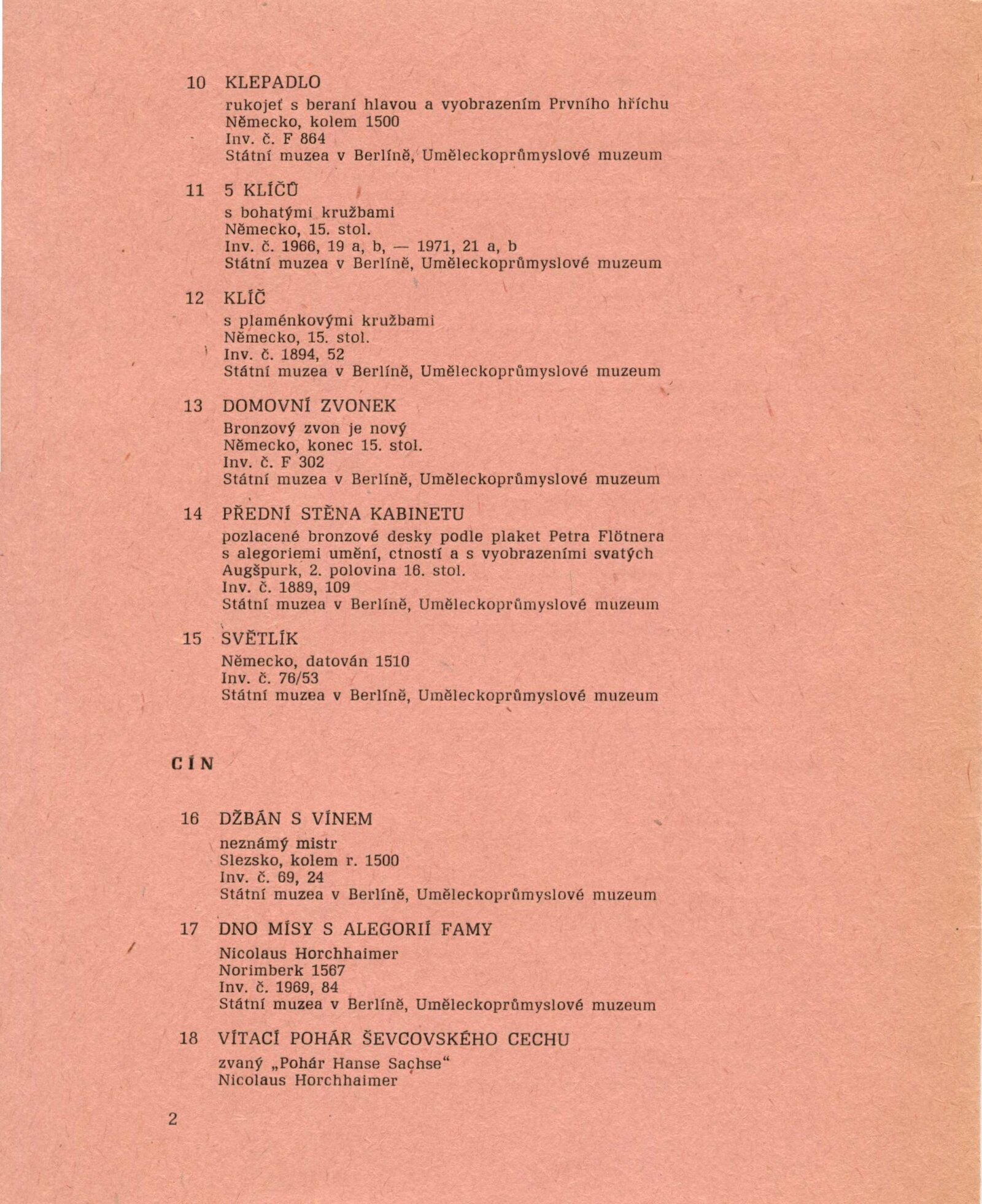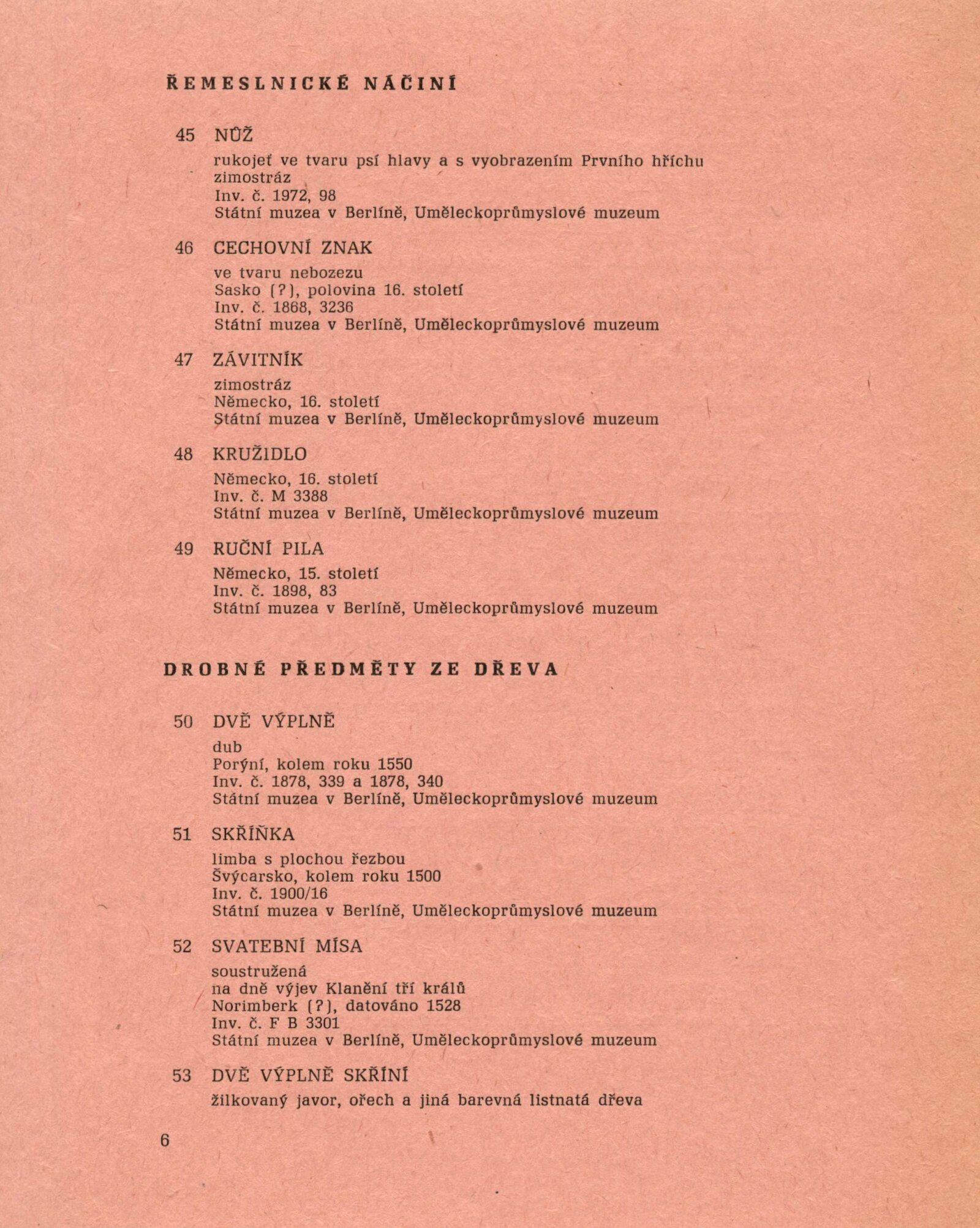 Umělecká řemesla doby Dürerovy a německé renesance: Dům umění / Dům pánů z Kunštátu, 10. 1. – 28. 1. 1973 / Převzatý katalog. Umělecké řemeslo doby Dürera a německé renesance. Výstava u příležitosti pětistého výročí narození Albrechta Dürera: Uměleckoprůmyslové muzeum, 1972 / Text: Günter Schade. – Praha: Uměleckoprůmyslové muzeum, 1972. – 11 s., 16 s., obr. příl., 1 l. bar. obr., seznam exponátů 14 s., DPK 526. – MG