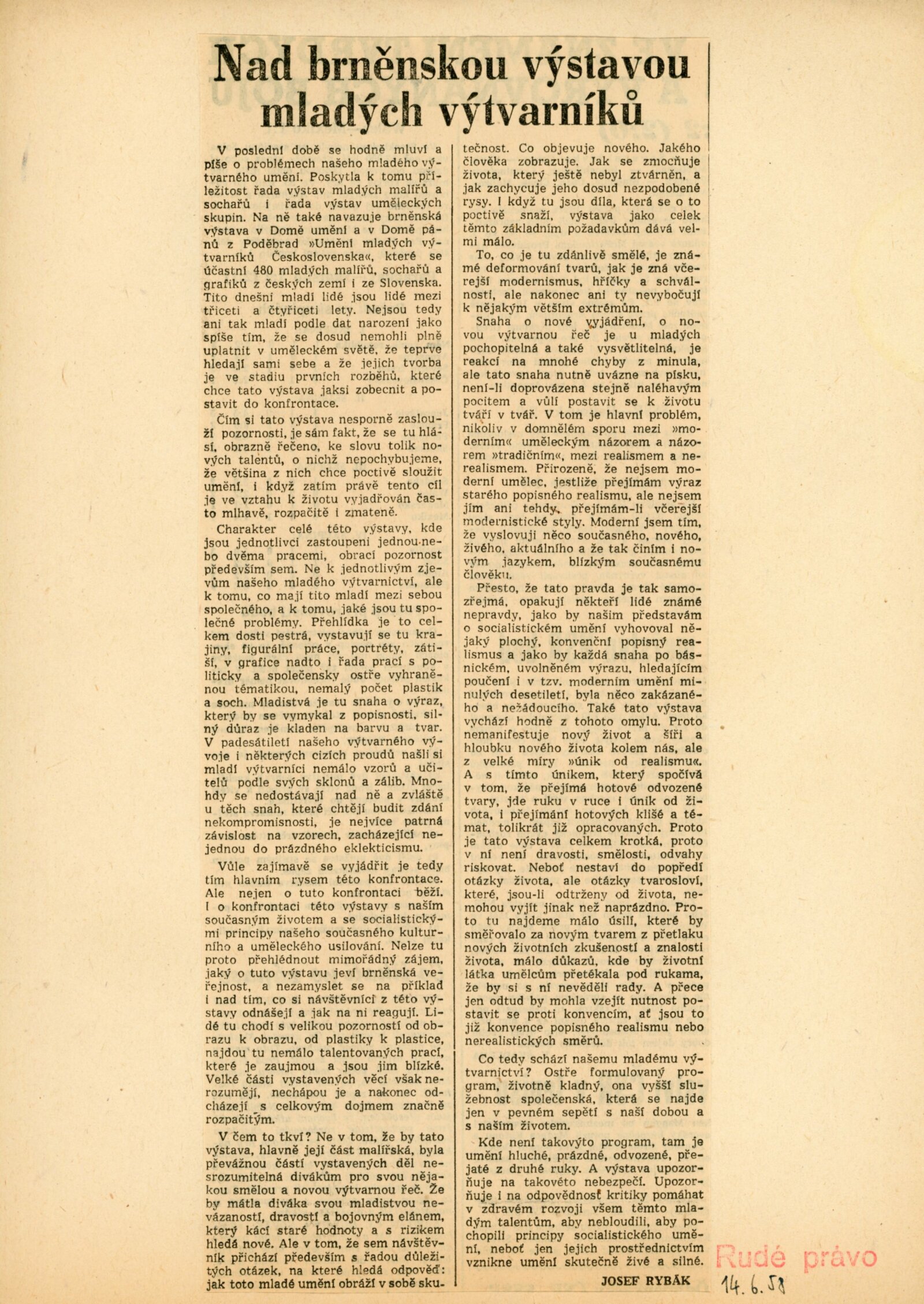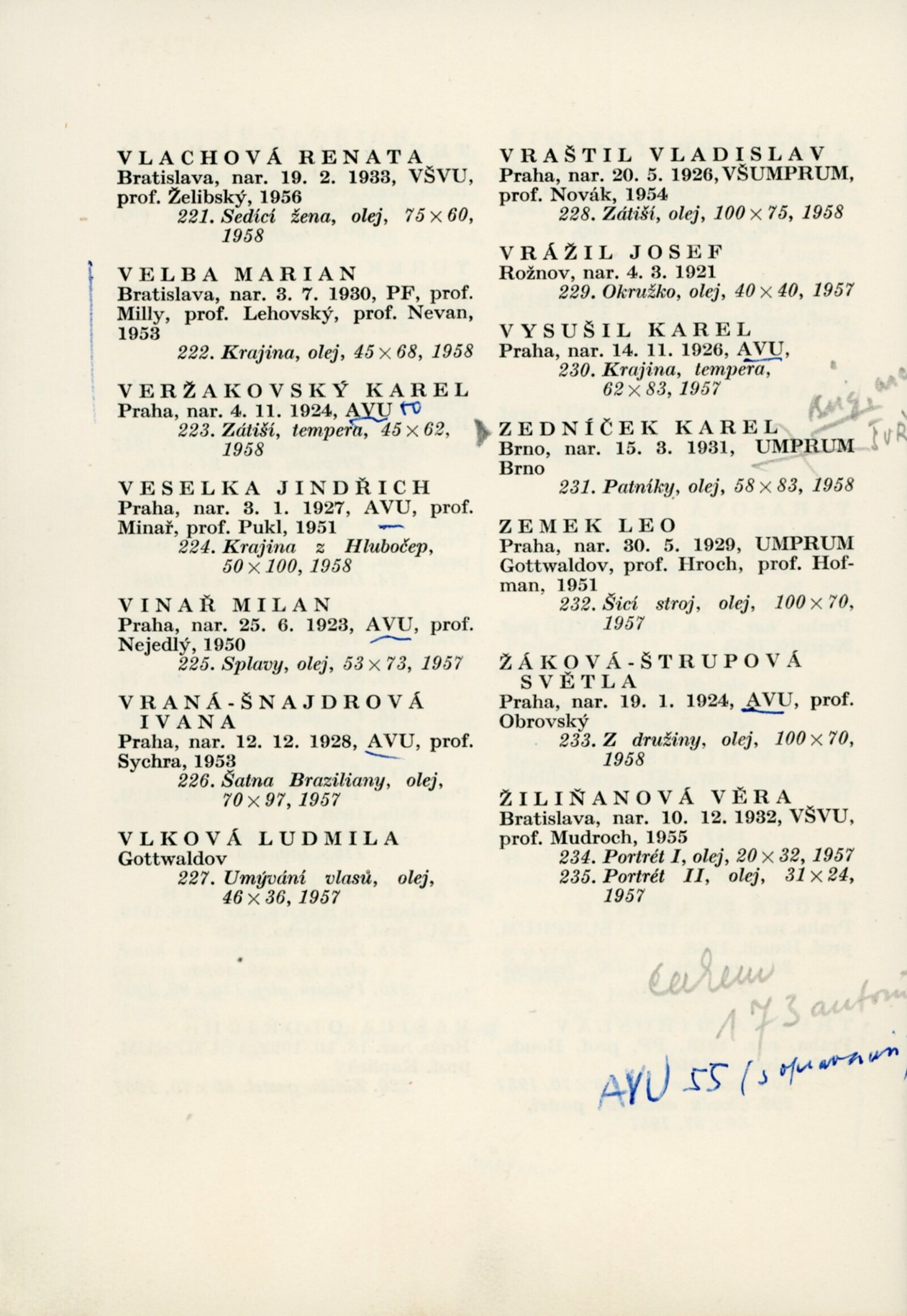 Umění mladých výtvarníků Československa. Obrazy a plastiky: Dům umění / Dům pánů z Poděbrad, I. část Obrazy a plastiky: Dům umění, 18. 5. – 29. 6. 1958, II. část Kresby a grafika: Dům pánů z Poděbrad, 25. 5. – 29. 6. 1958 / Společný katalog pro Brno a Prahu. Umění mladých výtvarníků Československa, 1958 / Text: Josef Císařovský. – Praha: Ústřední výbor ČSM, 1958. – 42 s., DU 310, DPK 6. – MZK; UPM