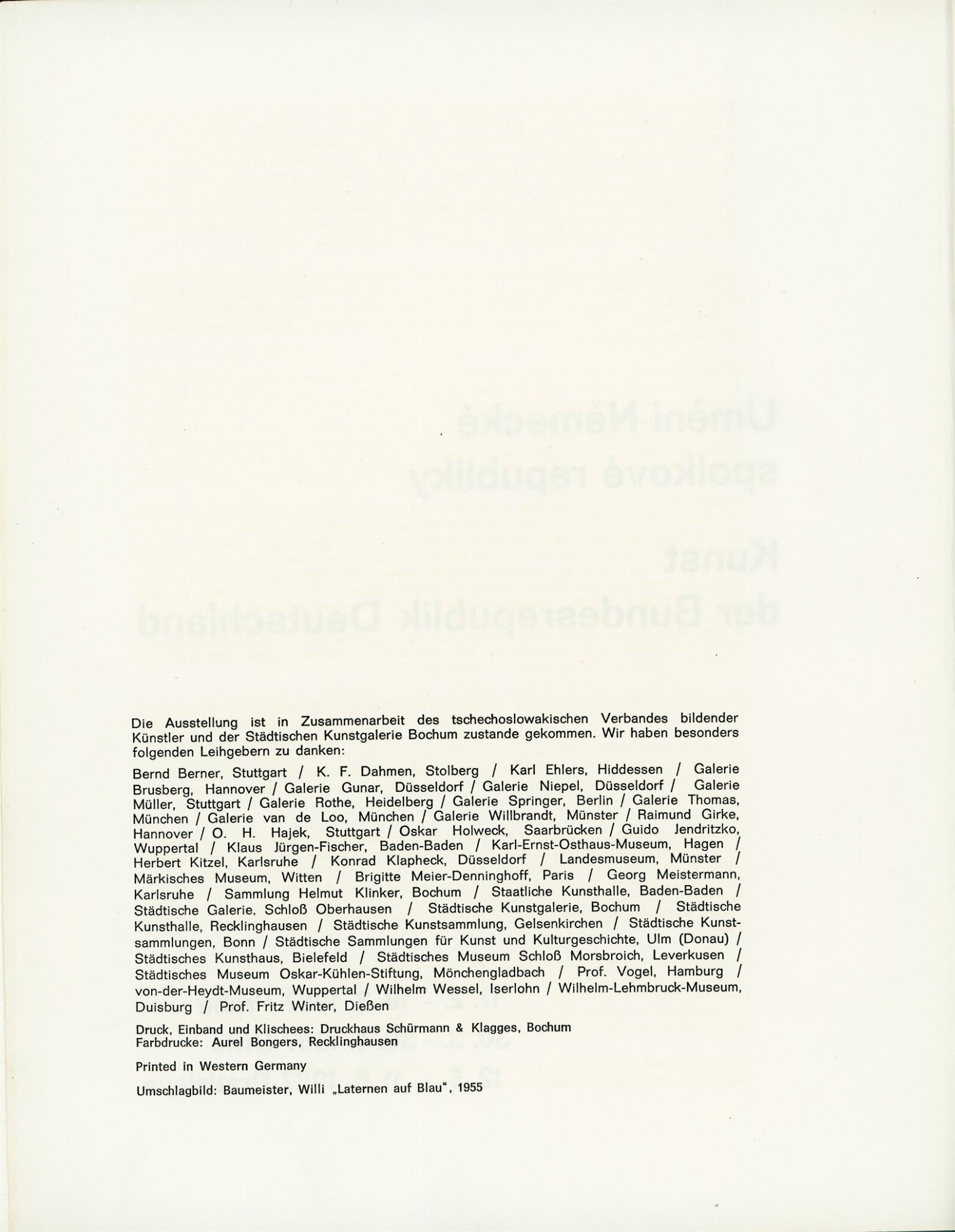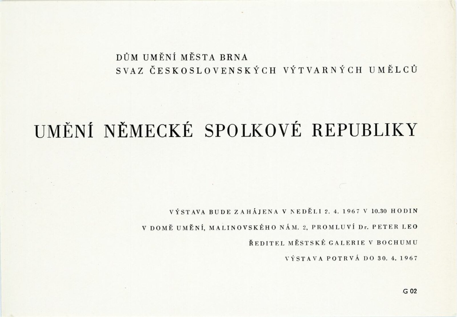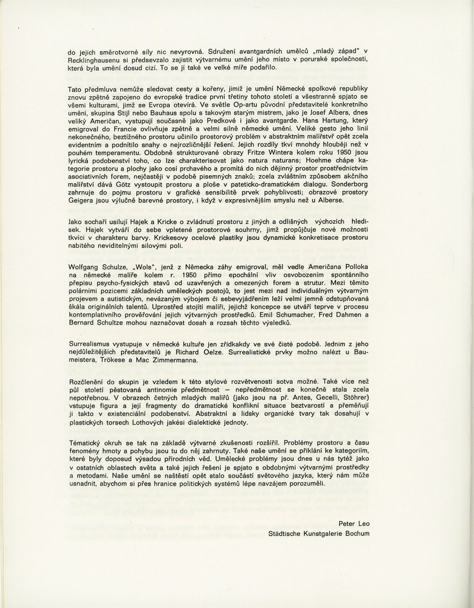 Umění Německé spolkové republiky. Kunst der Bundesrepublik Deutschland: Dům umění, 1. patro, 30. 3. – 30. 4. 1967 / Text: Petr Leo. – Bochum: Städtische Kunstgalerie, 1967. – 42 s., 92 s. obr. příl., DU 480