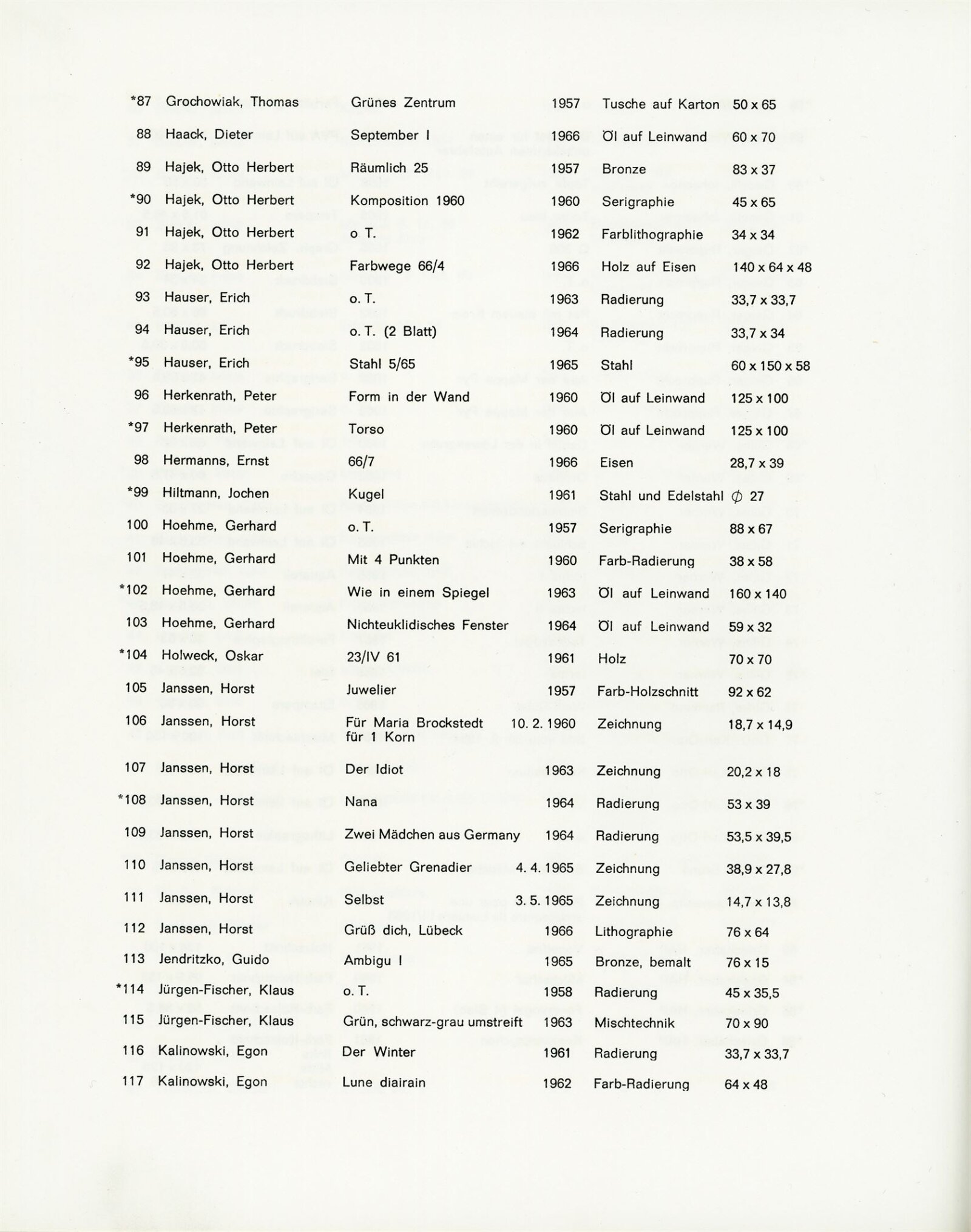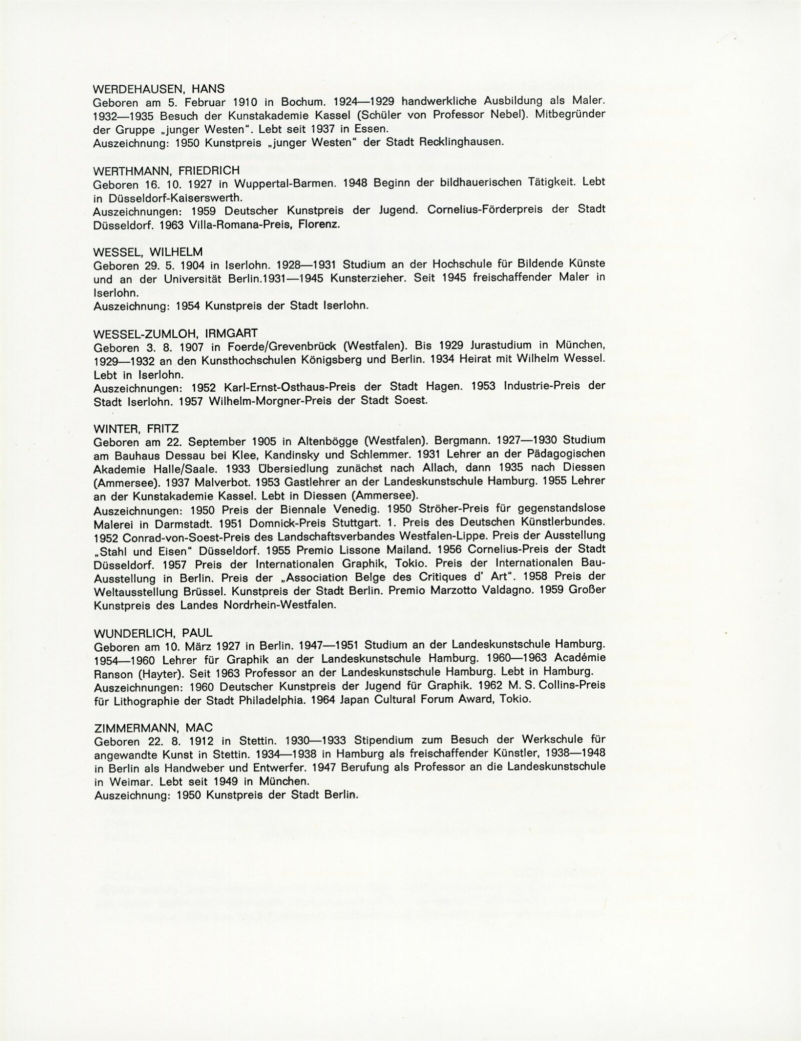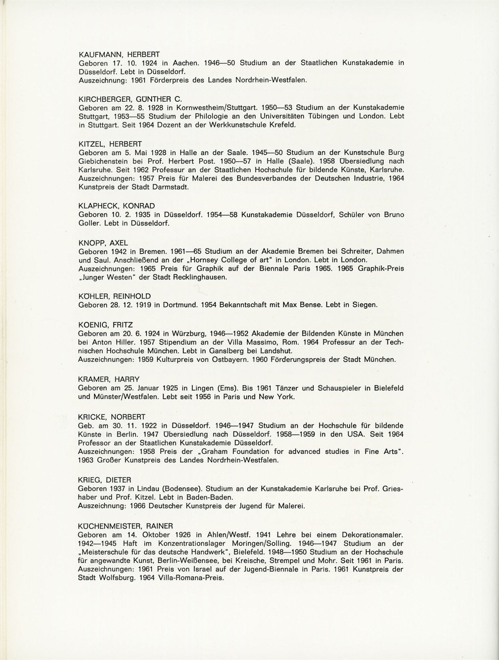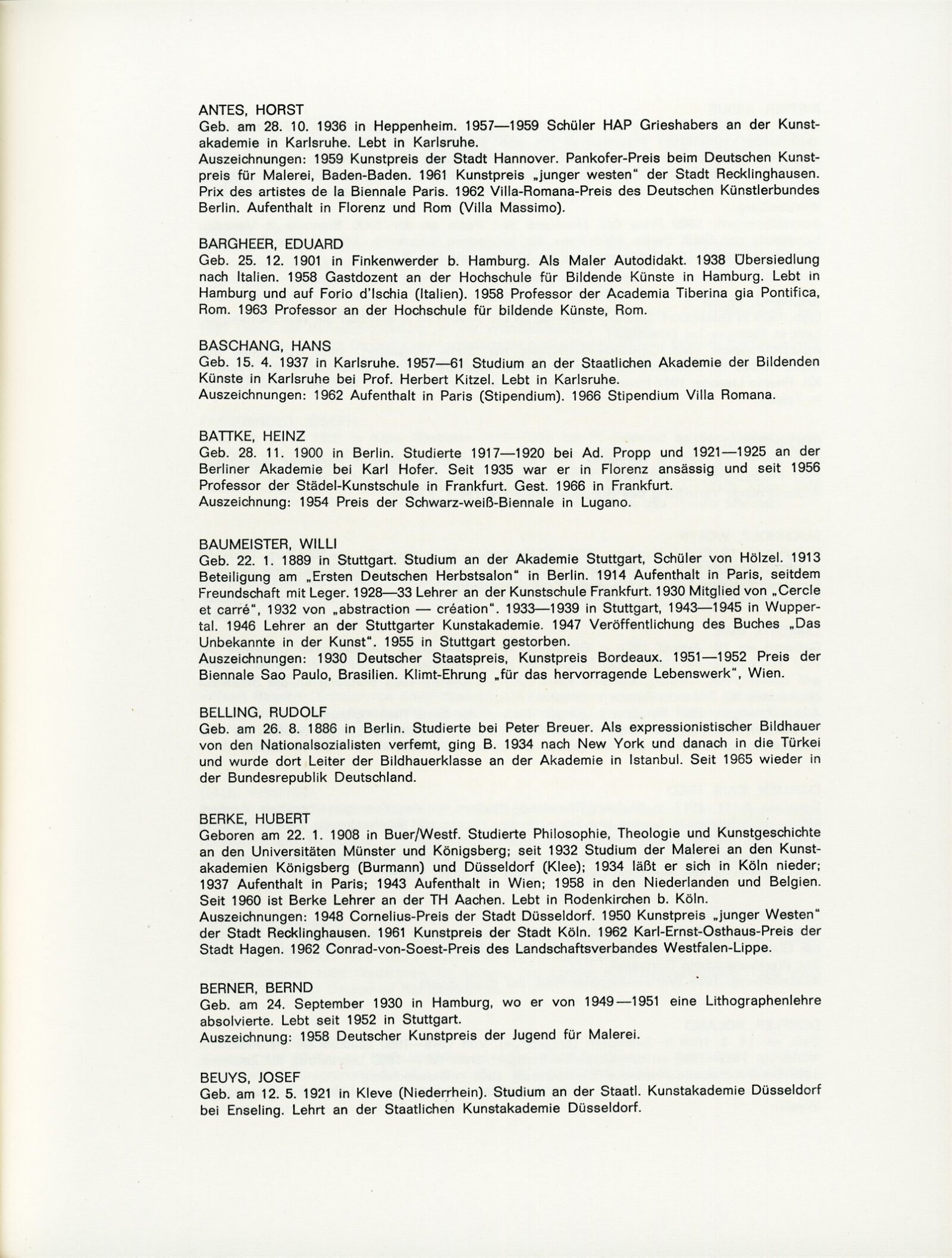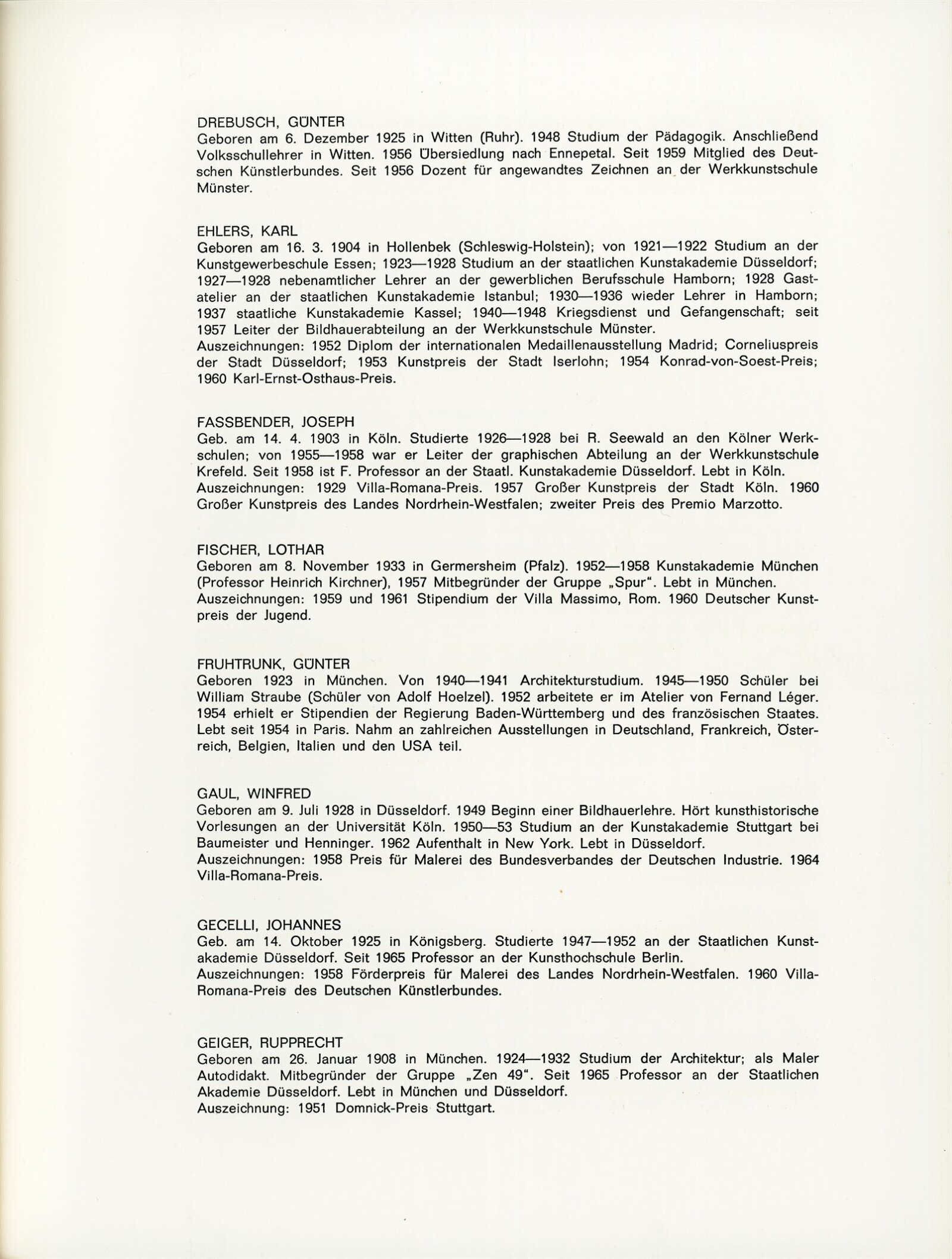 Antes Horst, Eduard Bargheer, Hans Baschang, Heinz Battke, Willi Baumeister, Rudolf Belling, Hubert Berke, Bernd Berner, Josef Beuys, Julius Bissier, Peter Brüning, Carl Buchheister, Wolff Buchholz, Emil Cimiotti, Karl Fred Dahmen, Gustav Deppe, Roland Dörfler, Günter Drebusch, Karl Ehlers, Joseph Fassbender, Lothar Fischer, Günter Fruhtrunk, Winfred Gaul, Johannes Geelli, Rupprecht Geiger, Werner Gilles, Raimund Girke, Karl-Otto Götz, Bruno Goller, Gerhard von Graevenitz, Hap Grieshaber, Thomas Grochowiak, Dieter Haack, Günter Haese, Otto Herbert Hajek, Erich Hauser, Peter Herkenrath, Ernst Hermanns, Jochen Hiltmann, Gerhard Hoehme, Oskar Holweck, Horst Janssen, Guido Jendritzko, Klaus Jürgen-Fischer, Horst-Egon Kalinowski, Herbert Kaufmann, Günter C. Kirchberger, Herbert Kitzel, Konrad Klapheck, Axel Knopp, Reinhold Köhler, Fritz Koenig, Harry Kramer, Norbert Kricke, Dieter Krieg, Rainer Küchenmeister, Jens Lausen, Arnold Leissler, Kaspar-Thomas Lenk, Alfred Lörcher, Wilhelm Loth, Konrad Lueg, Heinz Mack, Almir Mavignier, Friedrich Meckseper, Brigitte Meier-Denninghoff, Georg Meistermann, Ernst Wilhelm Nay, E. R. Nele (Bode), Richard Oelze, Bruno Pelz, Georg Karl Pfahler, Otto Piene, Hubertus von Pilgrim, Heimrad Prem, Lothar Quinte, Josua Reichert, Werner Reichhold, Gerhard Richter, Ferdinand Gunther, Otto Ritschl, Emy Roeder, Rolf Sackenheim, Armin Sandig, Gustav Seitz, Sonderborg (K. R. Hoffmann), Edwin Scharff, Hans-Jürgen Schlieker, Michael Schoenholtz, Rudolf Schoofs, Johannes Schreiter, Bernard Schultze, Emil Schumacher, Toni Stadler, Walter Stöhrer, Norbert Tadeusz, Hans Thiemann, Heinz Thökes, Günter Uecker, Bernd Völkle, Wolf Vostell, Hans Werdehausen, Werthmann Friedrich, Wilhelm Wessel, Irmgart Wessel-Zumloch, Fritz Winter, Paul Wunderlich, Mac Zimmermann