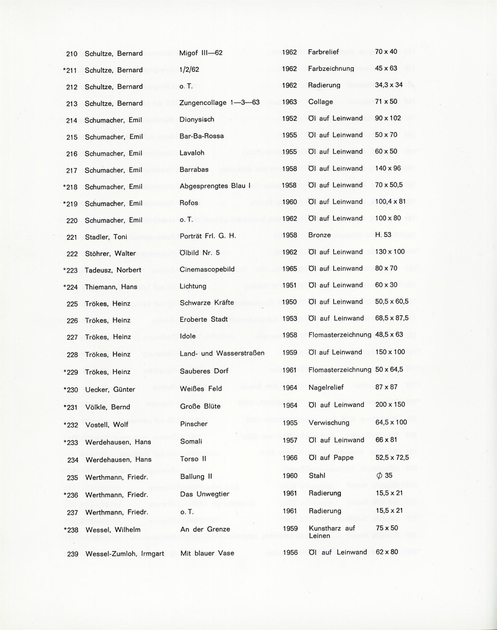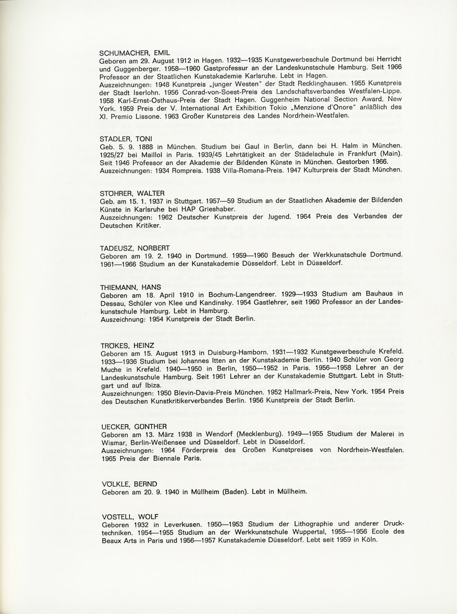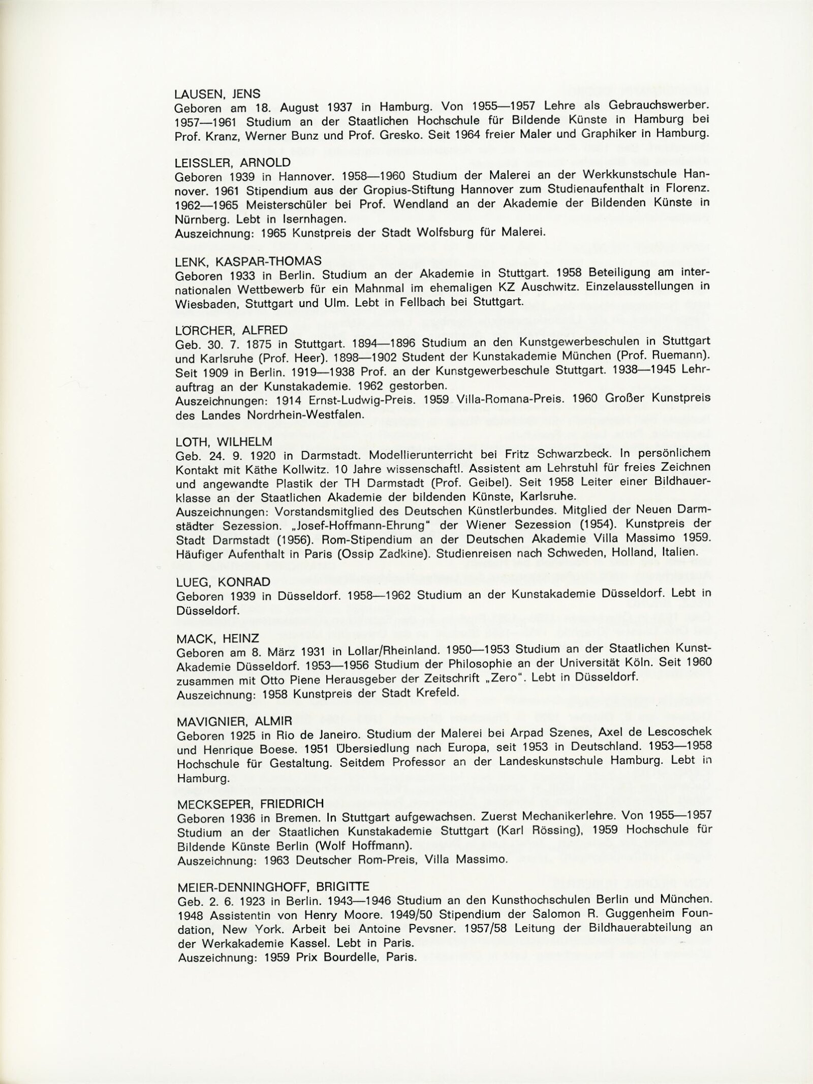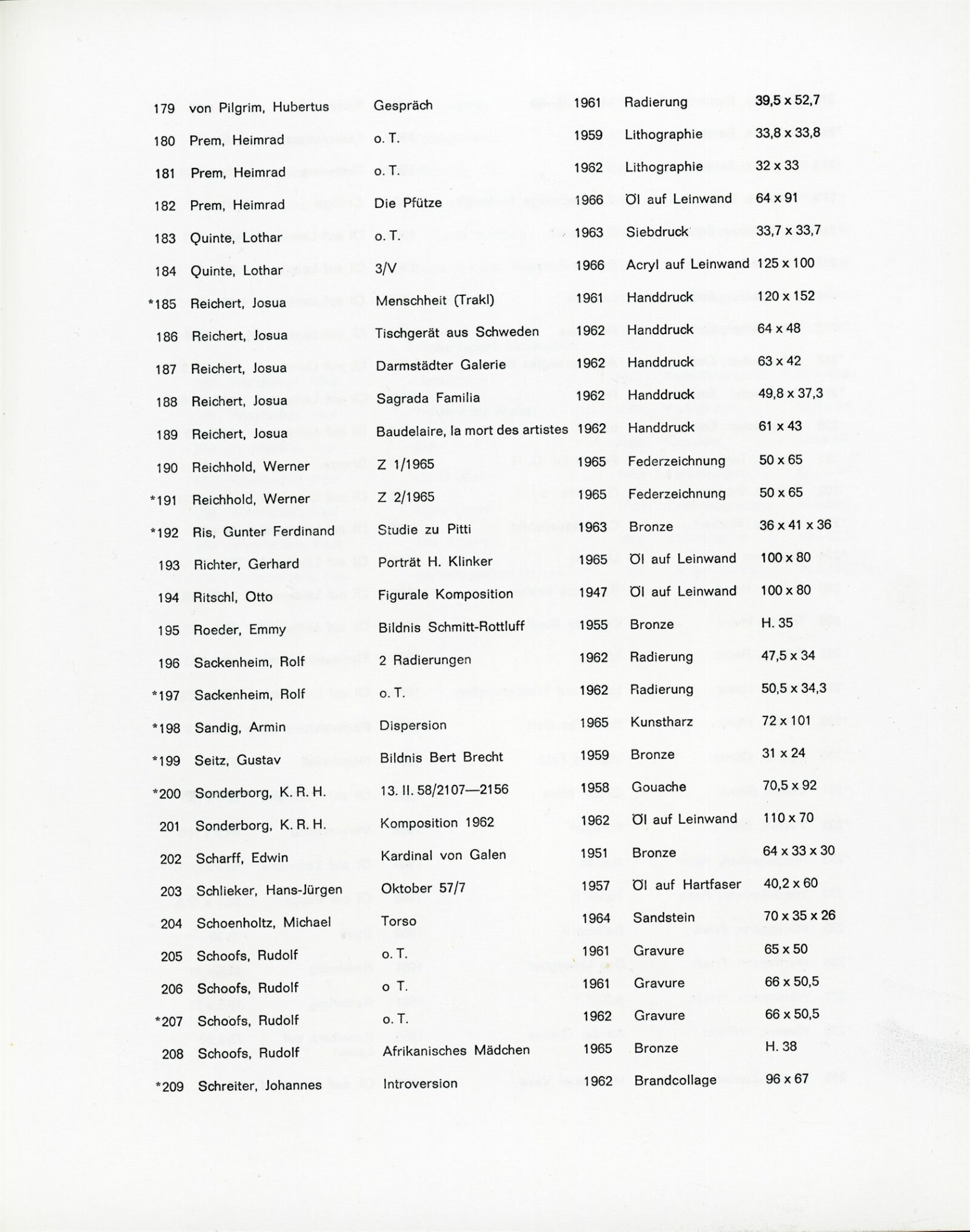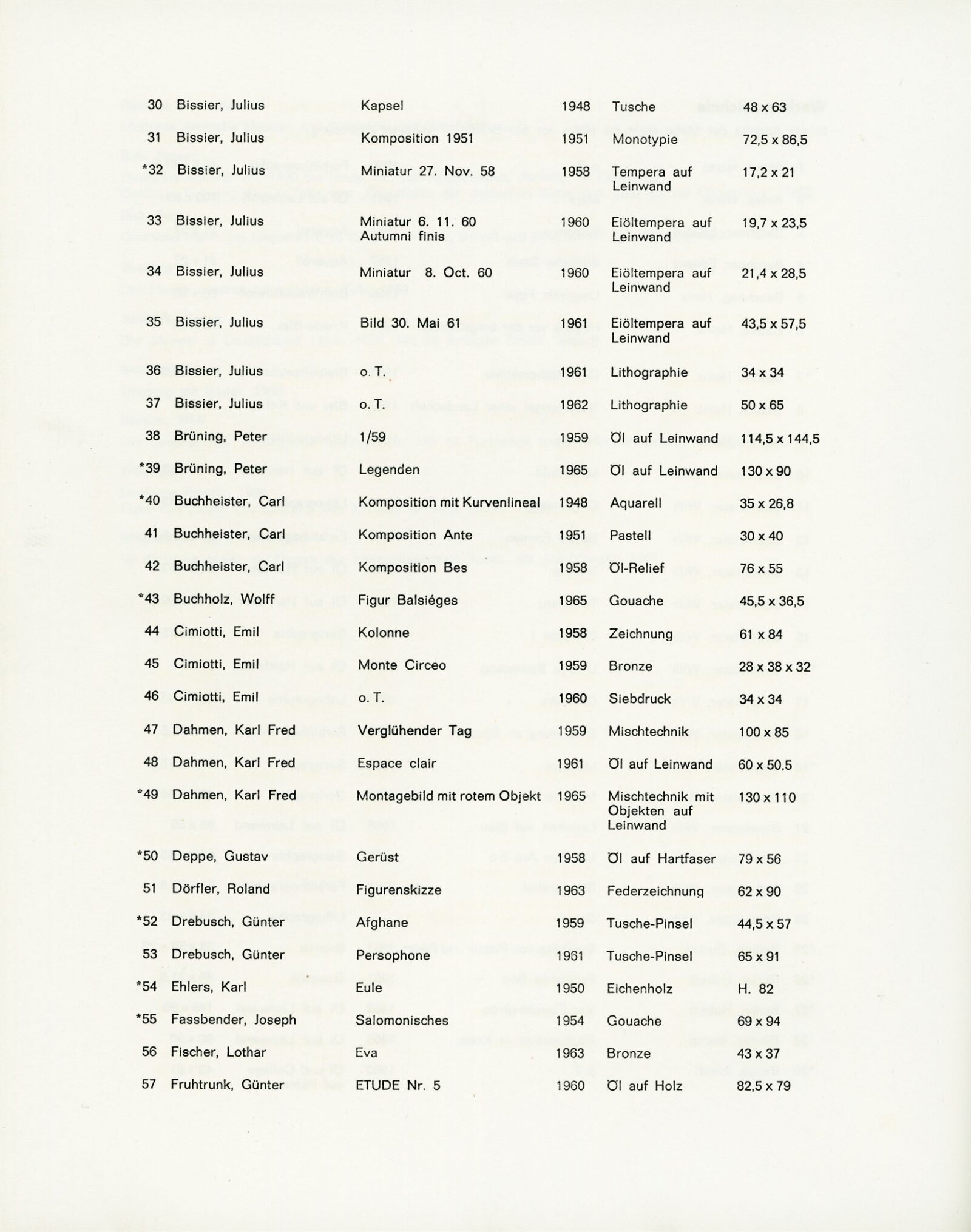 Antes Horst, Eduard Bargheer, Hans Baschang, Heinz Battke, Willi Baumeister, Rudolf Belling, Hubert Berke, Bernd Berner, Josef Beuys, Julius Bissier, Peter Brüning, Carl Buchheister, Wolff Buchholz, Emil Cimiotti, Karl Fred Dahmen, Gustav Deppe, Roland Dörfler, Günter Drebusch, Karl Ehlers, Joseph Fassbender, Lothar Fischer, Günter Fruhtrunk, Winfred Gaul, Johannes Geelli, Rupprecht Geiger, Werner Gilles, Raimund Girke, Karl-Otto Götz, Bruno Goller, Gerhard von Graevenitz, Hap Grieshaber, Thomas Grochowiak, Dieter Haack, Günter Haese, Otto Herbert Hajek, Erich Hauser, Peter Herkenrath, Ernst Hermanns, Jochen Hiltmann, Gerhard Hoehme, Oskar Holweck, Horst Janssen, Guido Jendritzko, Klaus Jürgen-Fischer, Horst-Egon Kalinowski, Herbert Kaufmann, Günter C. Kirchberger, Herbert Kitzel, Konrad Klapheck, Axel Knopp, Reinhold Köhler, Fritz Koenig, Harry Kramer, Norbert Kricke, Dieter Krieg, Rainer Küchenmeister, Jens Lausen, Arnold Leissler, Kaspar-Thomas Lenk, Alfred Lörcher, Wilhelm Loth, Konrad Lueg, Heinz Mack, Almir Mavignier, Friedrich Meckseper, Brigitte Meier-Denninghoff, Georg Meistermann, Ernst Wilhelm Nay, E. R. Nele (Bode), Richard Oelze, Bruno Pelz, Georg Karl Pfahler, Otto Piene, Hubertus von Pilgrim, Heimrad Prem, Lothar Quinte, Josua Reichert, Werner Reichhold, Gerhard Richter, Ferdinand Gunther, Otto Ritschl, Emy Roeder, Rolf Sackenheim, Armin Sandig, Gustav Seitz, Sonderborg (K. R. Hoffmann), Edwin Scharff, Hans-Jürgen Schlieker, Michael Schoenholtz, Rudolf Schoofs, Johannes Schreiter, Bernard Schultze, Emil Schumacher, Toni Stadler, Walter Stöhrer, Norbert Tadeusz, Hans Thiemann, Heinz Thökes, Günter Uecker, Bernd Völkle, Wolf Vostell, Hans Werdehausen, Werthmann Friedrich, Wilhelm Wessel, Irmgart Wessel-Zumloch, Fritz Winter, Paul Wunderlich, Mac Zimmermann