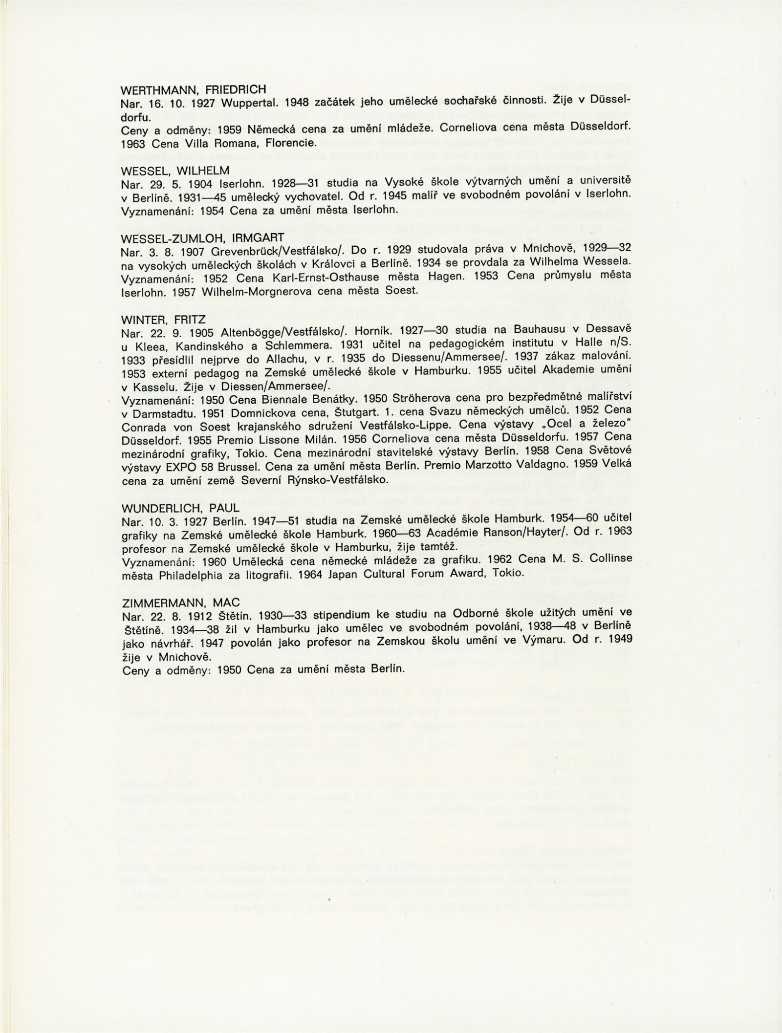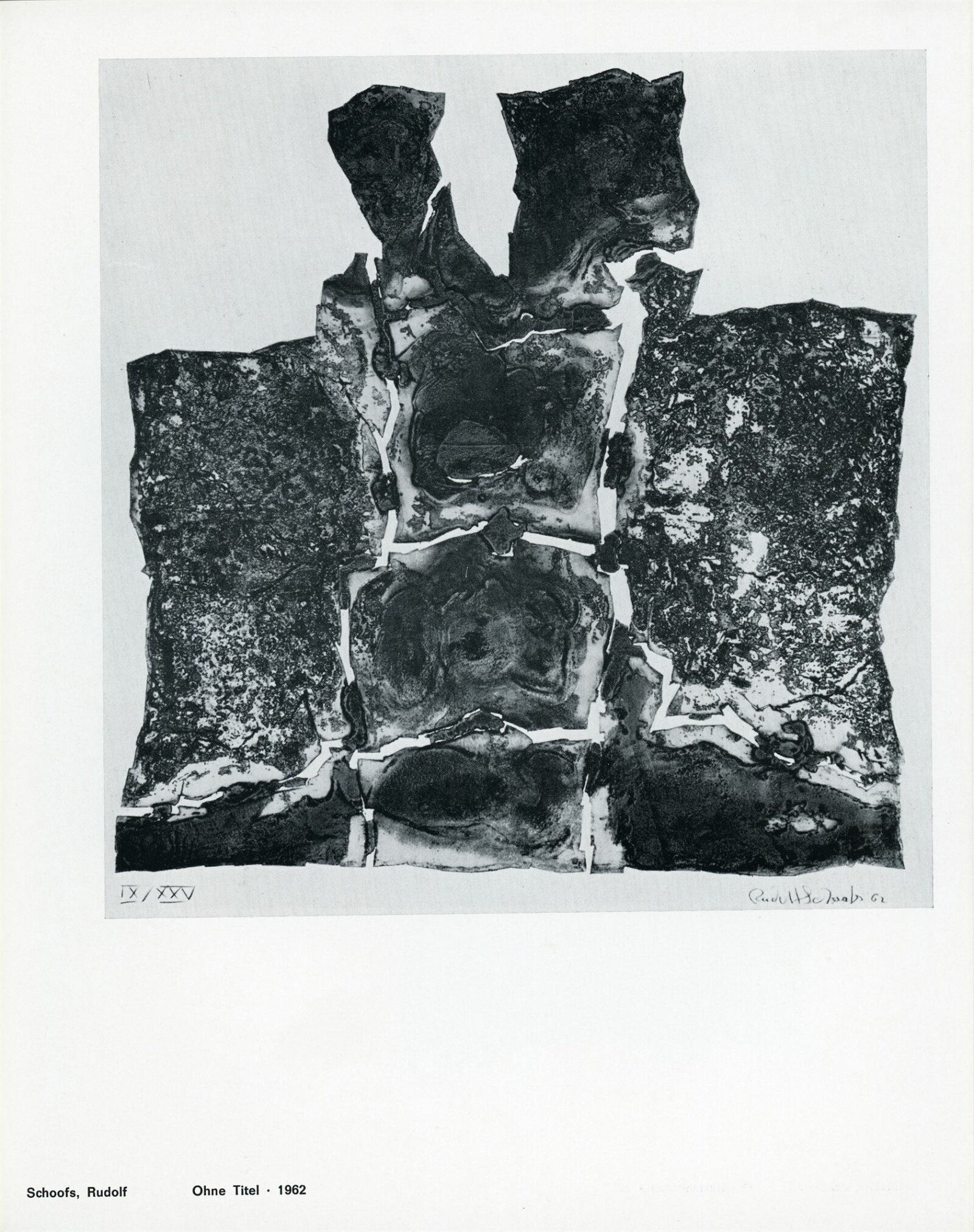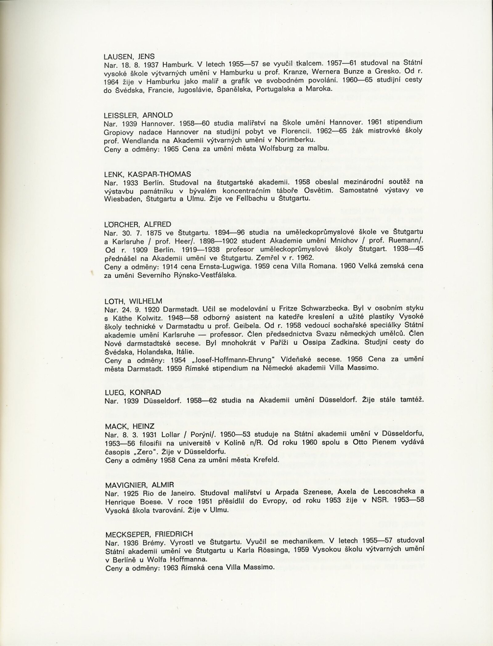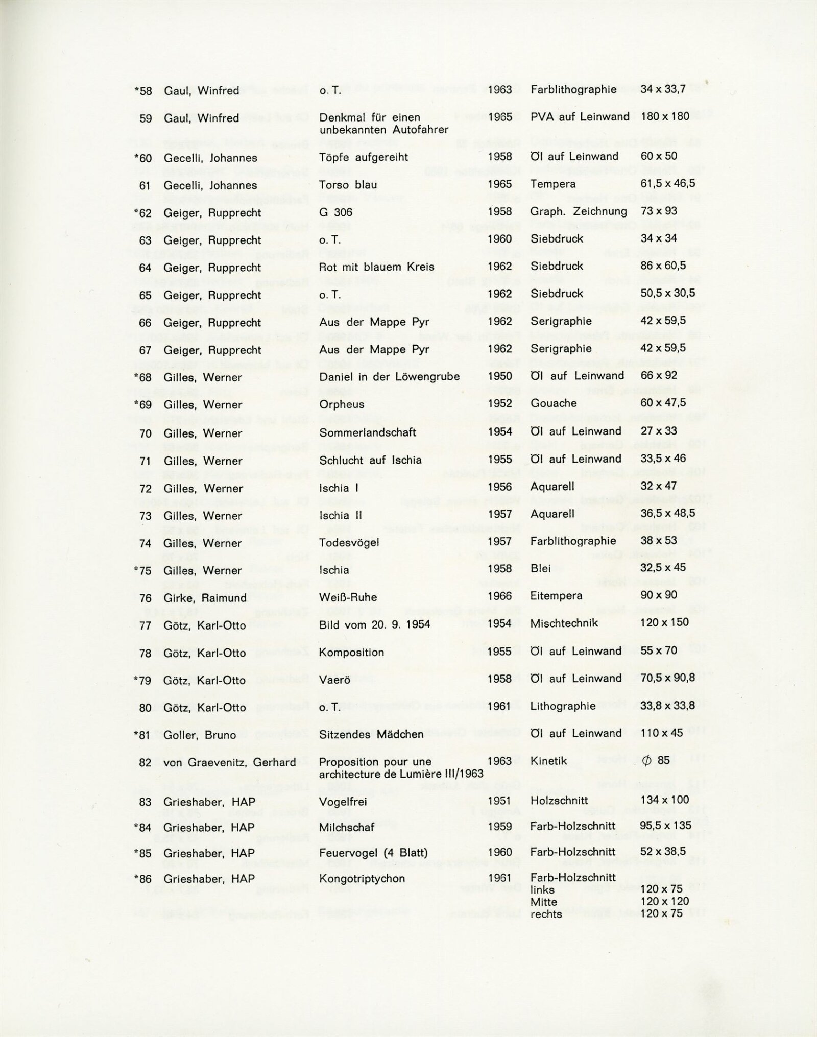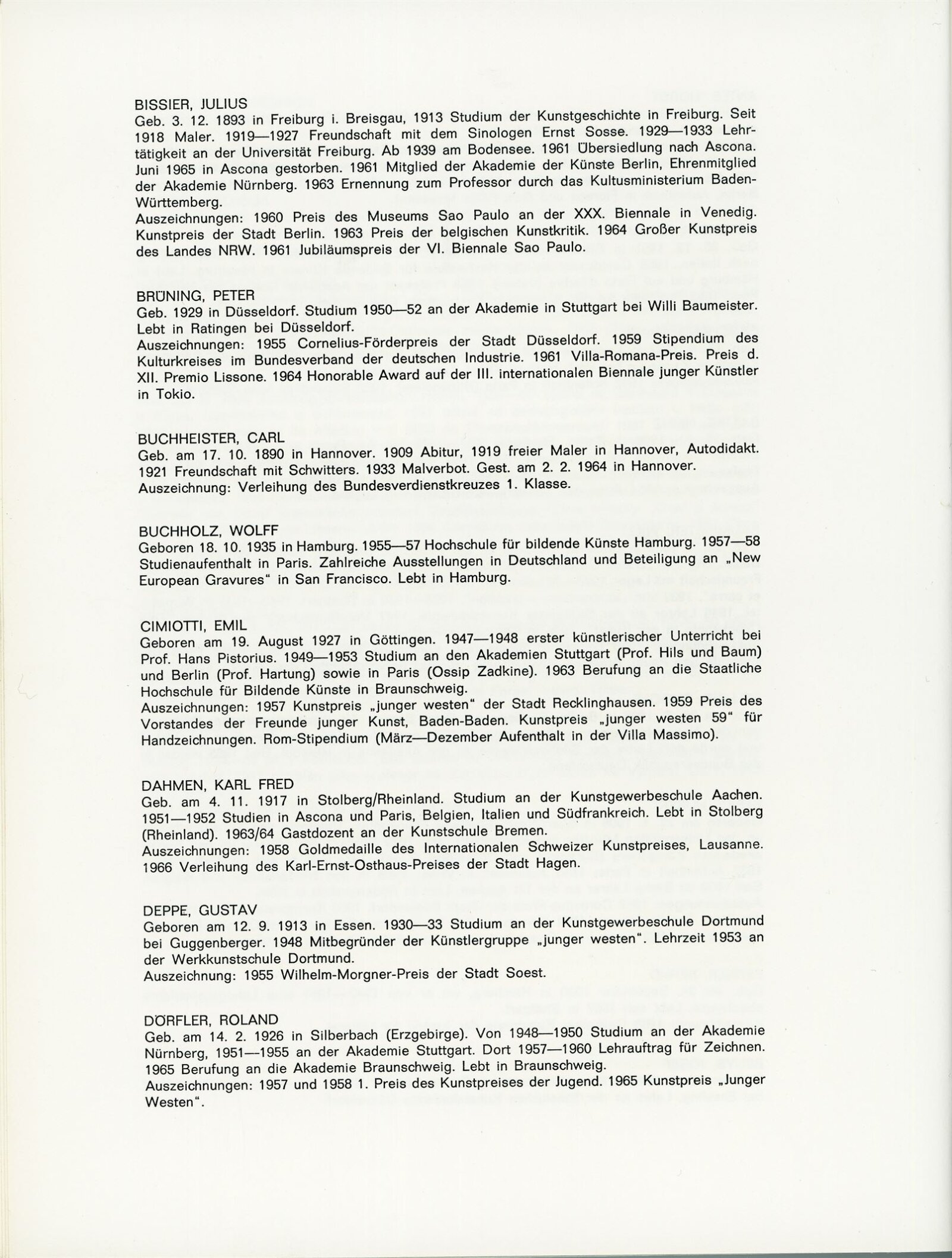 Antes Horst, Eduard Bargheer, Hans Baschang, Heinz Battke, Willi Baumeister, Rudolf Belling, Hubert Berke, Bernd Berner, Josef Beuys, Julius Bissier, Peter Brüning, Carl Buchheister, Wolff Buchholz, Emil Cimiotti, Karl Fred Dahmen, Gustav Deppe, Roland Dörfler, Günter Drebusch, Karl Ehlers, Joseph Fassbender, Lothar Fischer, Günter Fruhtrunk, Winfred Gaul, Johannes Geelli, Rupprecht Geiger, Werner Gilles, Raimund Girke, Karl-Otto Götz, Bruno Goller, Gerhard von Graevenitz, Hap Grieshaber, Thomas Grochowiak, Dieter Haack, Günter Haese, Otto Herbert Hajek, Erich Hauser, Peter Herkenrath, Ernst Hermanns, Jochen Hiltmann, Gerhard Hoehme, Oskar Holweck, Horst Janssen, Guido Jendritzko, Klaus Jürgen-Fischer, Horst-Egon Kalinowski, Herbert Kaufmann, Günter C. Kirchberger, Herbert Kitzel, Konrad Klapheck, Axel Knopp, Reinhold Köhler, Fritz Koenig, Harry Kramer, Norbert Kricke, Dieter Krieg, Rainer Küchenmeister, Jens Lausen, Arnold Leissler, Kaspar-Thomas Lenk, Alfred Lörcher, Wilhelm Loth, Konrad Lueg, Heinz Mack, Almir Mavignier, Friedrich Meckseper, Brigitte Meier-Denninghoff, Georg Meistermann, Ernst Wilhelm Nay, E. R. Nele (Bode), Richard Oelze, Bruno Pelz, Georg Karl Pfahler, Otto Piene, Hubertus von Pilgrim, Heimrad Prem, Lothar Quinte, Josua Reichert, Werner Reichhold, Gerhard Richter, Ferdinand Gunther, Otto Ritschl, Emy Roeder, Rolf Sackenheim, Armin Sandig, Gustav Seitz, Sonderborg (K. R. Hoffmann), Edwin Scharff, Hans-Jürgen Schlieker, Michael Schoenholtz, Rudolf Schoofs, Johannes Schreiter, Bernard Schultze, Emil Schumacher, Toni Stadler, Walter Stöhrer, Norbert Tadeusz, Hans Thiemann, Heinz Thökes, Günter Uecker, Bernd Völkle, Wolf Vostell, Hans Werdehausen, Werthmann Friedrich, Wilhelm Wessel, Irmgart Wessel-Zumloch, Fritz Winter, Paul Wunderlich, Mac Zimmermann