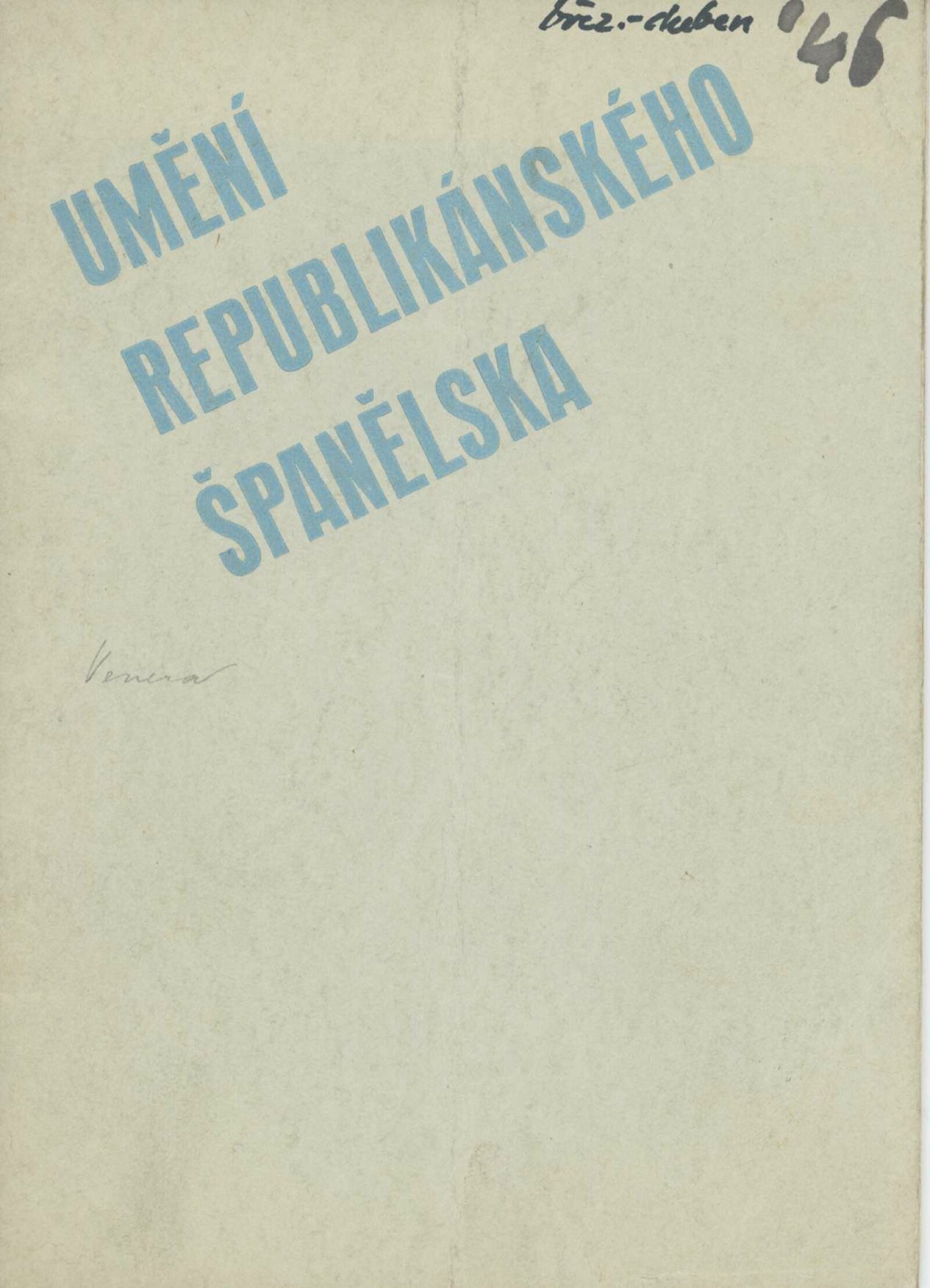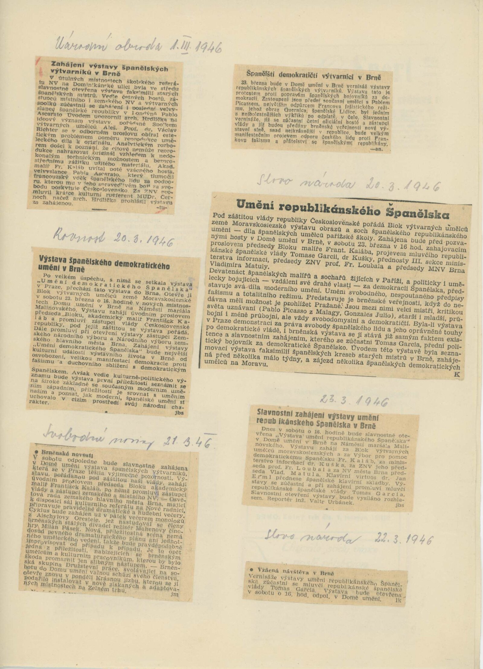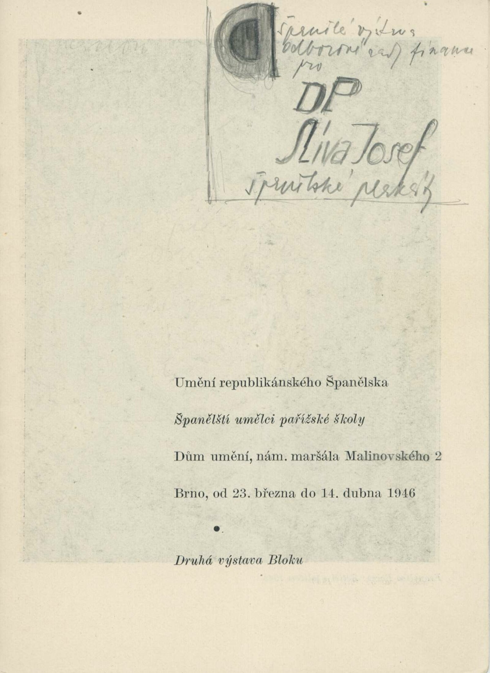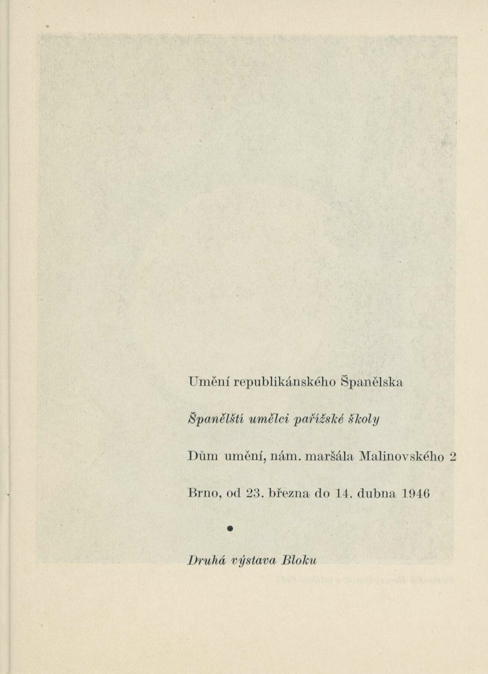 Umění republikánského Španělska. Španělští umělci pařížské školy. Druhá výstava Bloku: Dům umění, 23. 3. – 14. 4. 1946 / Text: Frédéric Delanglade. – Brno: Blok, 1946. – 32 s., obr., básně Paula Éluarda, Tristana Tzary, životní data vystavujících, DU 12. – MG; AMB; MMB