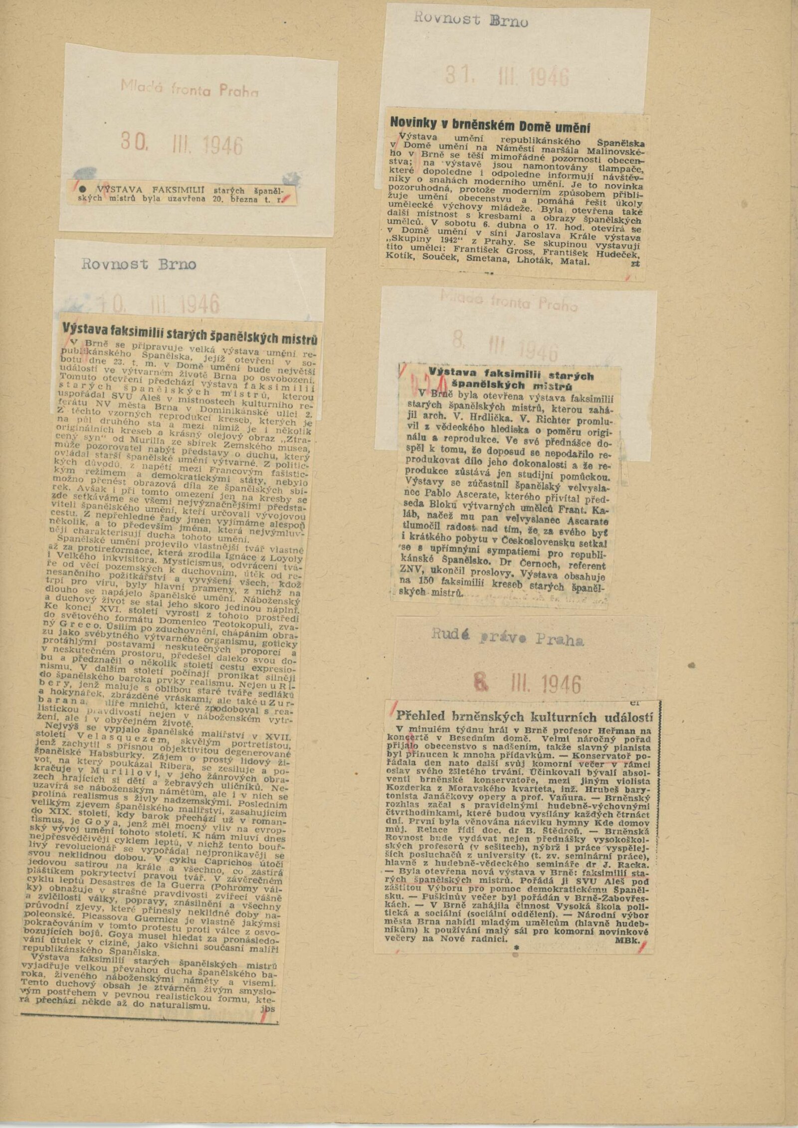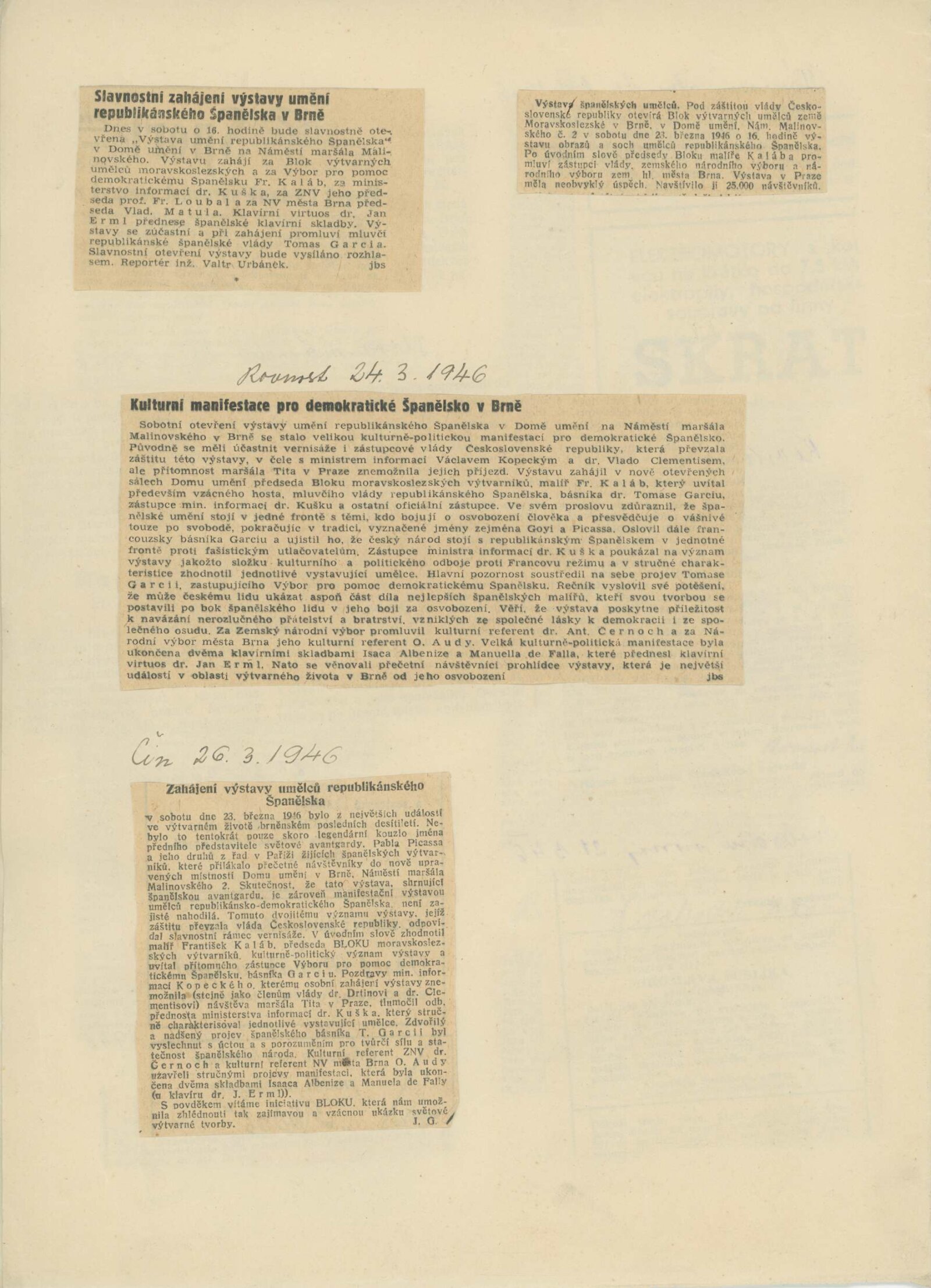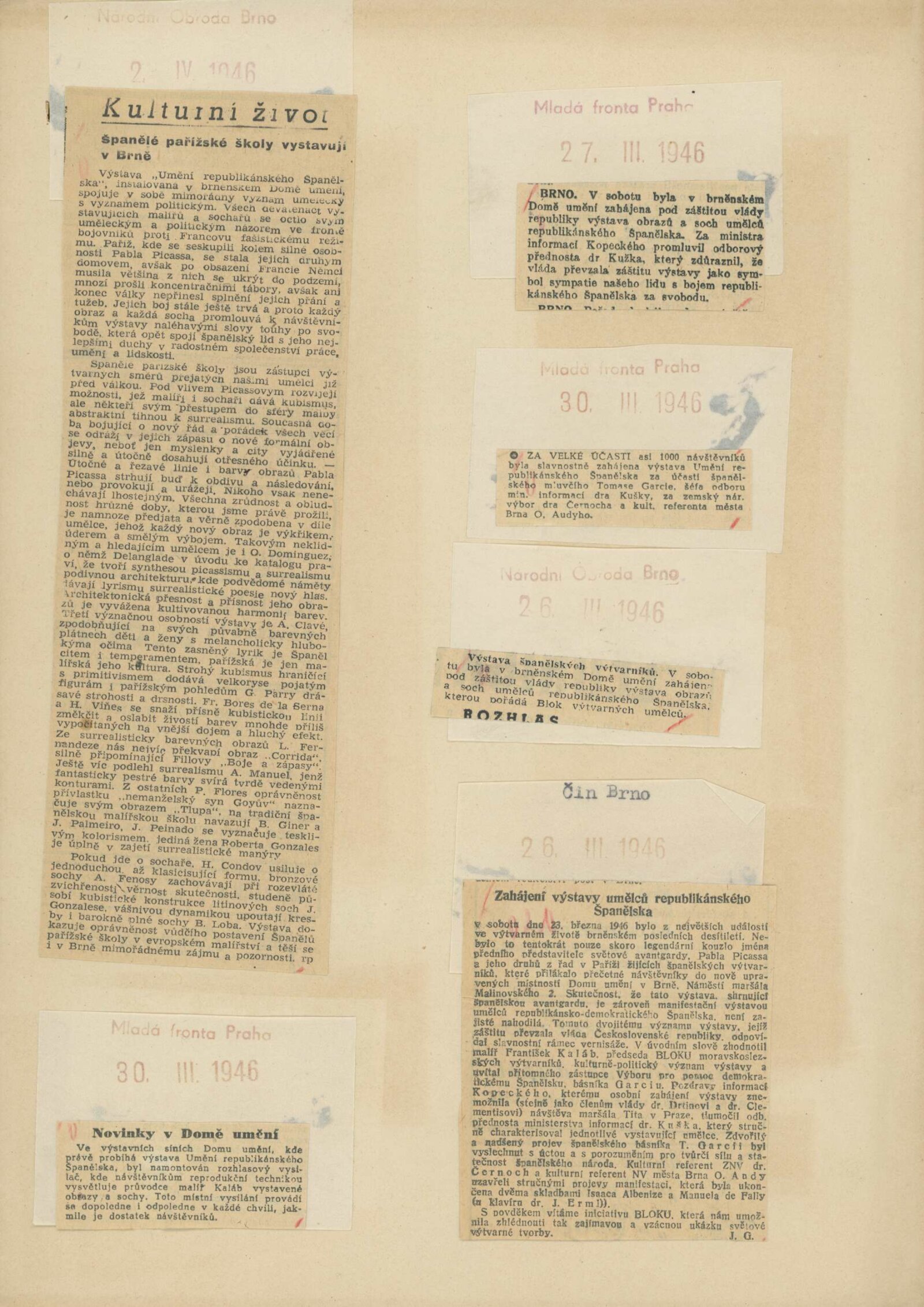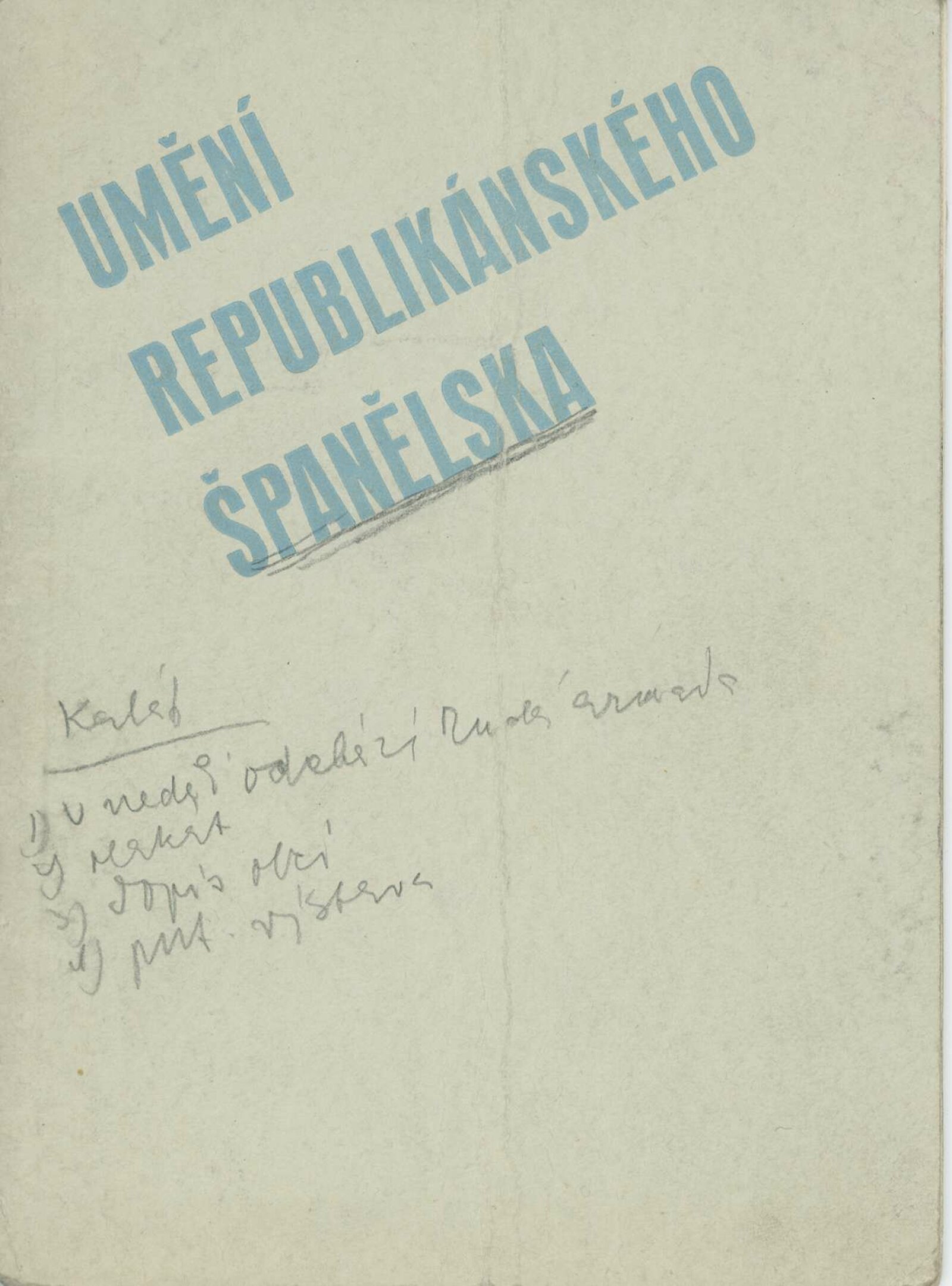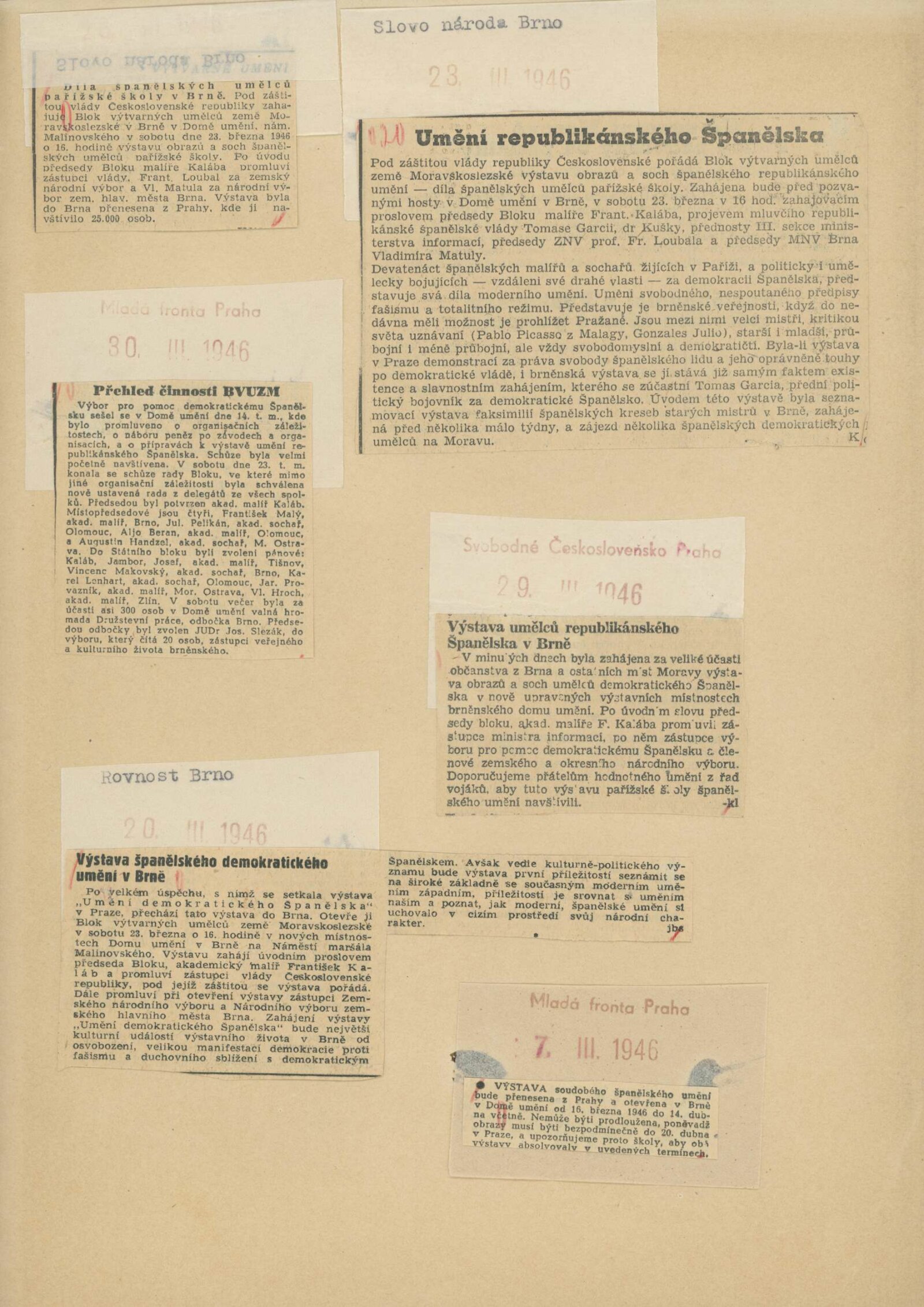 Umění republikánského Španělska. Španělští umělci pařížské školy. Druhá výstava Bloku: Dům umění, 23. 3. – 14. 4. 1946 / Text: Frédéric Delanglade. – Brno: Blok, 1946. – 32 s., obr., básně Paula Éluarda, Tristana Tzary, životní data vystavujících, DU 12. – MG; AMB; MMB