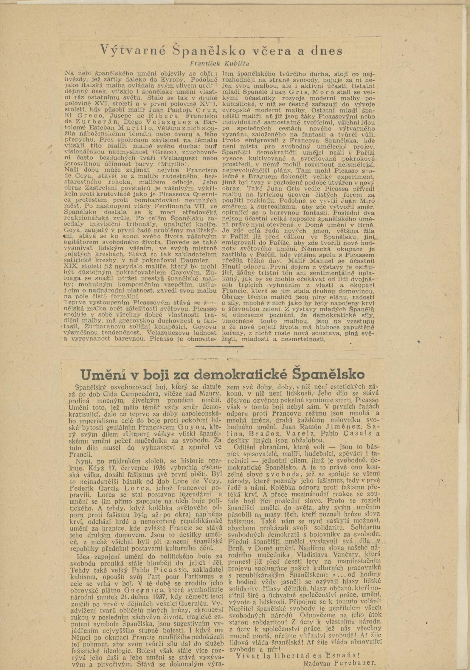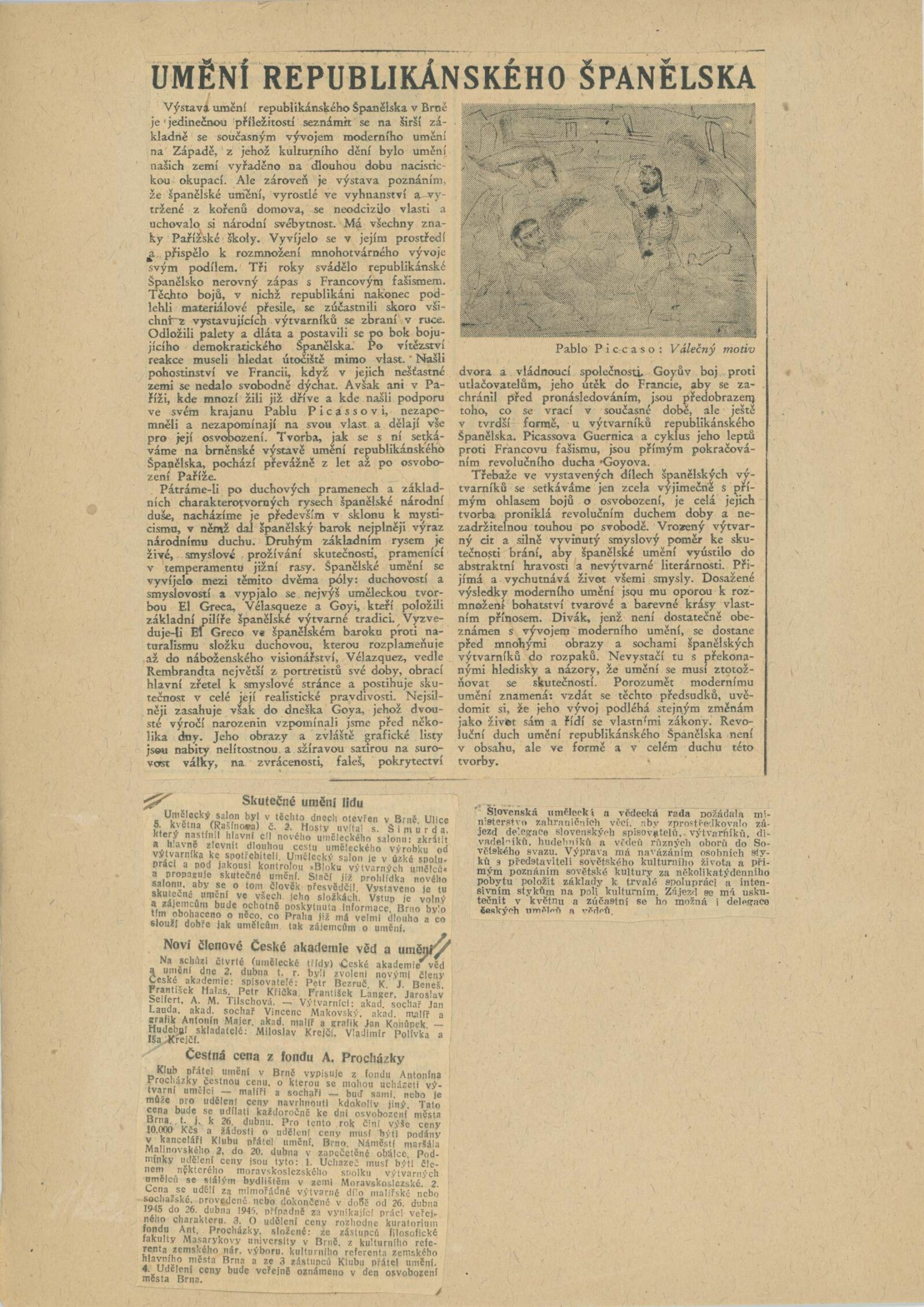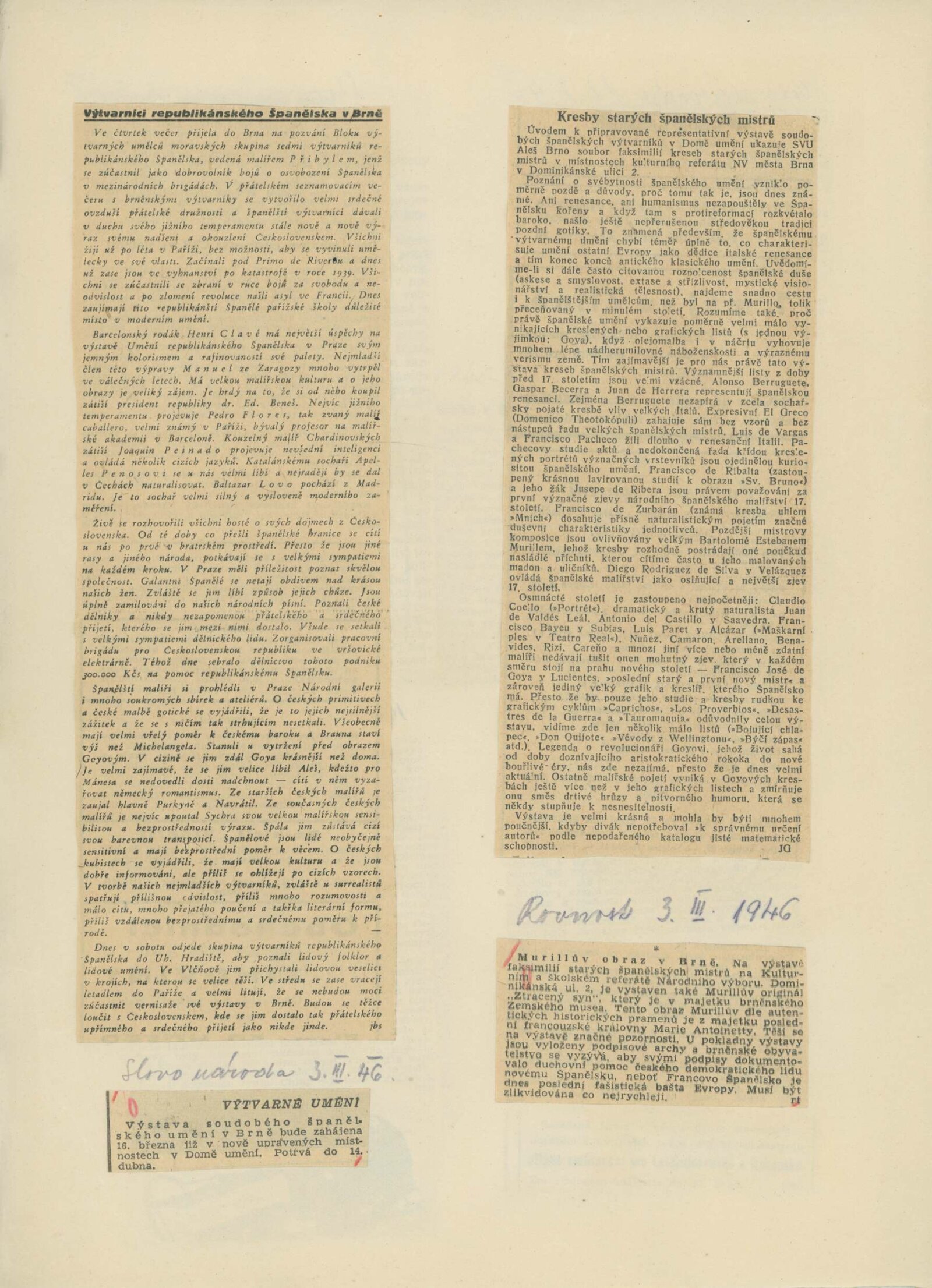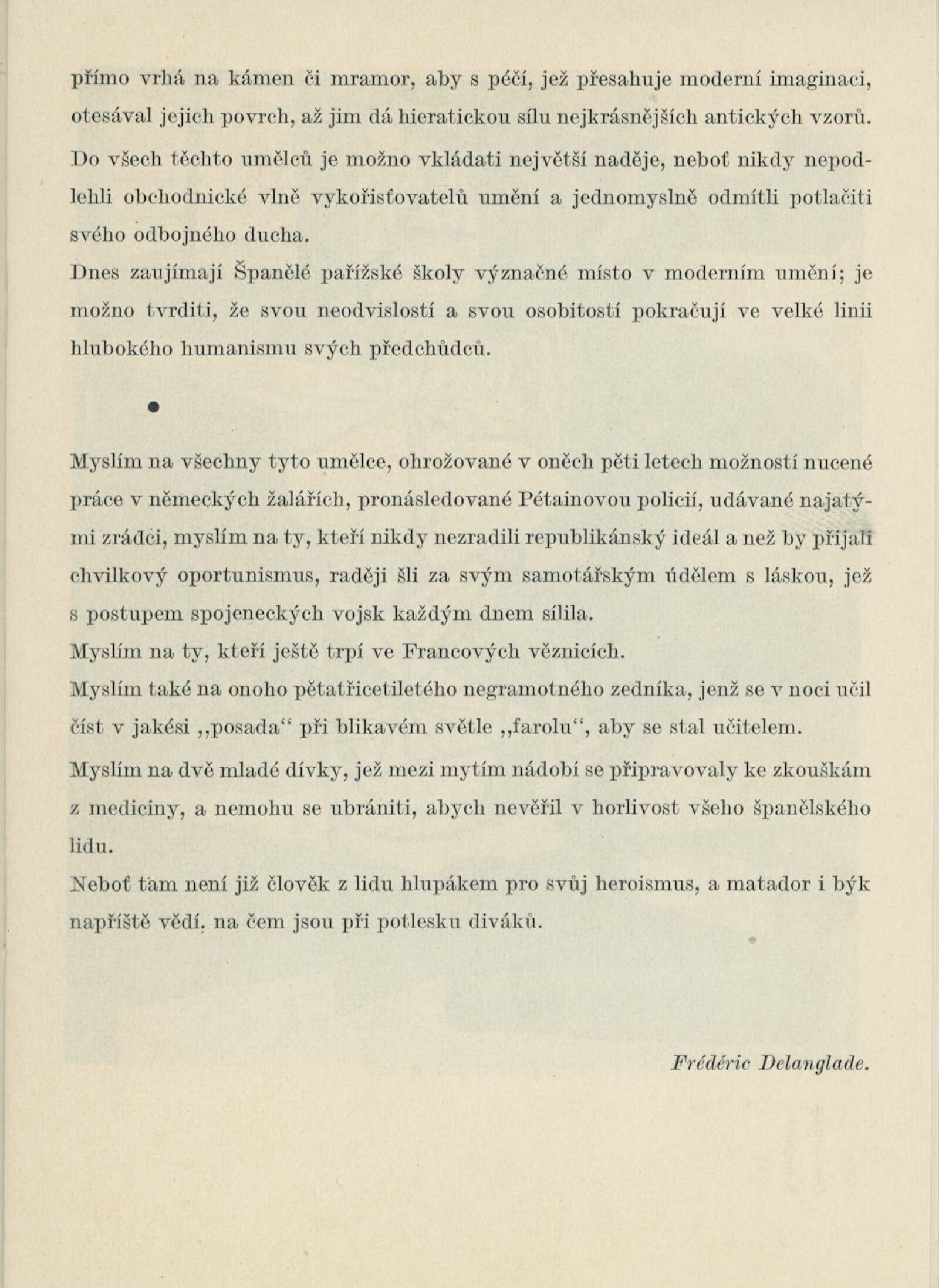 Umění republikánského Španělska. Španělští umělci pařížské školy. Druhá výstava Bloku: Dům umění, 23. 3. – 14. 4. 1946 / Text: Frédéric Delanglade. – Brno: Blok, 1946. – 32 s., obr., básně Paula Éluarda, Tristana Tzary, životní data vystavujících, DU 12. – MG; AMB; MMB