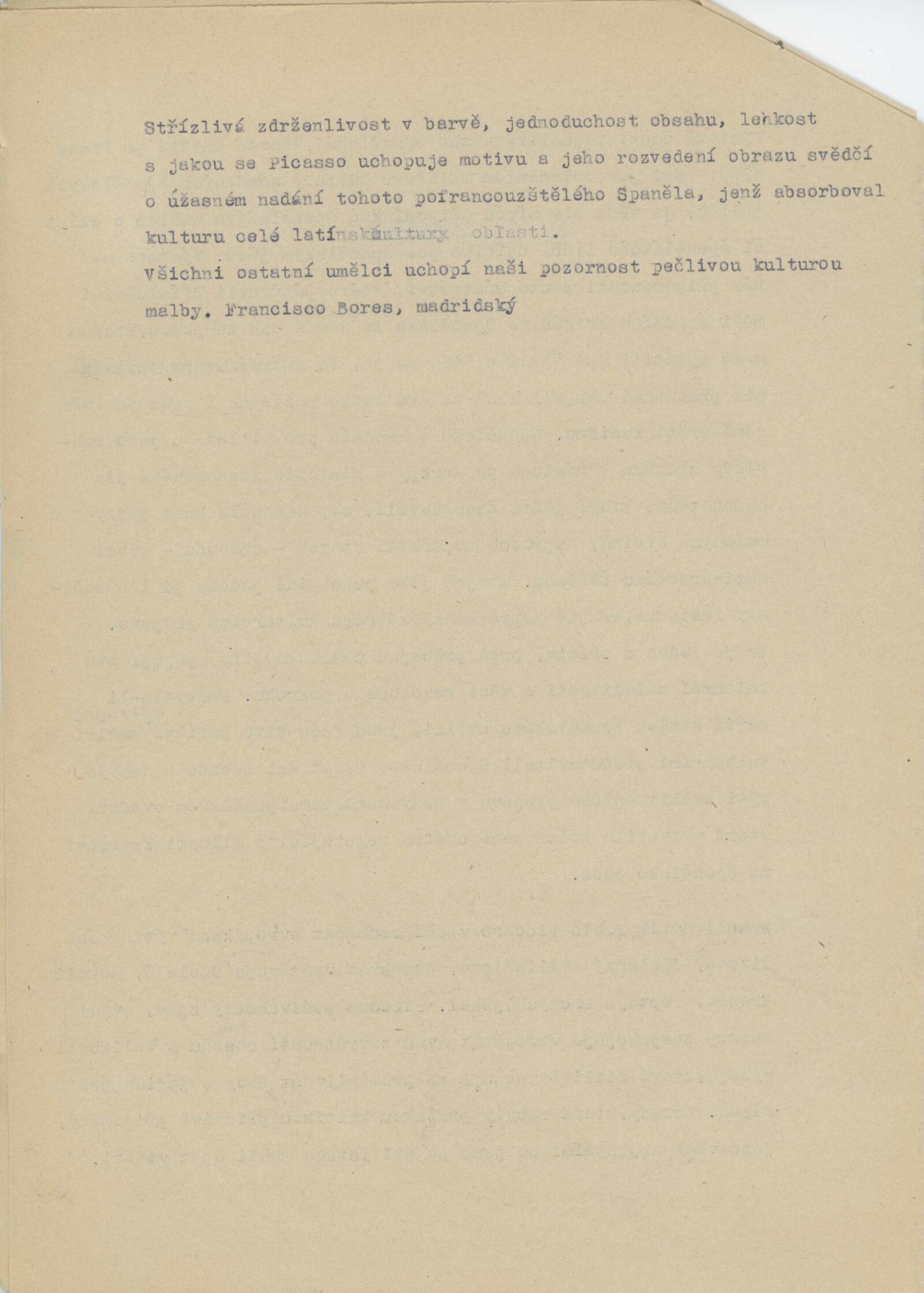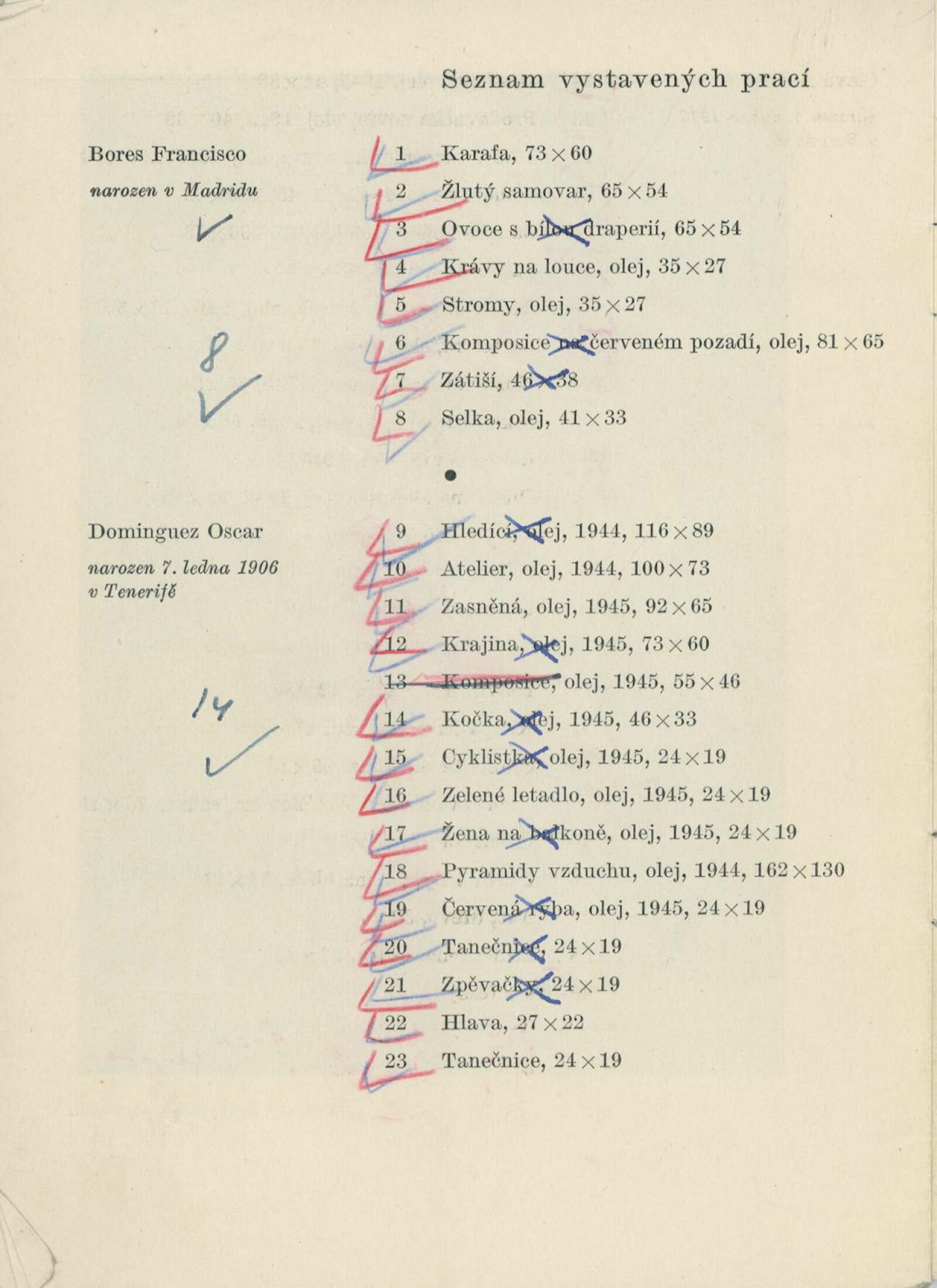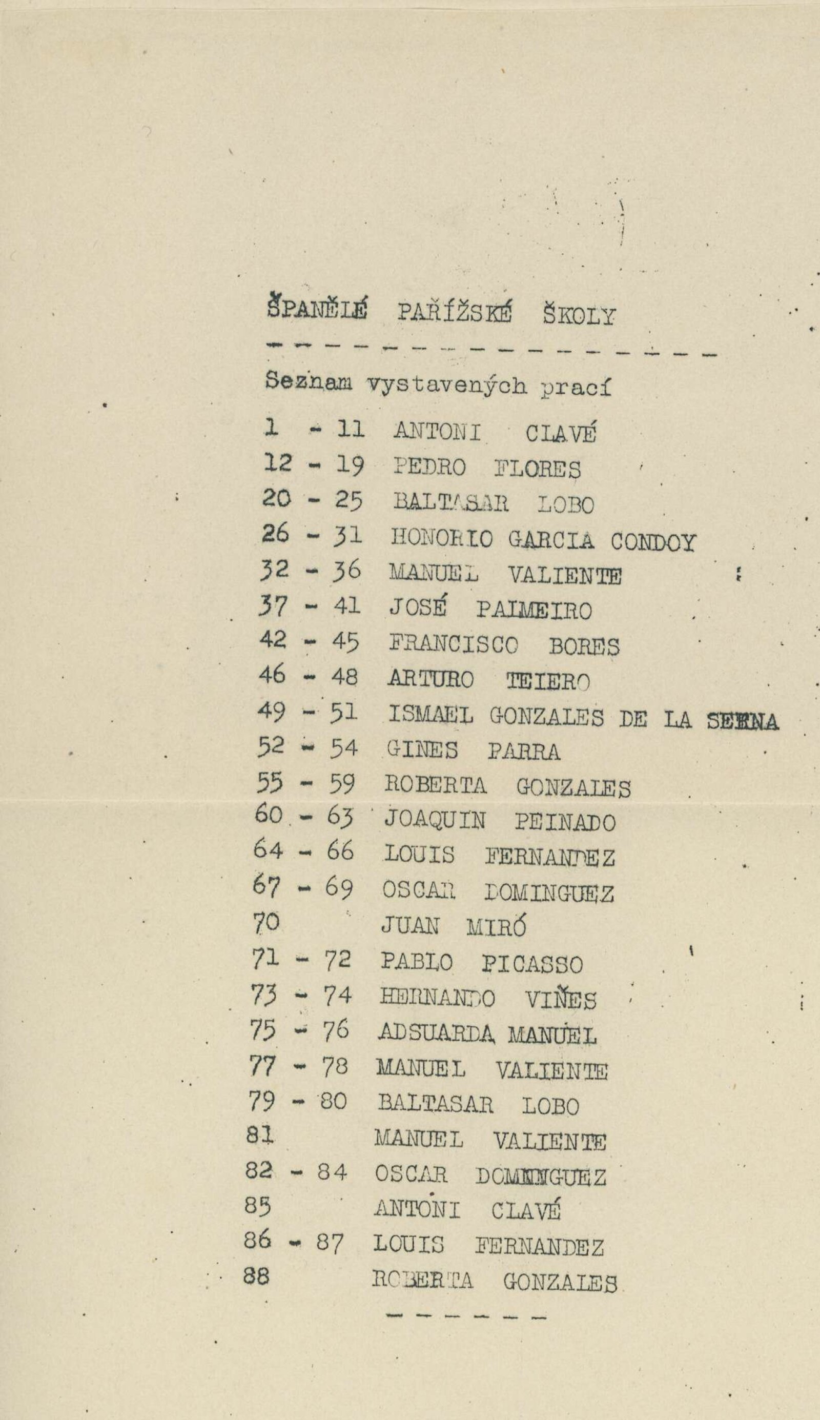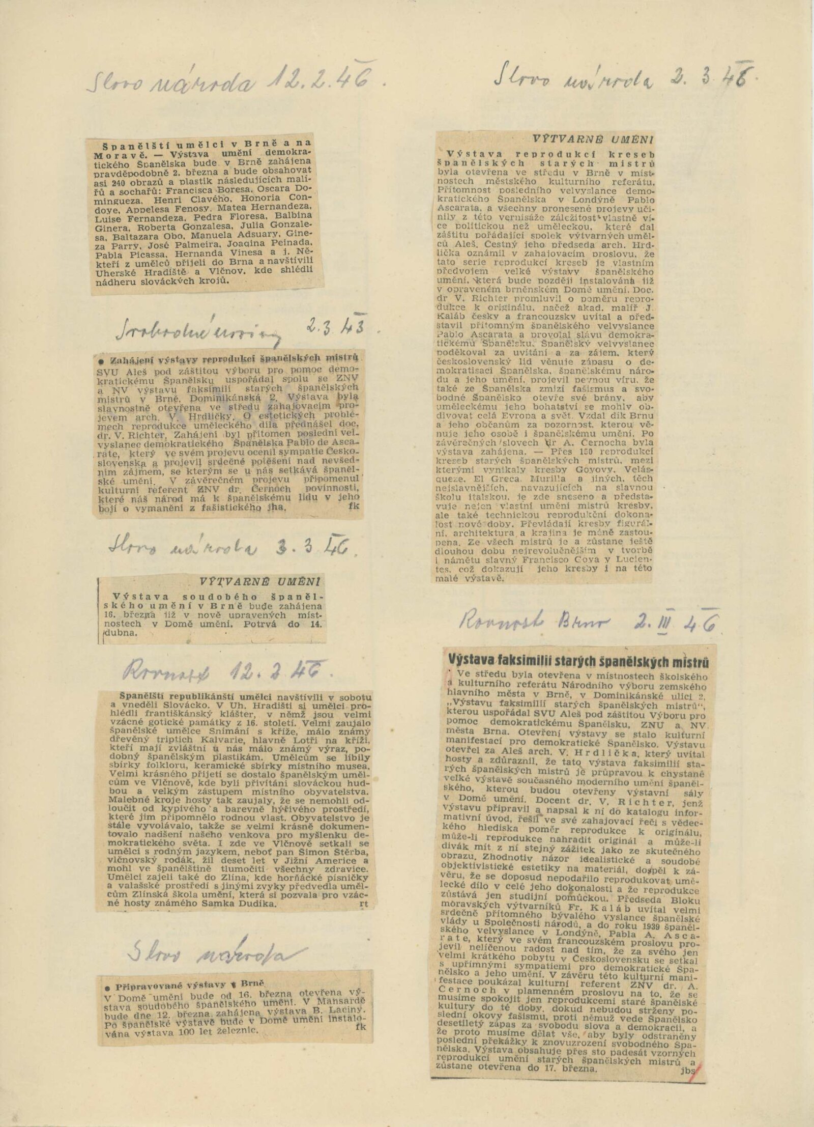 katalog, úvodní proslov, projev T. Garcii, upozornění na výstavu institucím, provozní korespondence, soupisy zakoupených a odebraných obrazů, pojištění, zpráva a korespondence o návštěvě umělců: Antoni Clavé, Manuel Adsuara, Pedro Flores, Joaquin Peinado, Appelles Fenosa, Baltazar Lobo 7. – 11. 2. 1946, pojištění na přepravu, katalog výstavy v budově SVU Mánes, 30. 1. – 23. 5. 1946, potvrzení o převzetí prodaných obrazů, text o výstavě, recenze v tisku