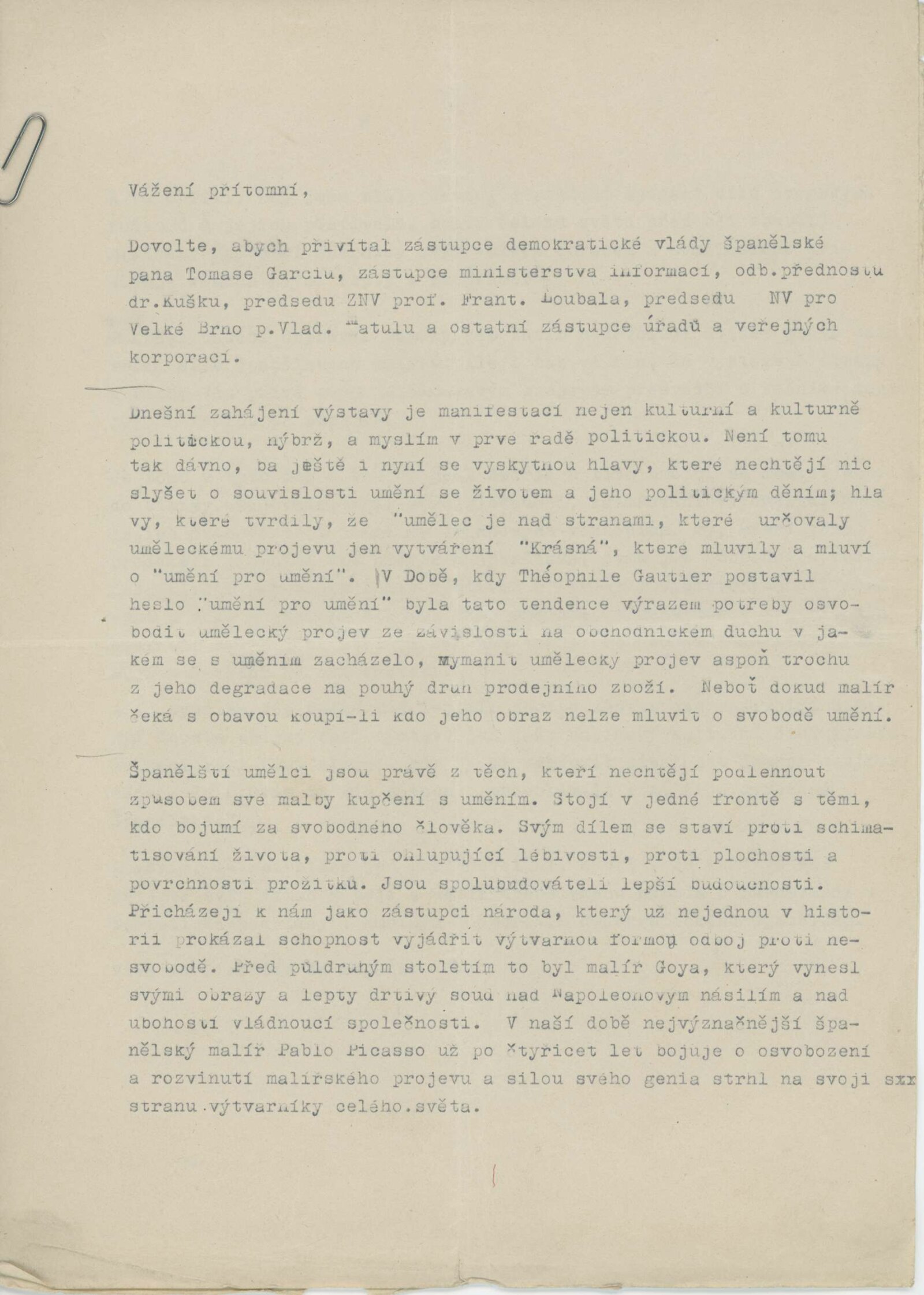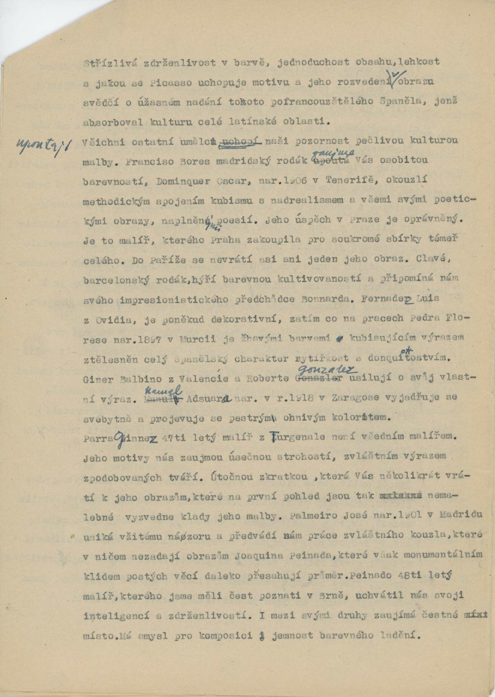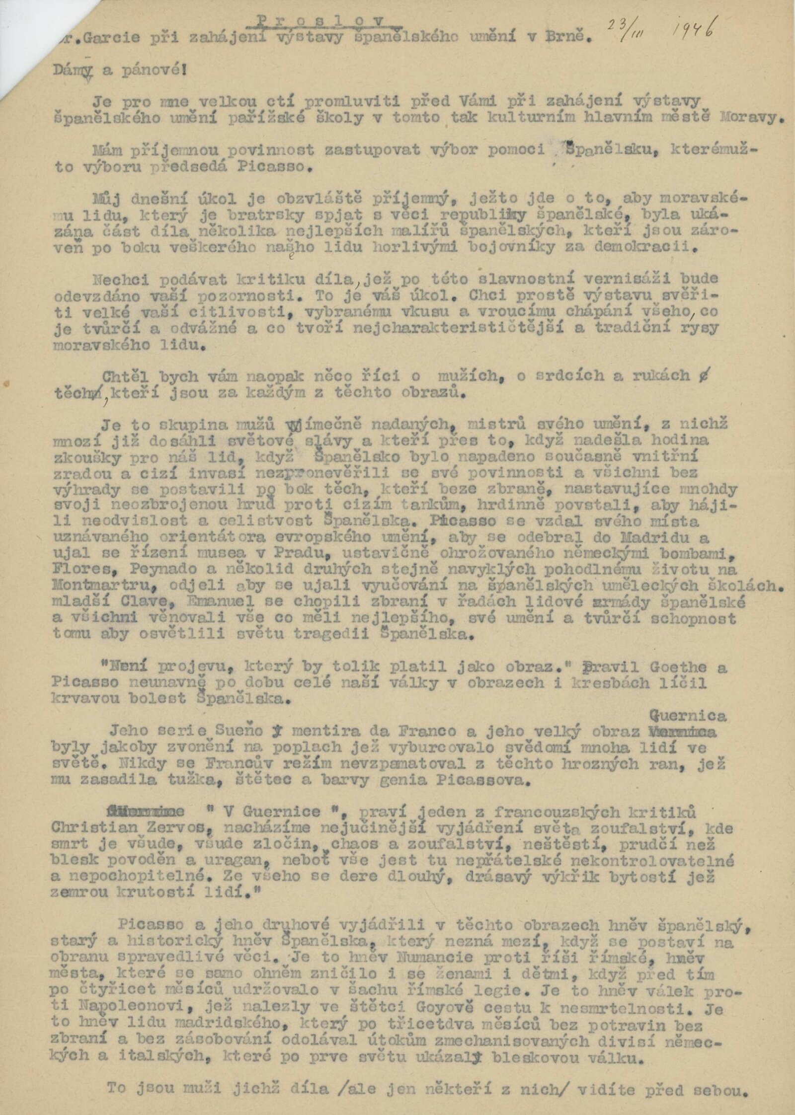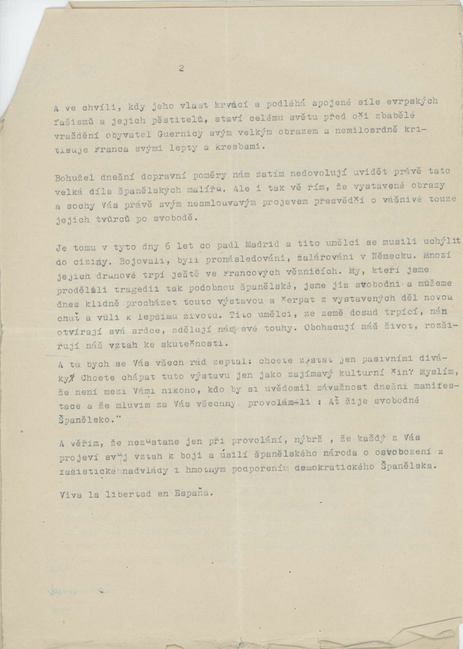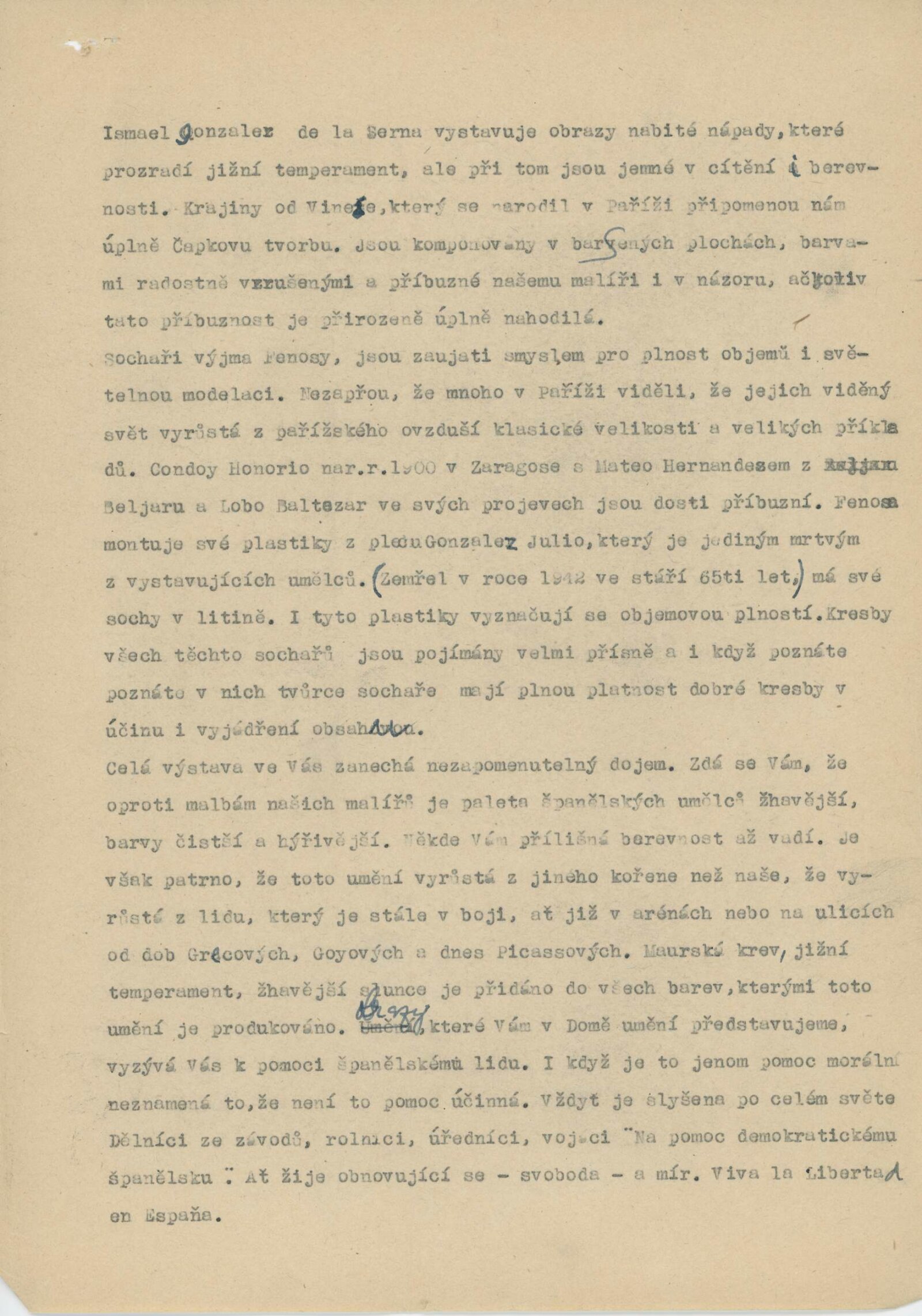 katalog, úvodní proslov, projev T. Garcii, upozornění na výstavu institucím, provozní korespondence, soupisy zakoupených a odebraných obrazů, pojištění, zpráva a korespondence o návštěvě umělců: Antoni Clavé, Manuel Adsuara, Pedro Flores, Joaquin Peinado, Appelles Fenosa, Baltazar Lobo 7. – 11. 2. 1946, pojištění na přepravu, katalog výstavy v budově SVU Mánes, 30. 1. – 23. 5. 1946, potvrzení o převzetí prodaných obrazů, text o výstavě, recenze v tisku