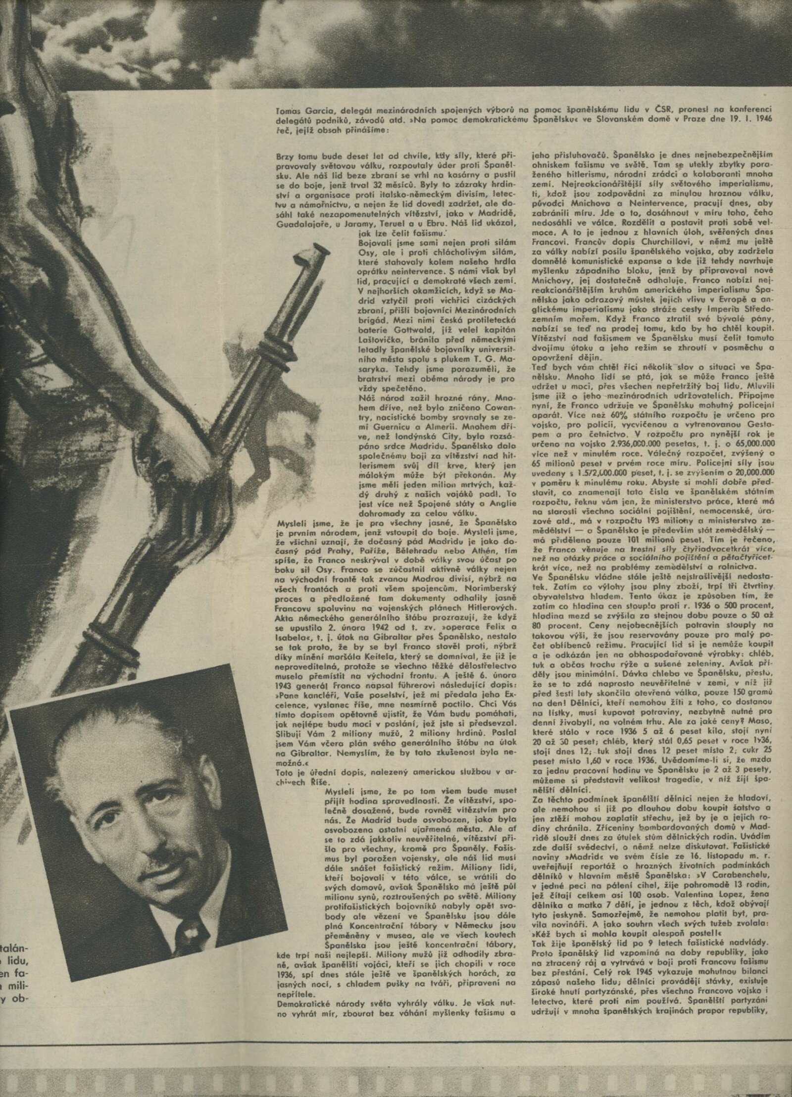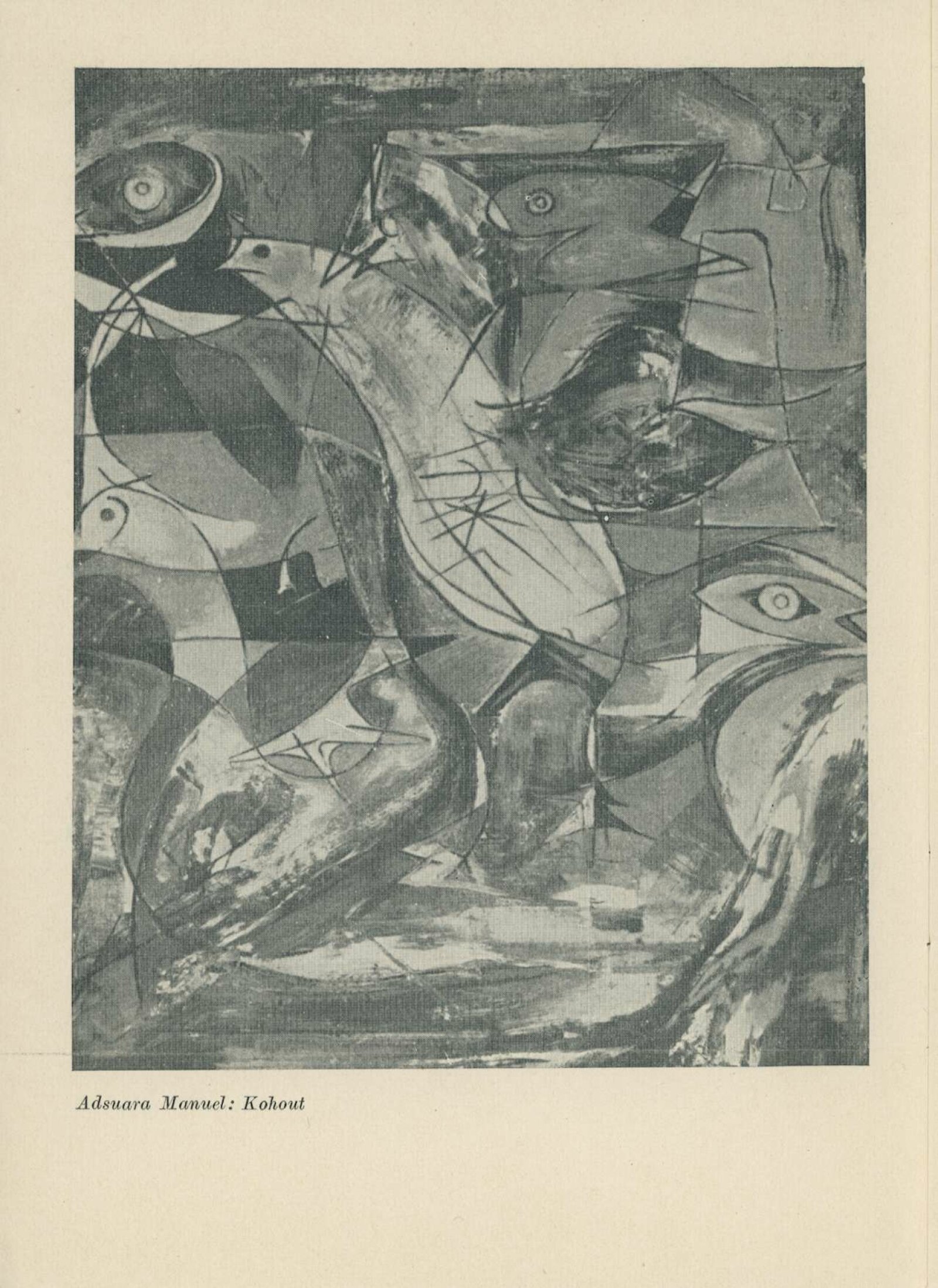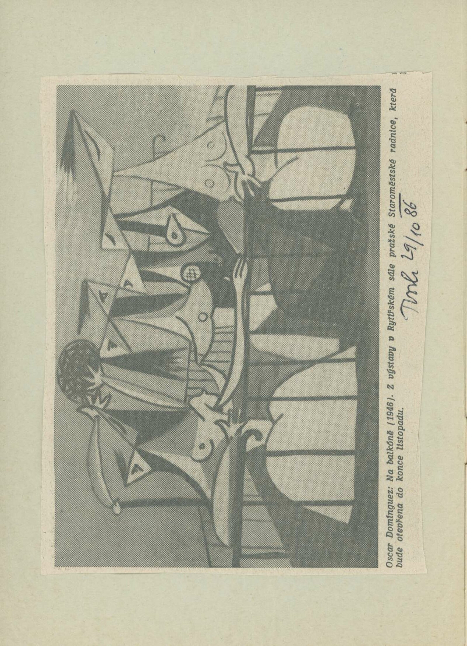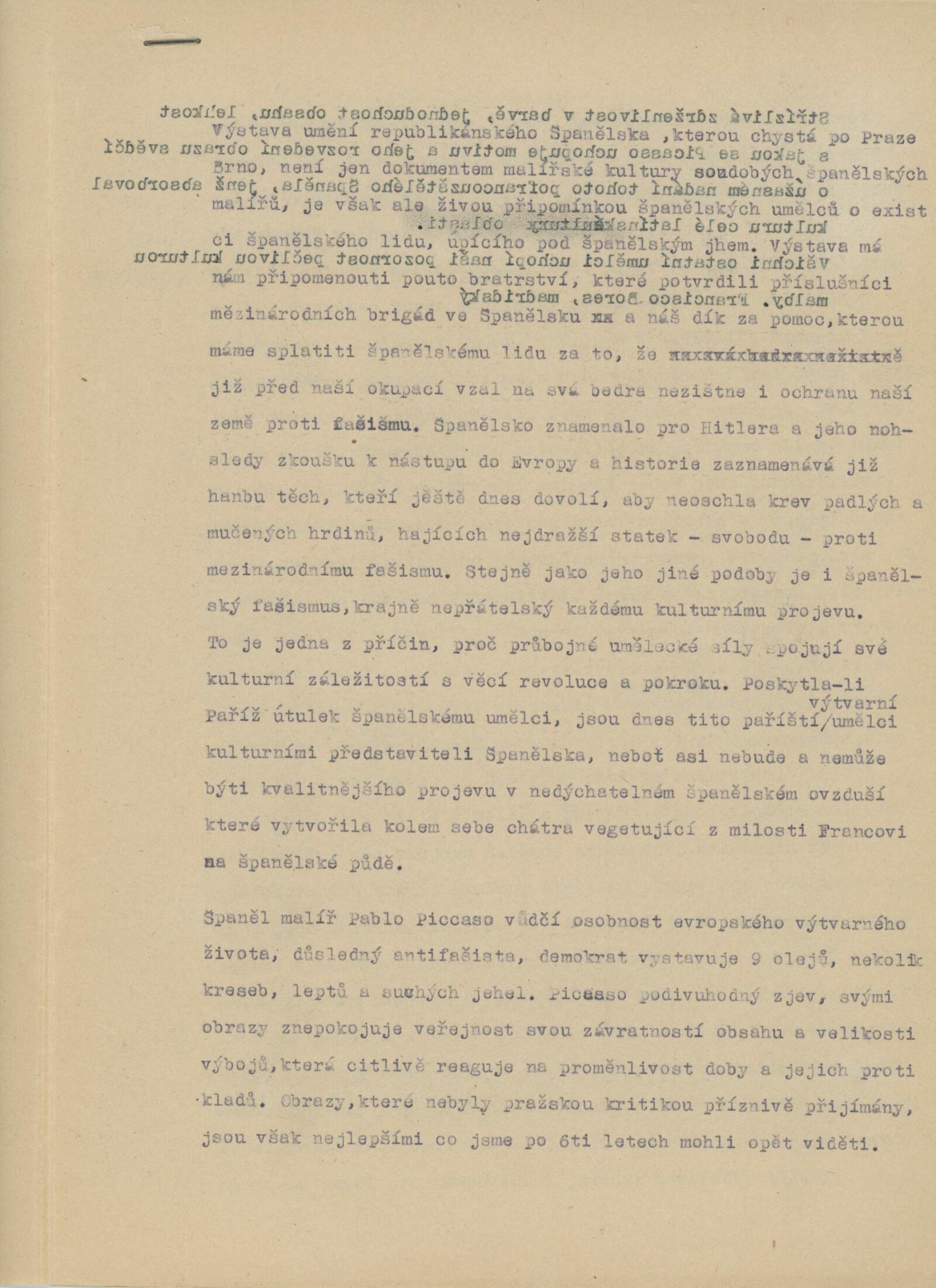katalog, úvodní proslov, projev T. Garcii, upozornění na výstavu institucím, provozní korespondence, soupisy zakoupených a odebraných obrazů, pojištění, zpráva a korespondence o návštěvě umělců: Antoni Clavé, Manuel Adsuara, Pedro Flores, Joaquin Peinado, Appelles Fenosa, Baltazar Lobo 7. – 11. 2. 1946, pojištění na přepravu, katalog výstavy v budově SVU Mánes, 30. 1. – 23. 5. 1946, potvrzení o převzetí prodaných obrazů, text o výstavě, recenze v tisku
