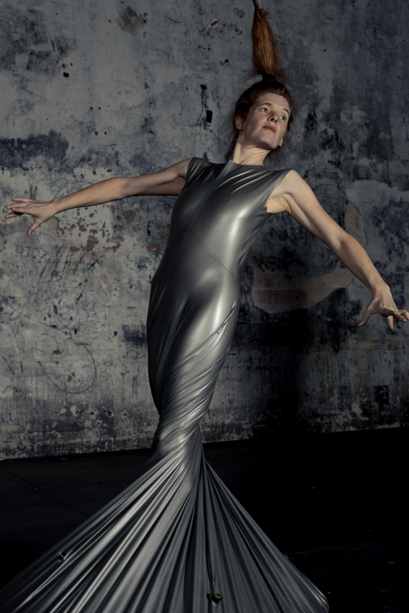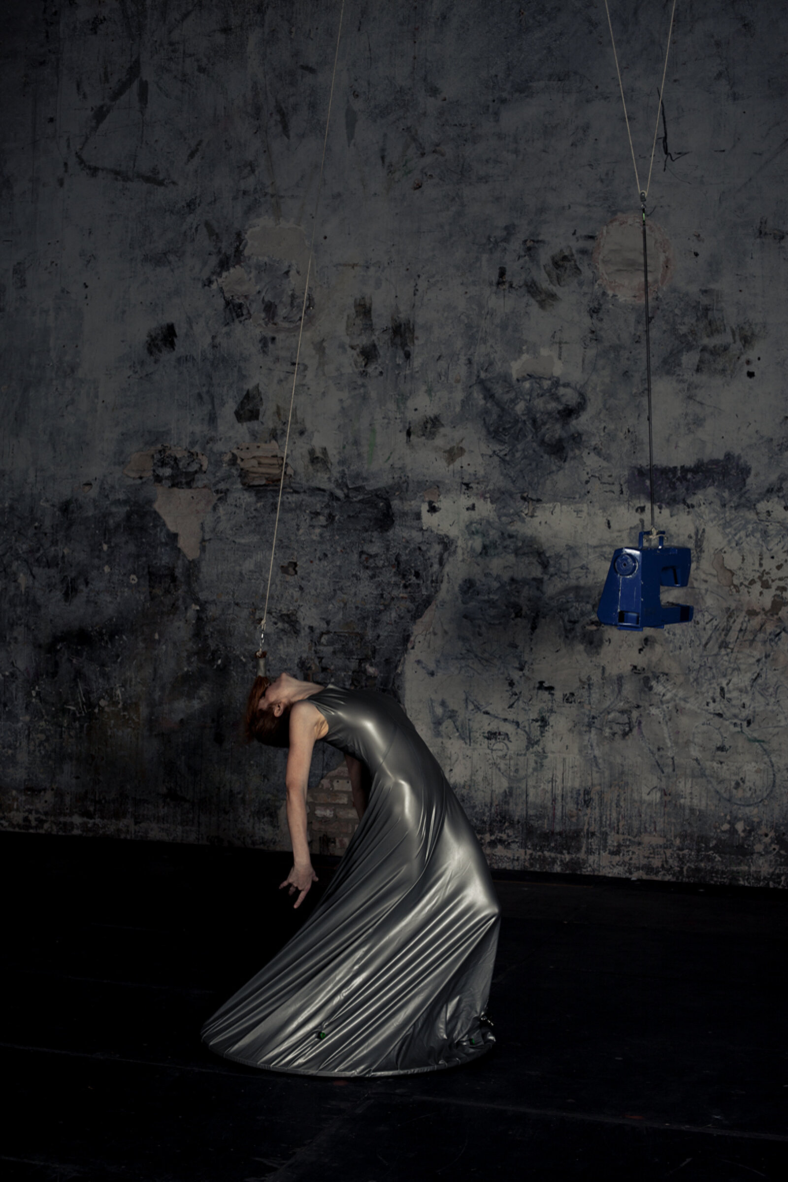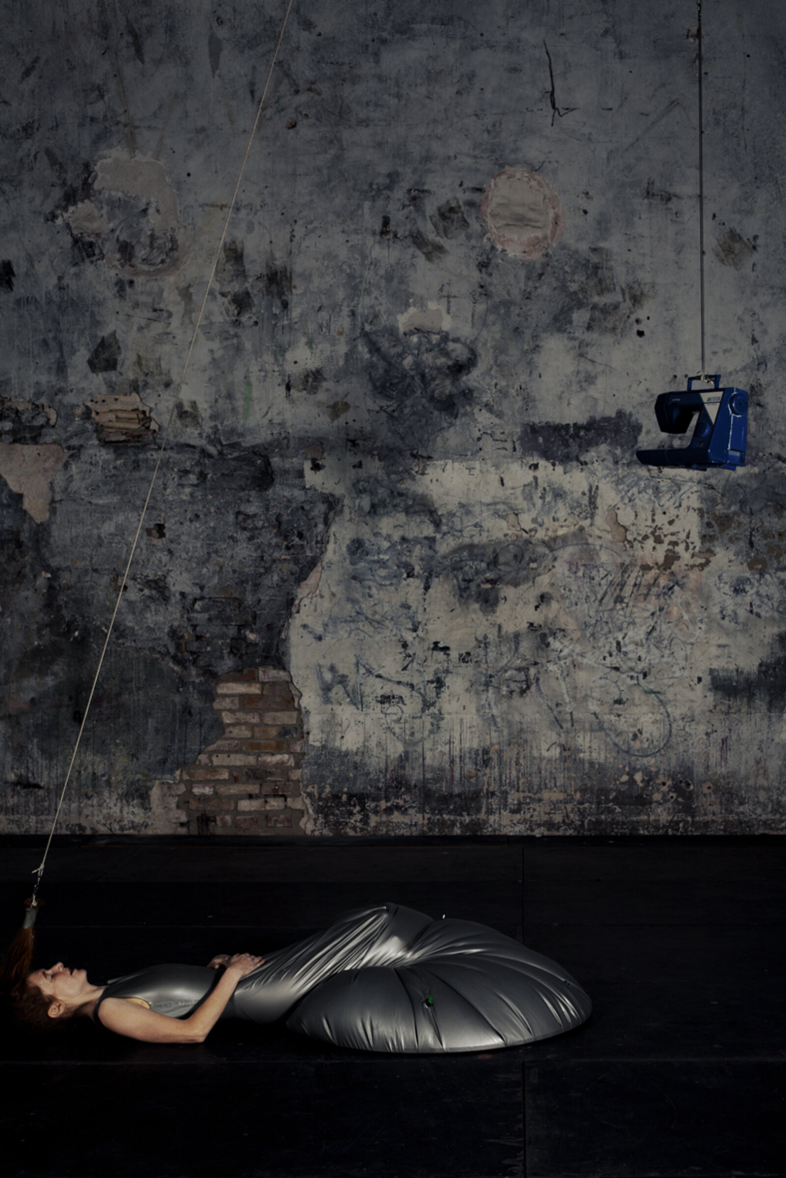 Maren Strack merges dance and sculpture. In her performance Latex, she explores the tension between body and material. She wears a tight latex dress that is attached to the floor, while her hair is suspended by a rope connected to the ceiling. At the other end of the rope hangs a sewing machine, which moves up and down in response to her movements. Her dance style blends elements of flamenco and disco. The elasticity of the latex allows movement to stretch and snap back, creating a dynamic interplay between motion and material resistance. The sounds are produced live on stage—the dress creaks and stretches, the sewing machine clicks, and small sirens hidden in the dress are “played” by Maren using her breath. It’s a performance about balance, strength, and playfulness—and about everything the body can express in connection with material.