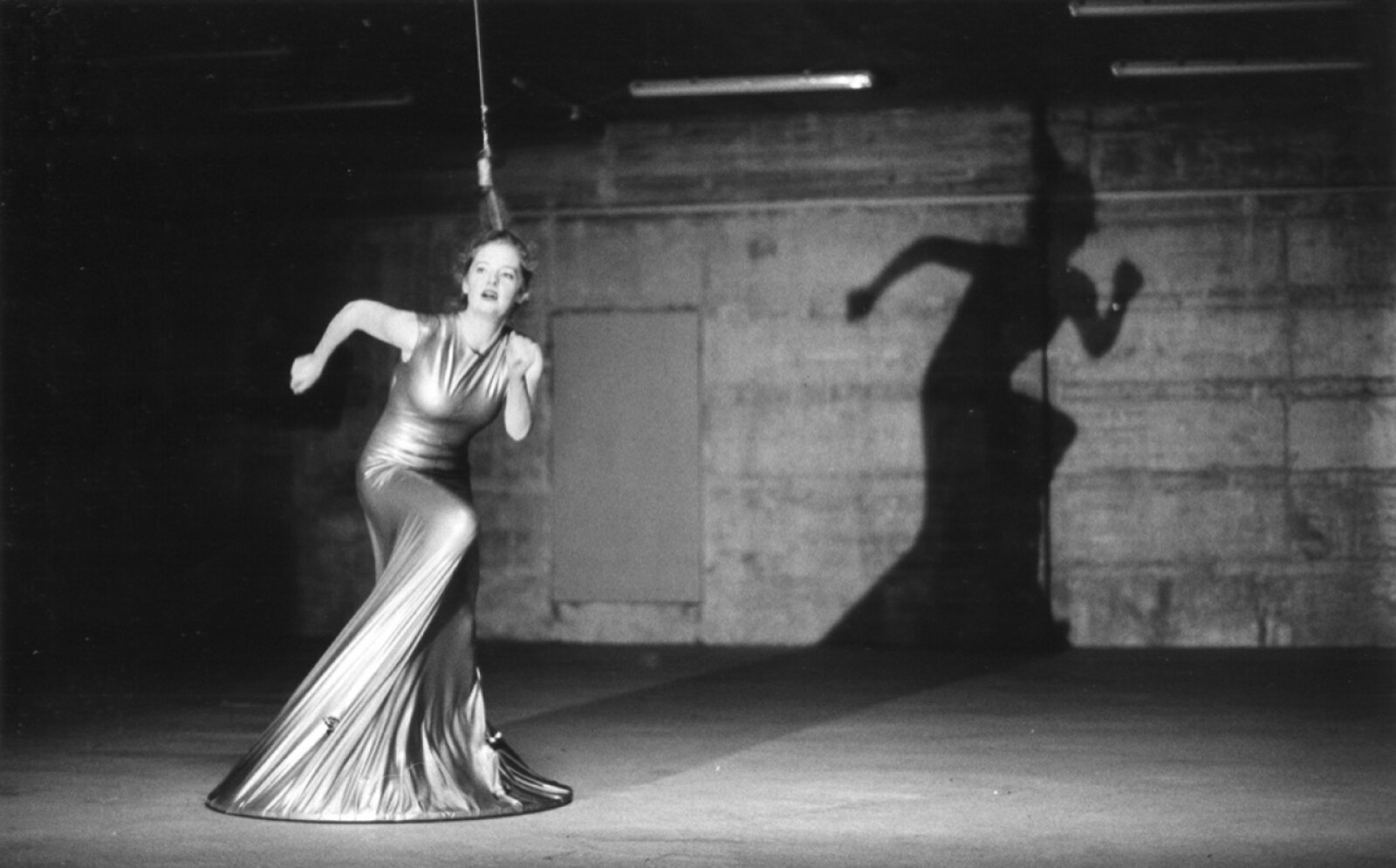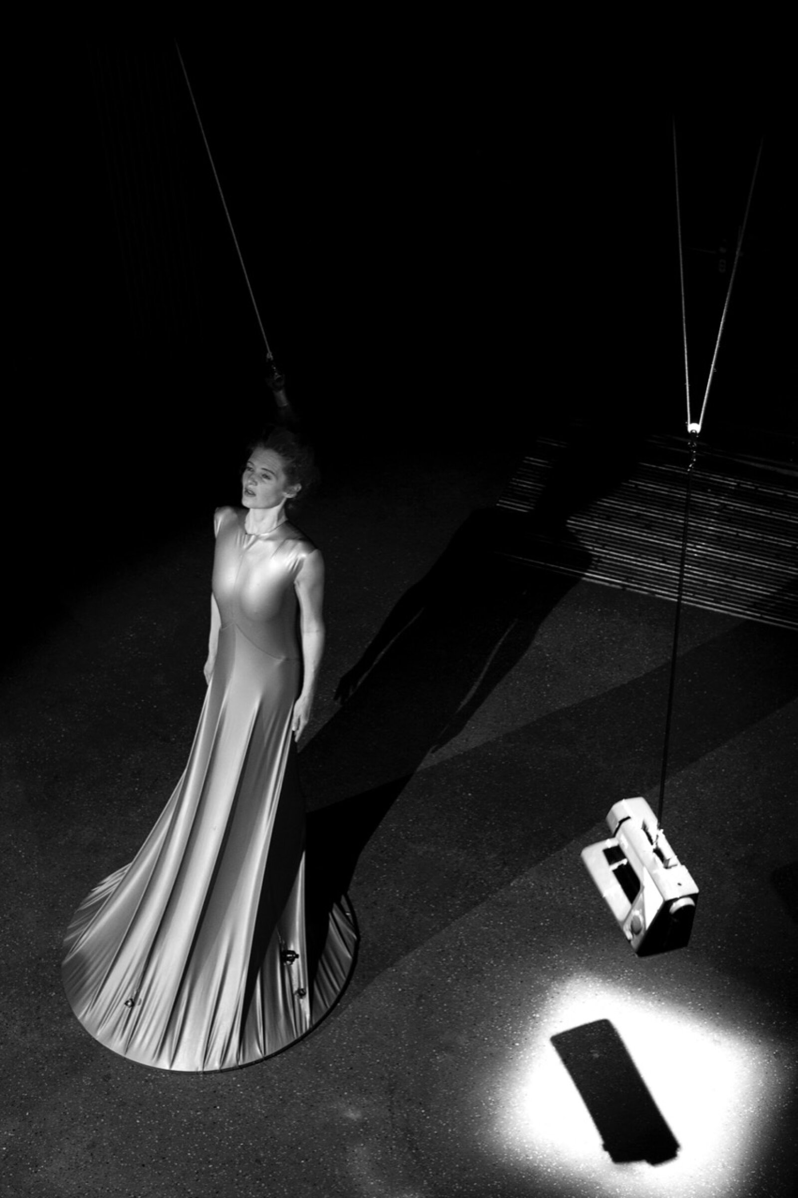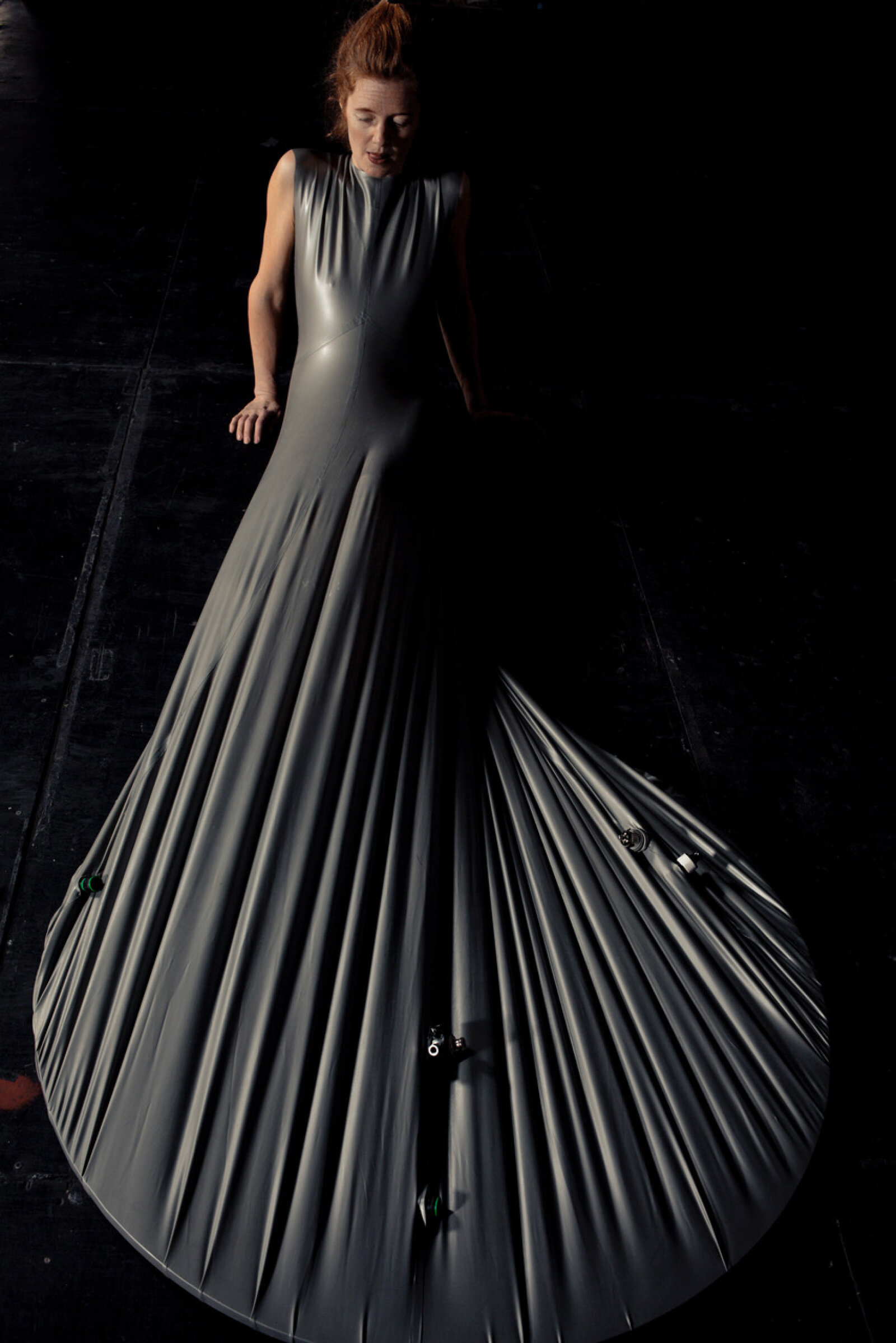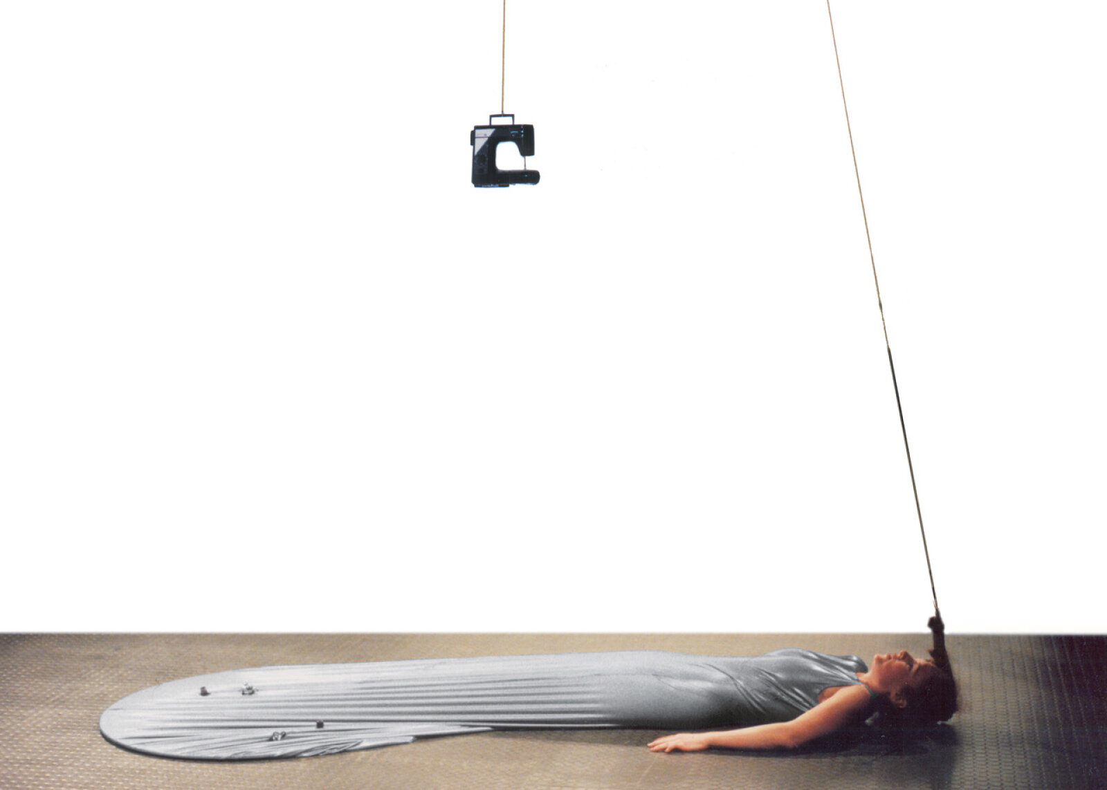 Maren Strack merges dance and sculpture. In her performance Latex, she explores the tension between body and material. She wears a tight latex dress that is attached to the floor, while her hair is suspended by a rope connected to the ceiling. At the other end of the rope hangs a sewing machine, which moves up and down in response to her movements. Her dance style blends elements of flamenco and disco. The elasticity of the latex allows movement to stretch and snap back, creating a dynamic interplay between motion and material resistance. The sounds are produced live on stage—the dress creaks and stretches, the sewing machine clicks, and small sirens hidden in the dress are “played” by Maren using her breath. It’s a performance about balance, strength, and playfulness—and about everything the body can express in connection with material.