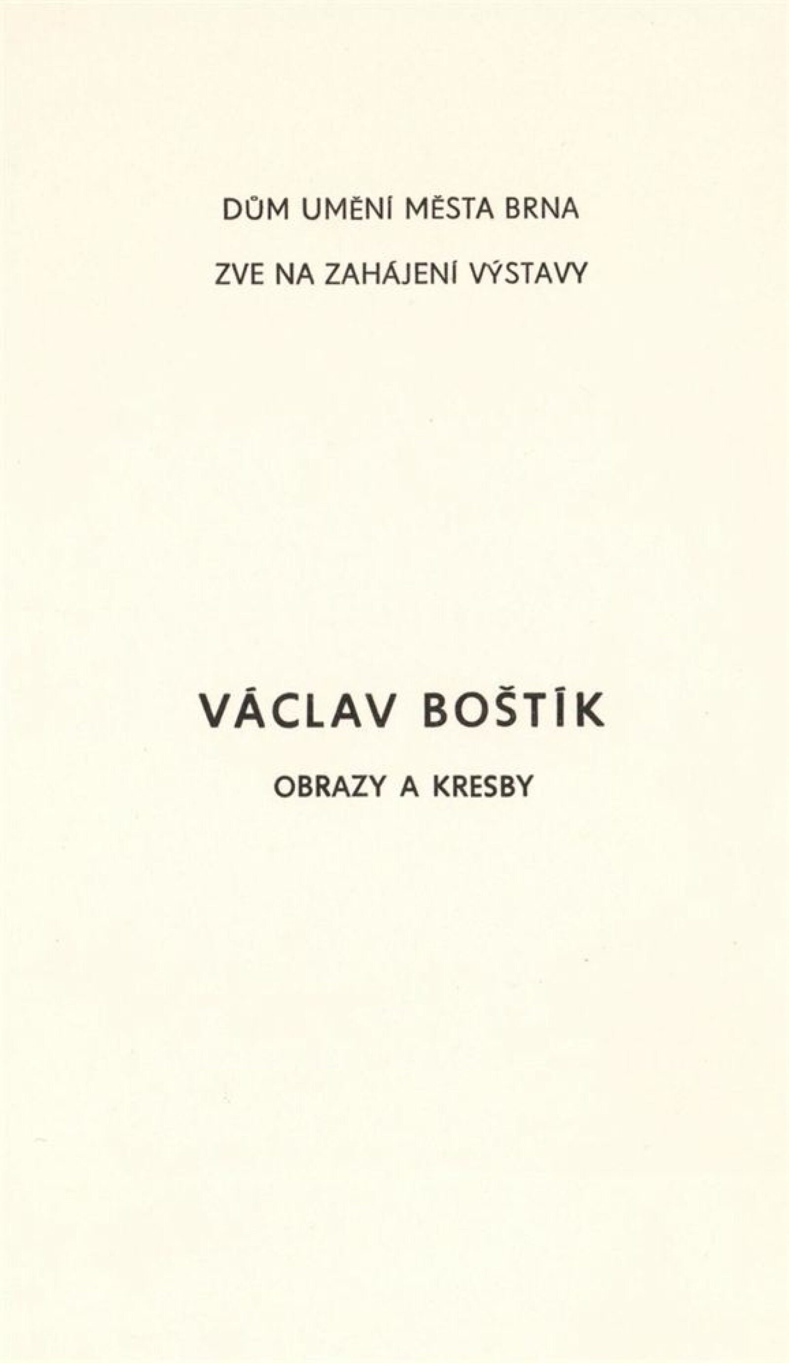 Václav Boštík: Dům umění / Dům pánů z Kunštátu, 8. 9. – 11. 10. 1987 / Text: Jiří Valoch. – Brno: DUmB, 1987. – [28] s., obr., životní data, výstavy, zastoupení ve sbírkách, DPK 897. – MZK; MG; MMB