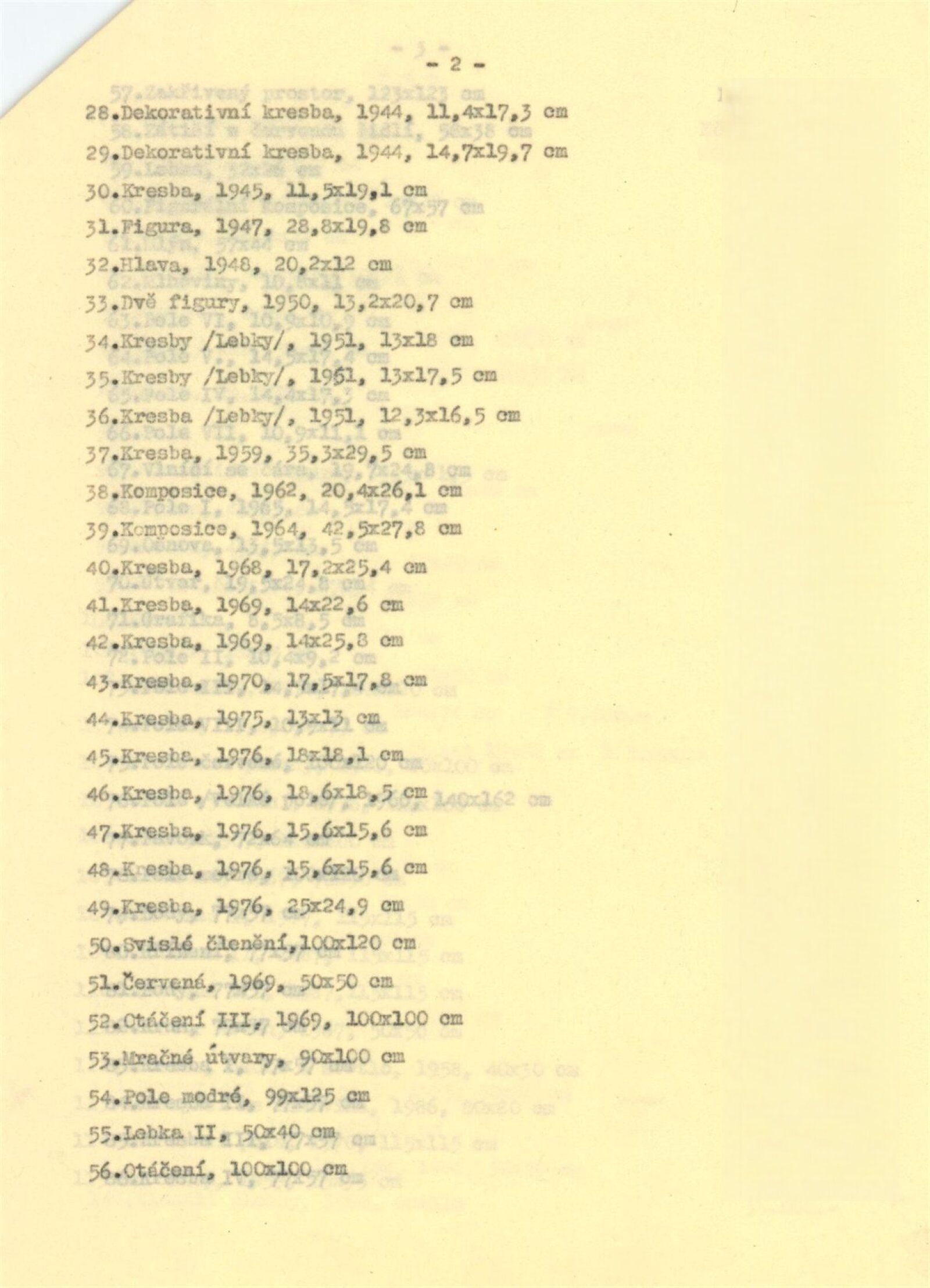 pozvánka, katalog, strojopis, poznámky, fotografie výstavy, seznam vystavených děl, pojistný seznam, provozní korespondence, smlouva o výpůjčce, potvrzení o převzetí, reversy, hospodářská smlouva, žádost o povolení výstavy, recenze v tisku