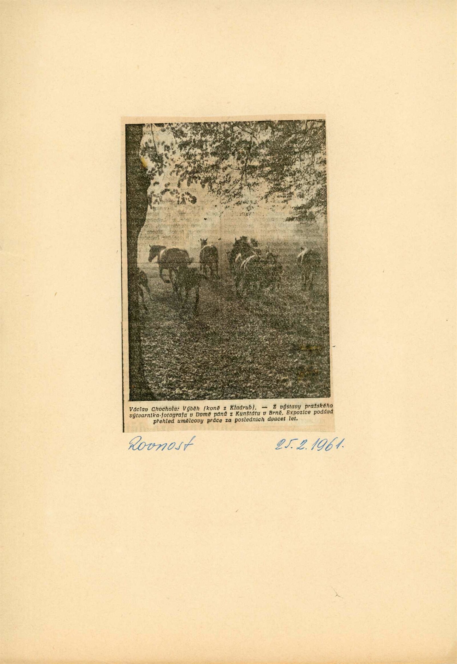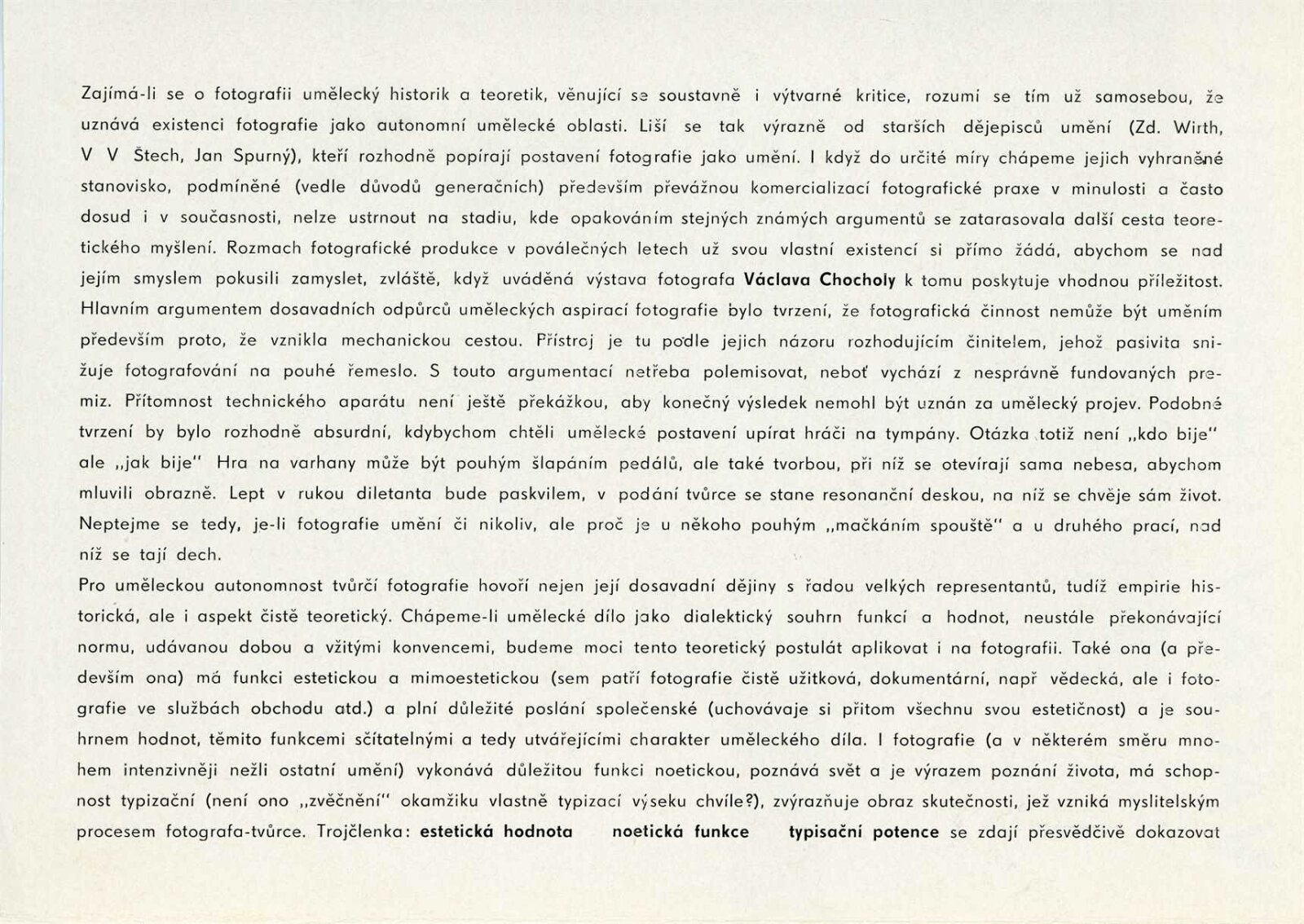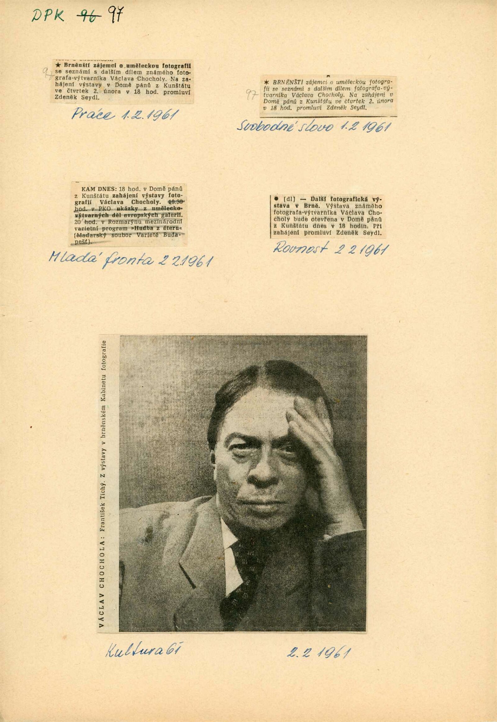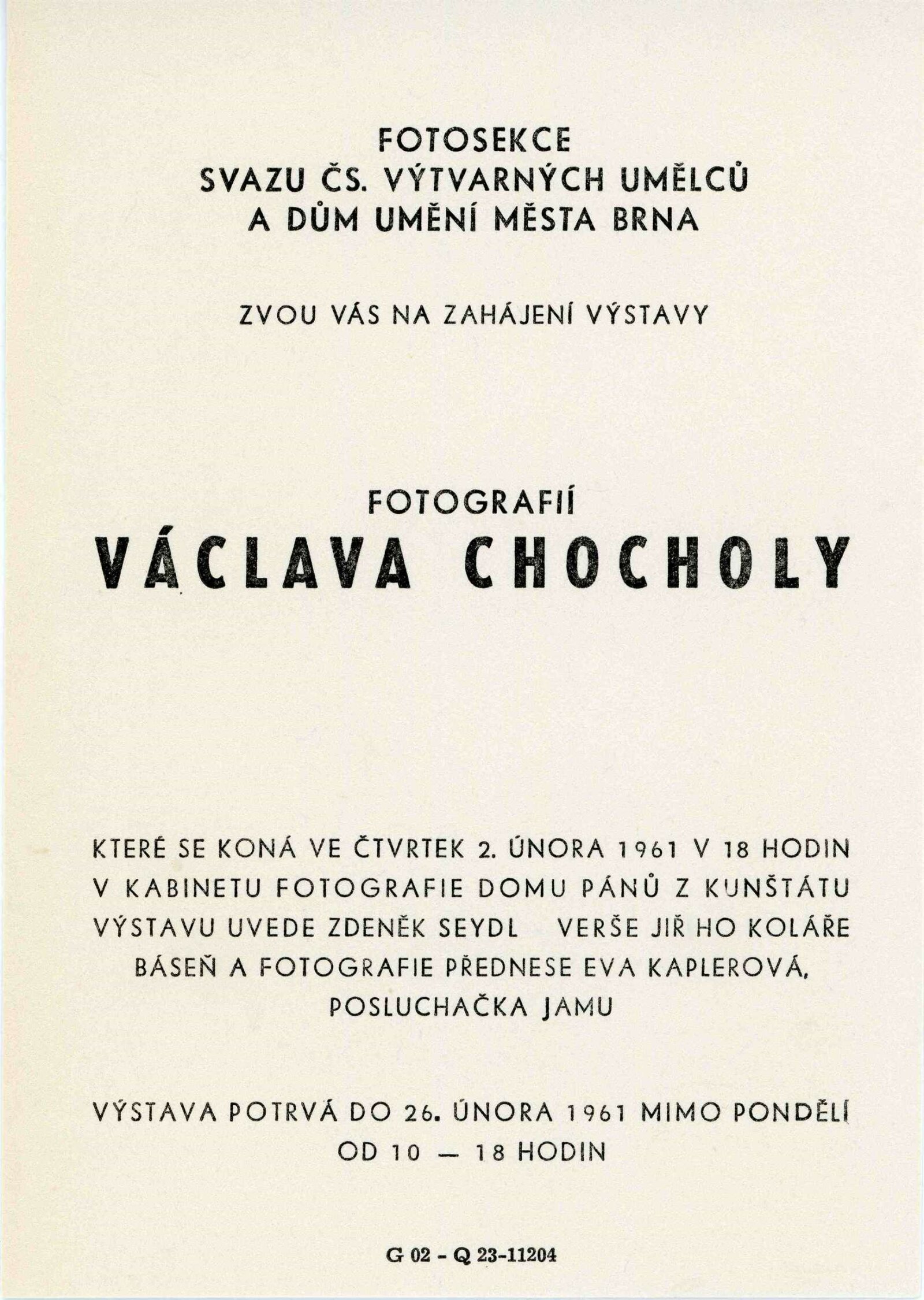 Václav Chochola: Dům umění města Brna / Dům pánů z Kunštátu, 20. výstava Kabinetu fotografie Jaromíra Funka, 2. 2. – 26. 2. 1961 / Text: Luboš Hlaváček. – Brno: DUmB, 1961. – skládačka, 6 s., obr., DPK 97. – MG