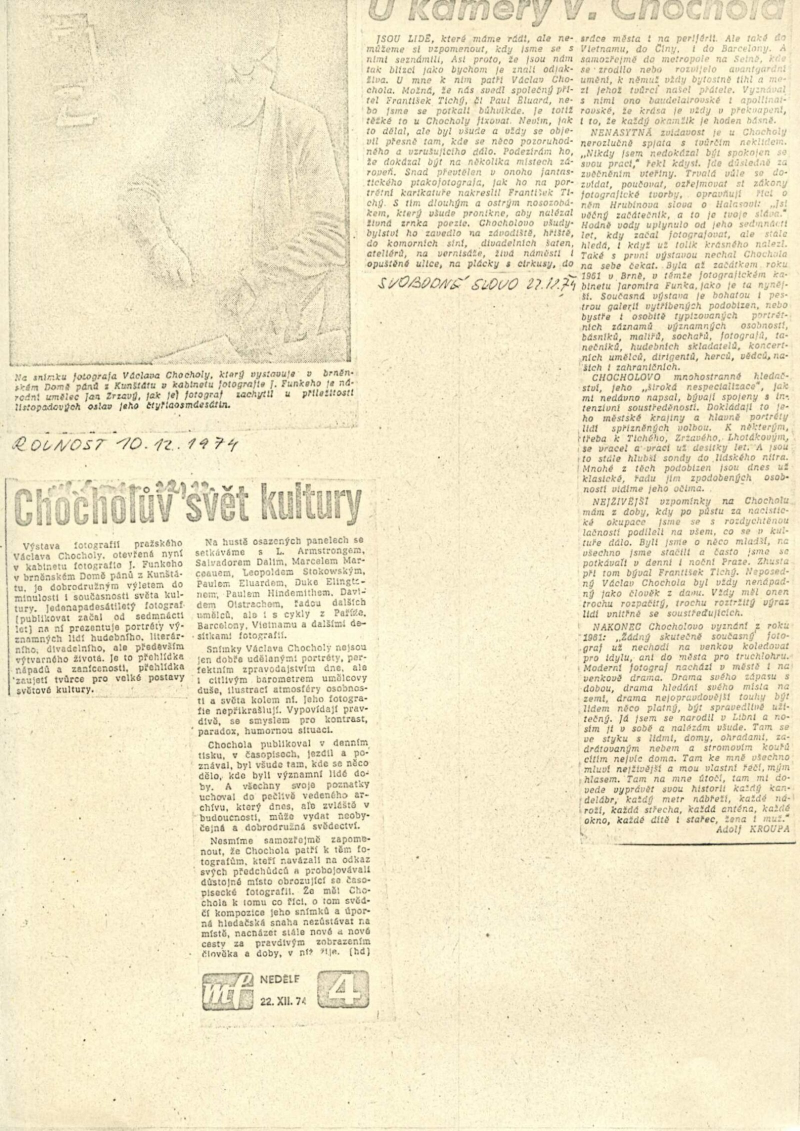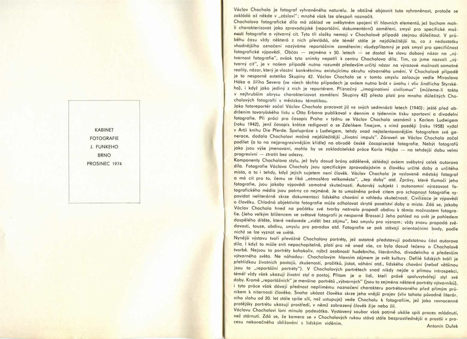 Václav Chochola. Osobnosti, fotografické mozaiky a passiance, fotoarchiv: Dům umění / Dům pánů z Kunštátu, Kabinet fotografie Jaromíra Funka, prosinec 1974 / Text: Antonín Dufek. – Brno: DUmB, 1974. – 16 s., obr., seznam portrétovaných 2 s., životní data, výstavy, DPK 584a. – MZK