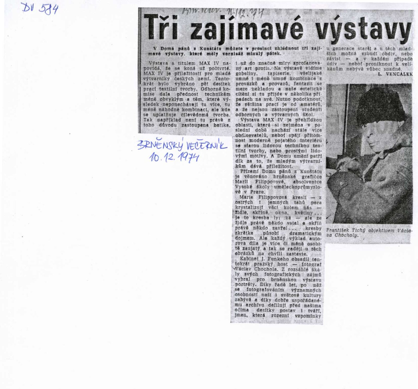 společná pozvánka DPK 582, 583 a 584a, katalog, seznam vystavených prací, hlášení o vernisážích, smlouva k výstavě, provozní korespondence (termín výstavy: Václav Chochola / DU), vyjádření MG v Brně, dopis Václava Chocholy – termín výstavy v Kabinetu fotografie, žádost o povolení výstavy, recenze v tisku