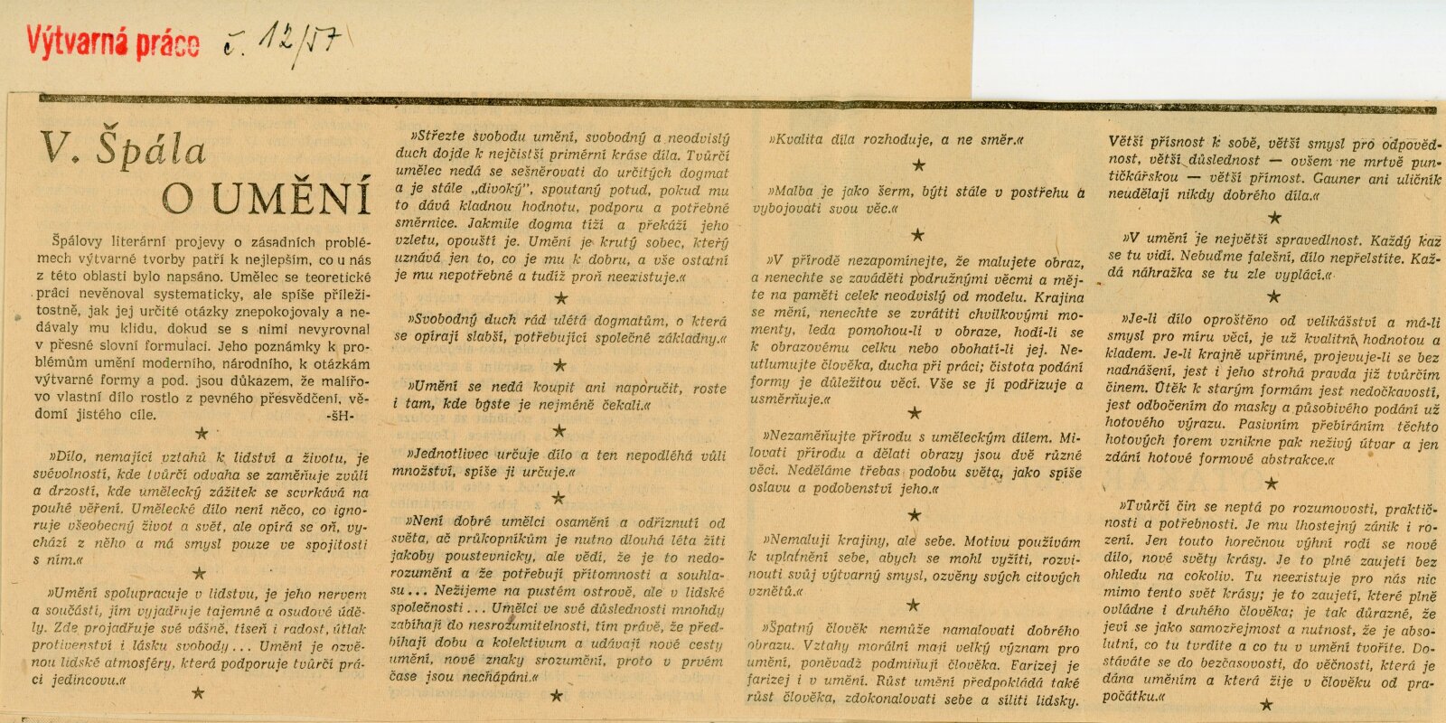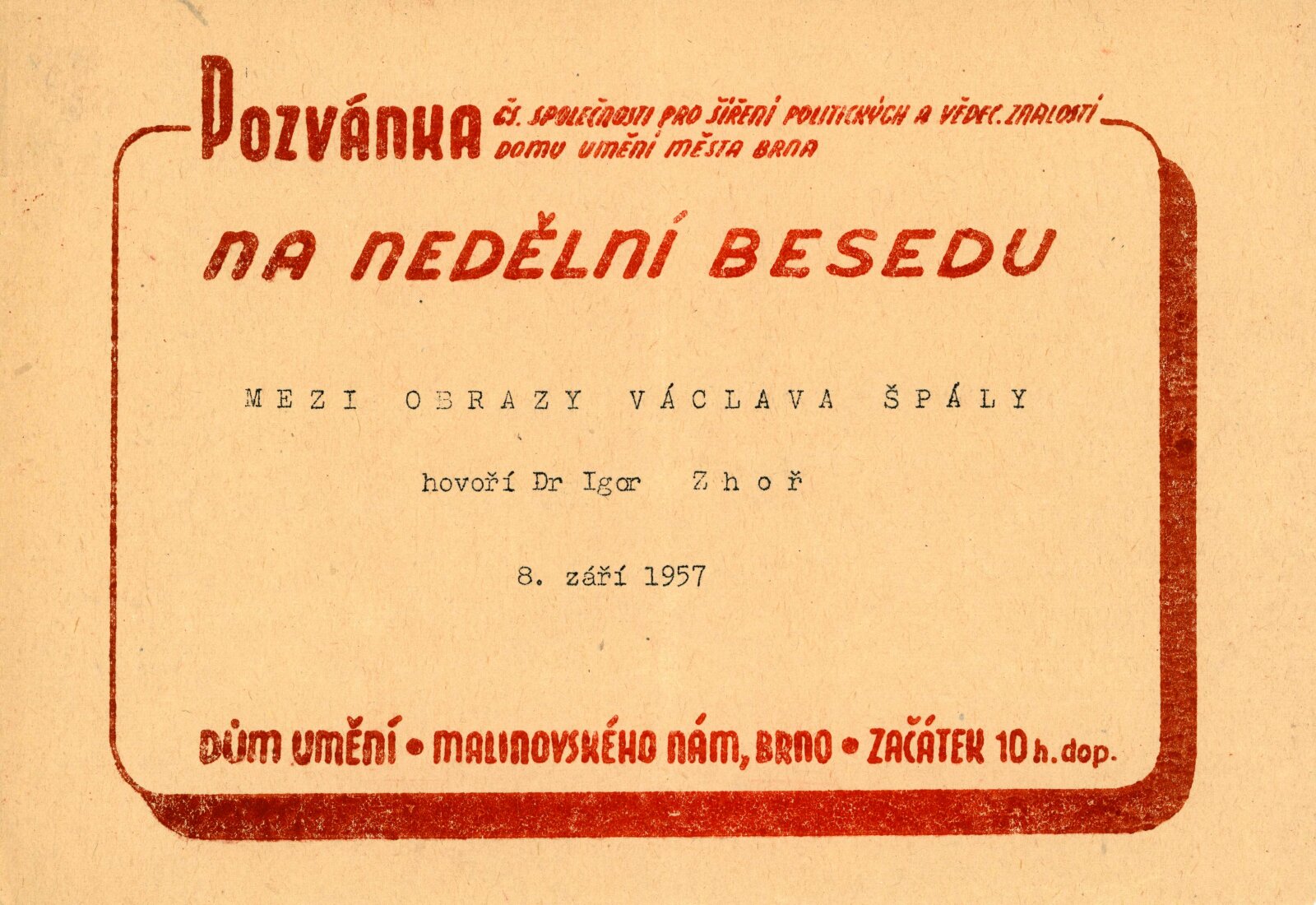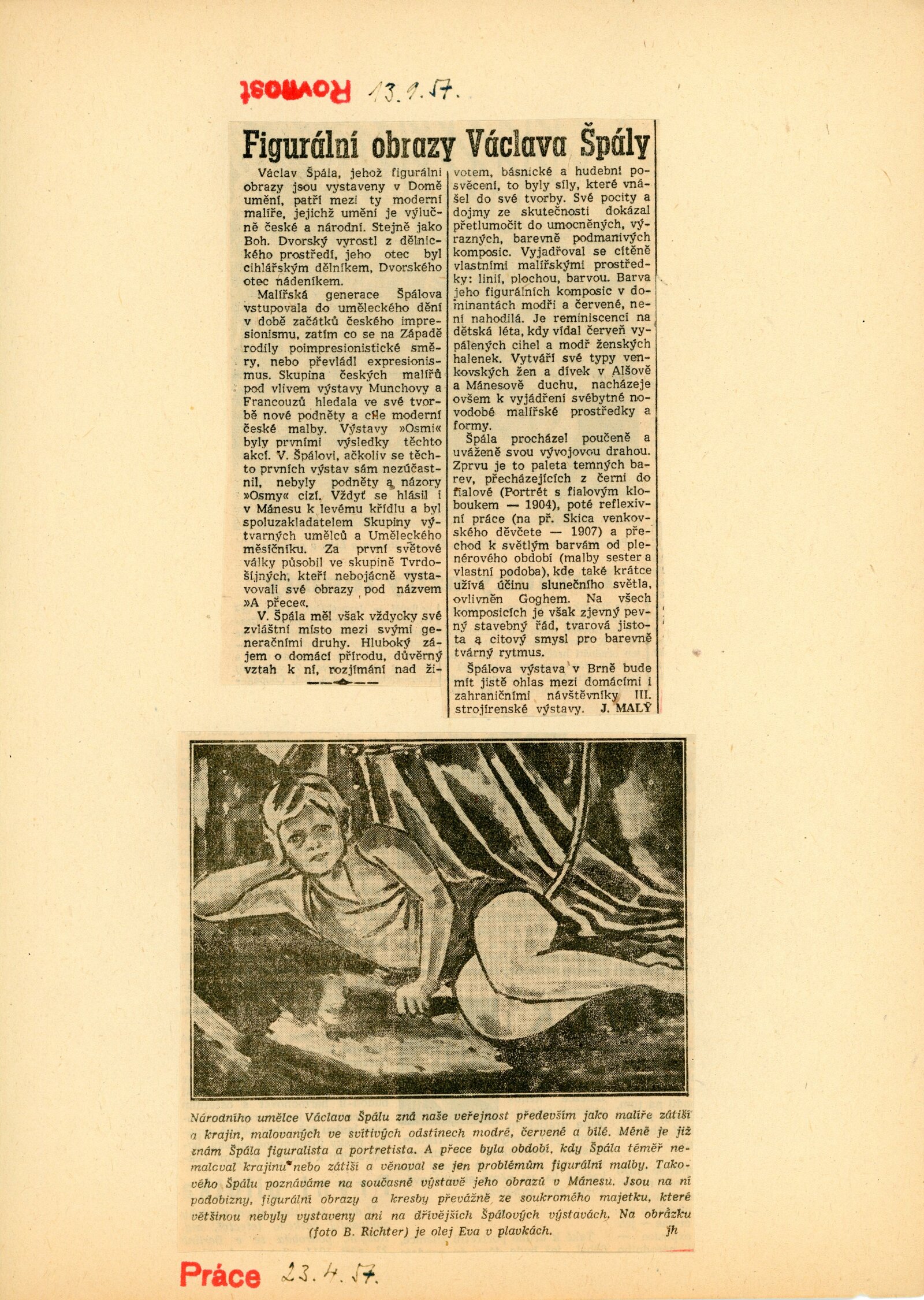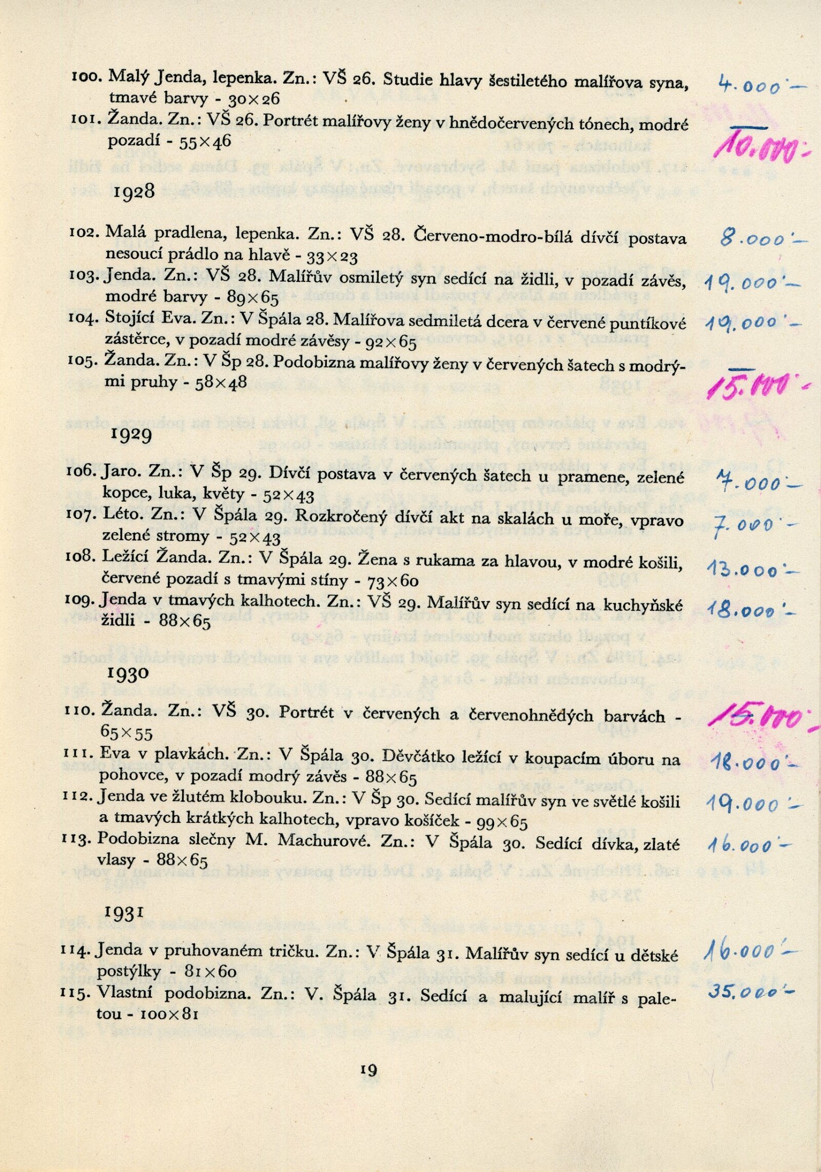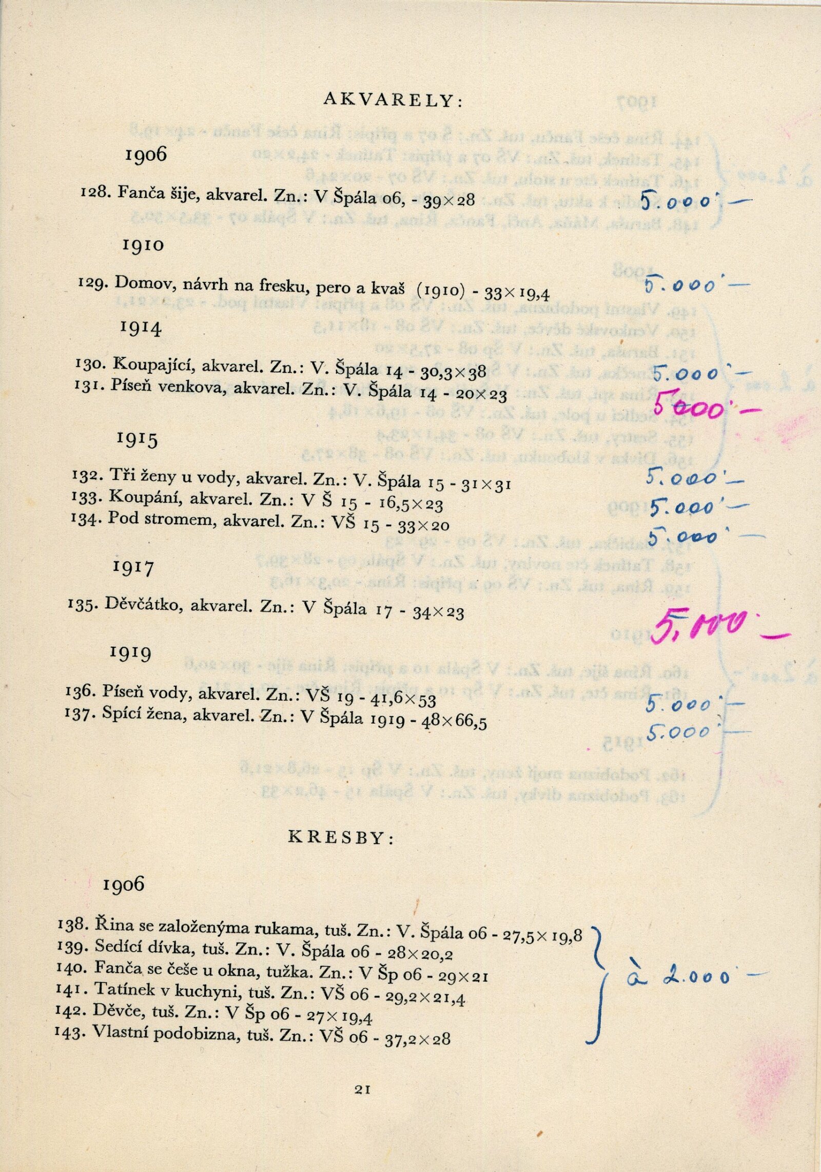 Václav Špála: Dům umění, 1. 9. – 29. 9. 1957 / Převzatý katalog. Národní umělec Václav Špála. Figurální obrazy: Výstavní síň Mánes, červen–srpen 1957 / Text: Jaromír Pečírka. – Praha: SČSVU, 1957. – 21 s., 16 s. obr. příl., DU 292. – MZK