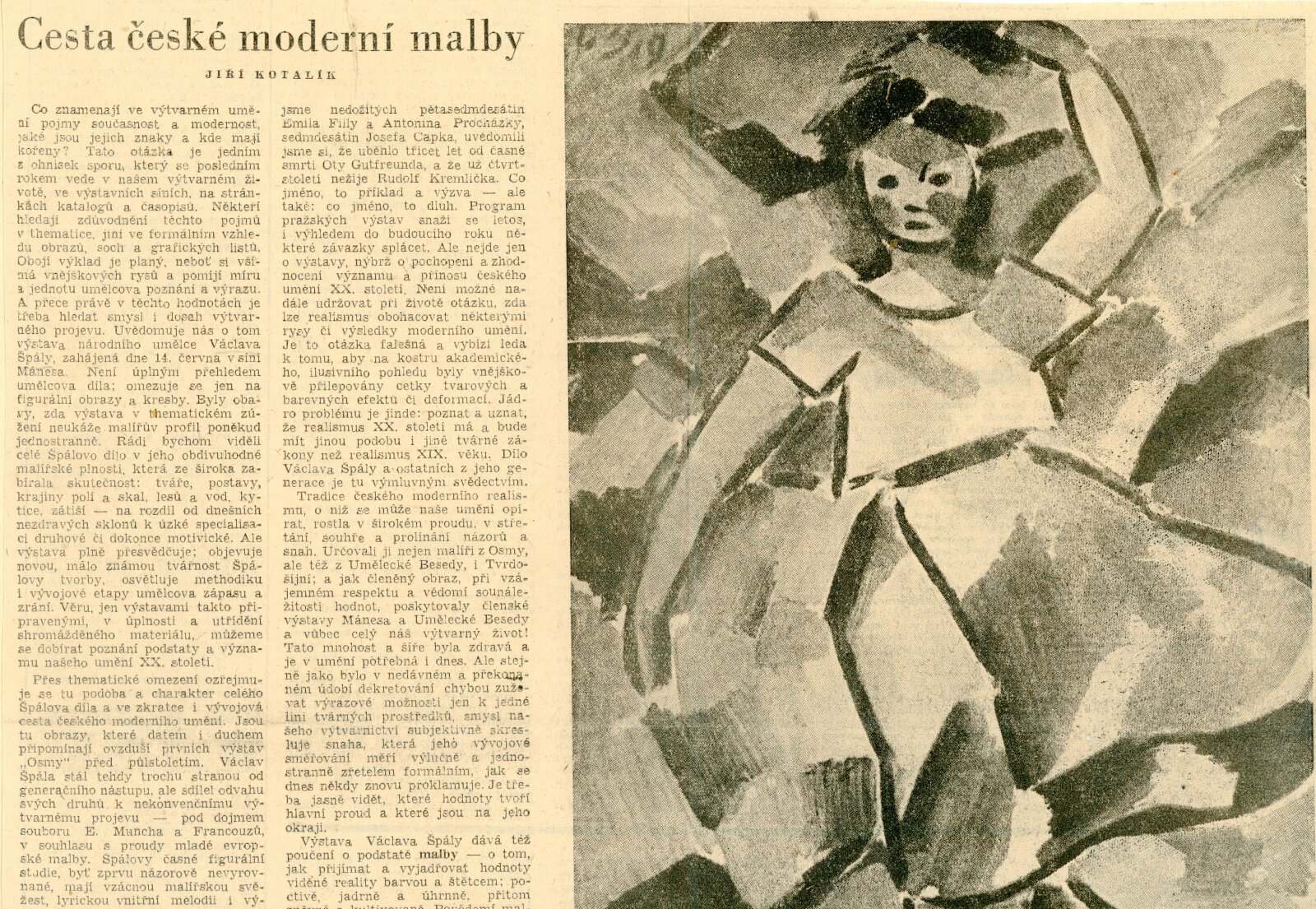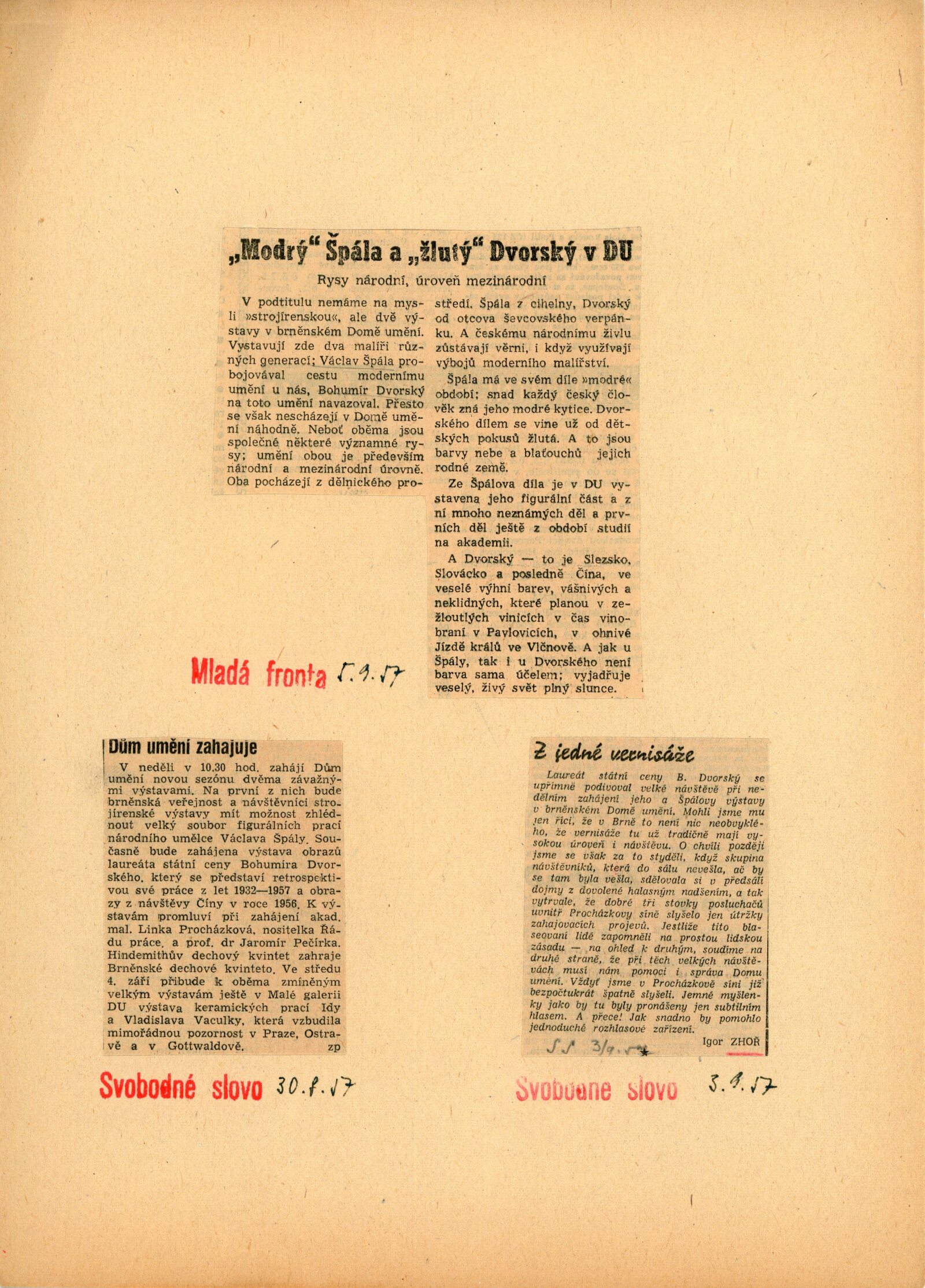 pozvánka, katalog, prezenční list z tiskové konference, 1 fotografie z výstavy v Domě umění, 2 fotografie z výstavy v Mánesu v Praze (foto Jiří Hampl), seznam děl, korespondence (Adolfa Kroupy s J. Špálou a Jaromírem Pečírkou o přípravě výstavy, korespondence o převzetí výstavy do Bratislavy)