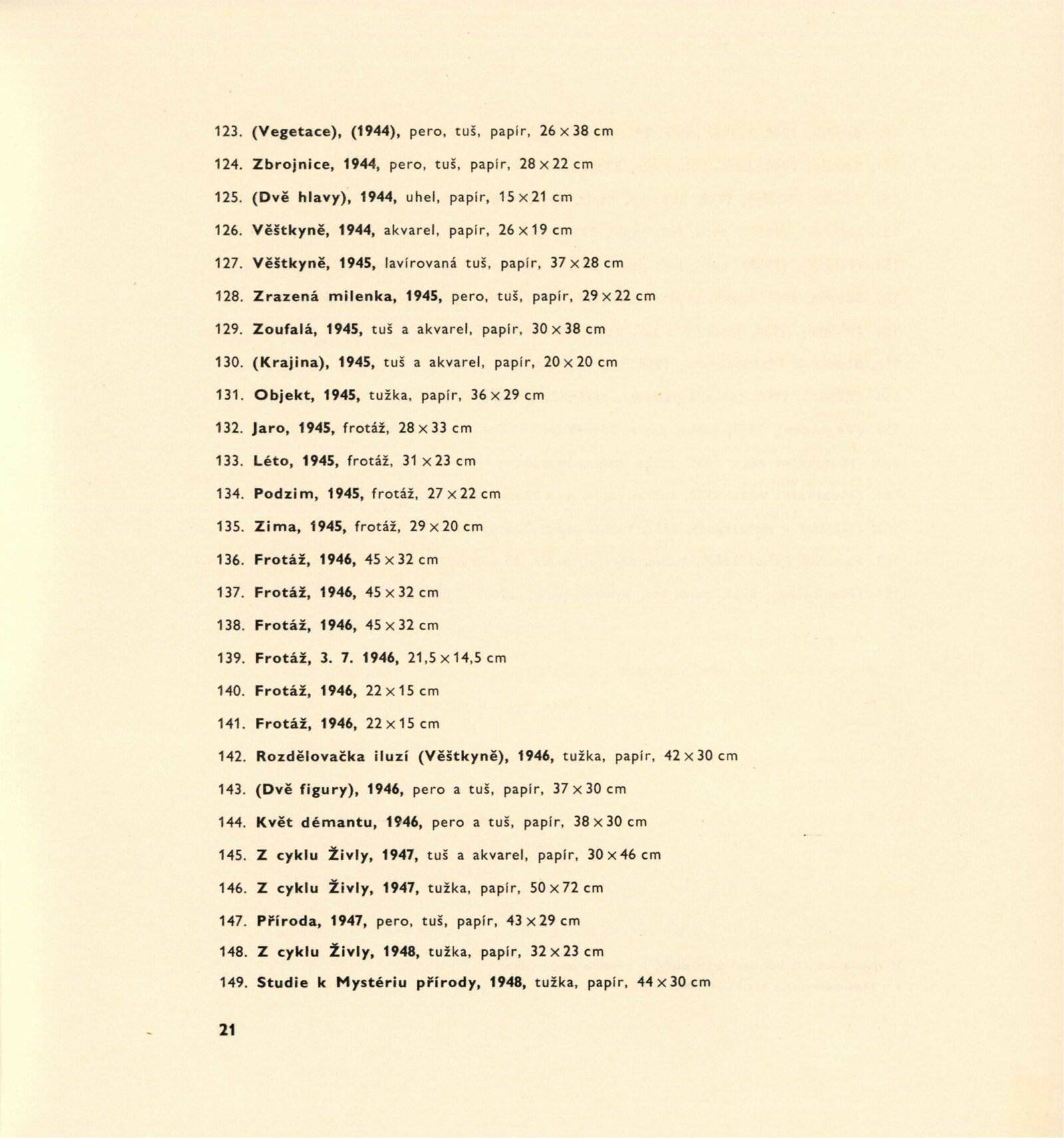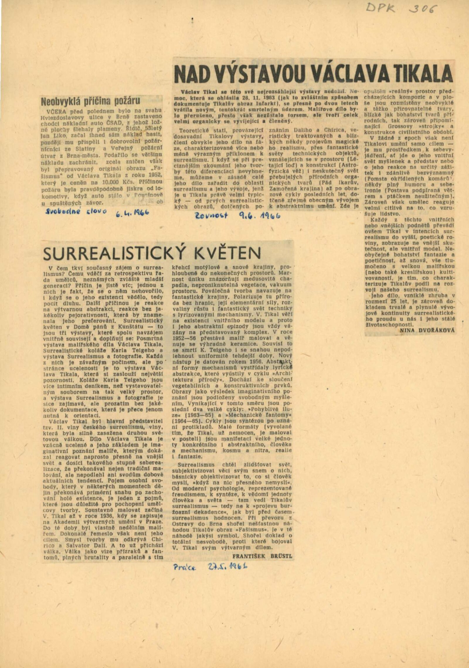 Václav Tikal. Posmrtná výstava malířského díla, 1941–1965: Dům umění města Brna / Dům pánů z Kunštátu, 6. 5. – 8. 6. 1966 / Text: František Šmejkal. – Brno: DUmB, 1966. – 23 s., obr., výstavy, DPK 306. – MZK; MG