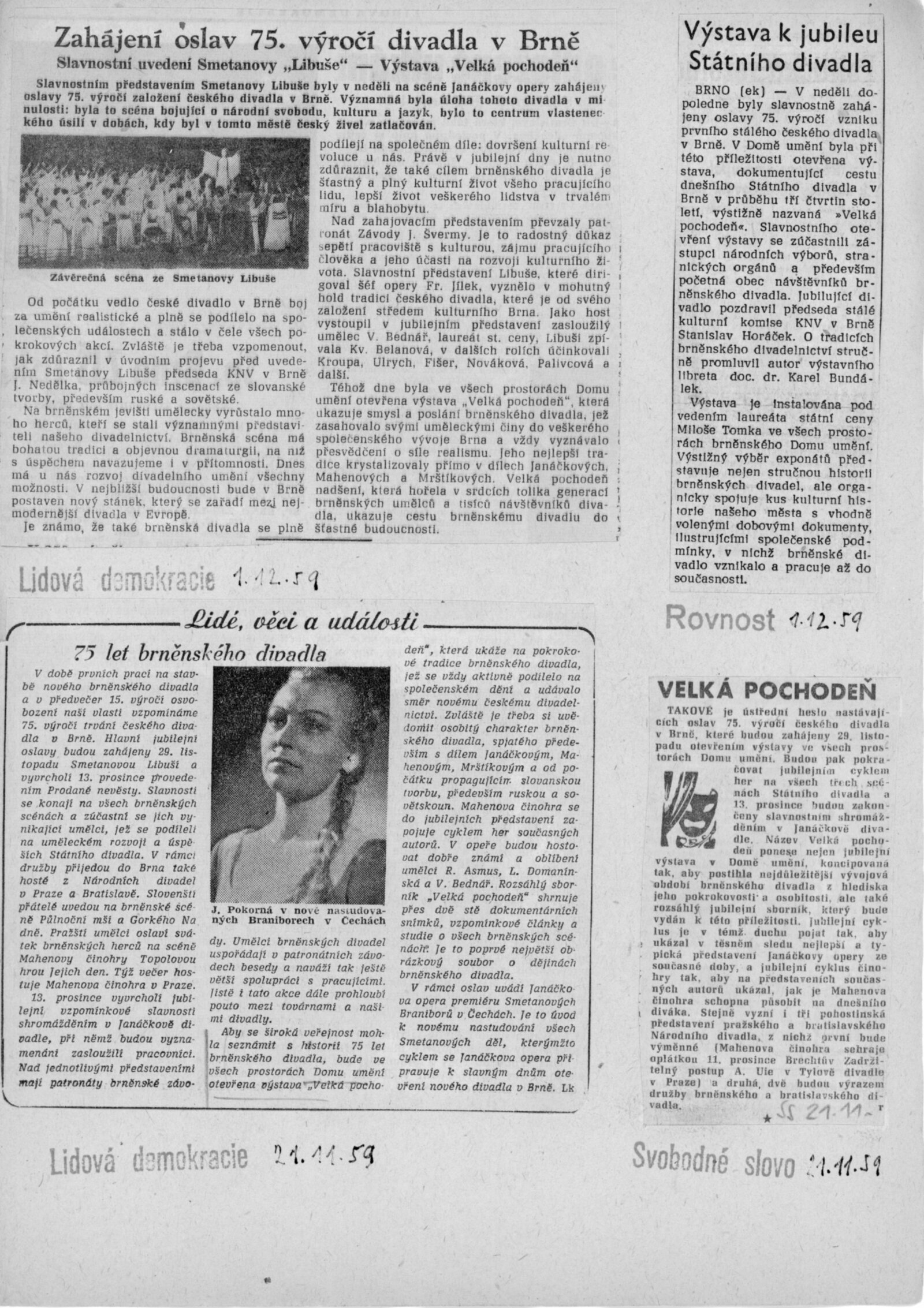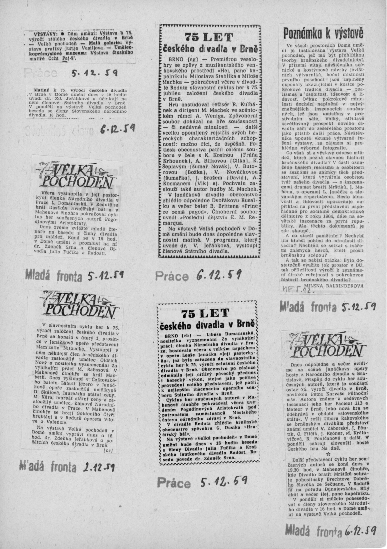 Velká pochodeň. Výstava k pětasedmdesátiletému výročí stálého českého divadla v Brně: Dům umění, 29. 11. – 13. 12. 1959 / K výročí vyšel sborník. Velká pochodeň. Sborník k pětasedmdesátiletému výročí stálého českého divadla v Brně, 1959 / Redigoval: Artur Závodský. – Brno: Státní divadlo, 1959. – 311 s., obr., DU 355. – MZK; MG