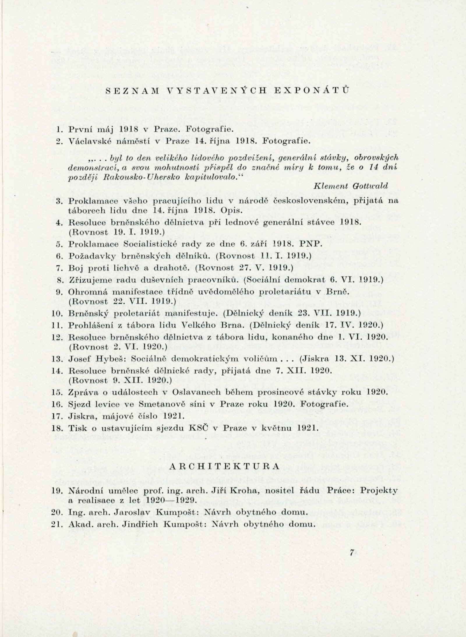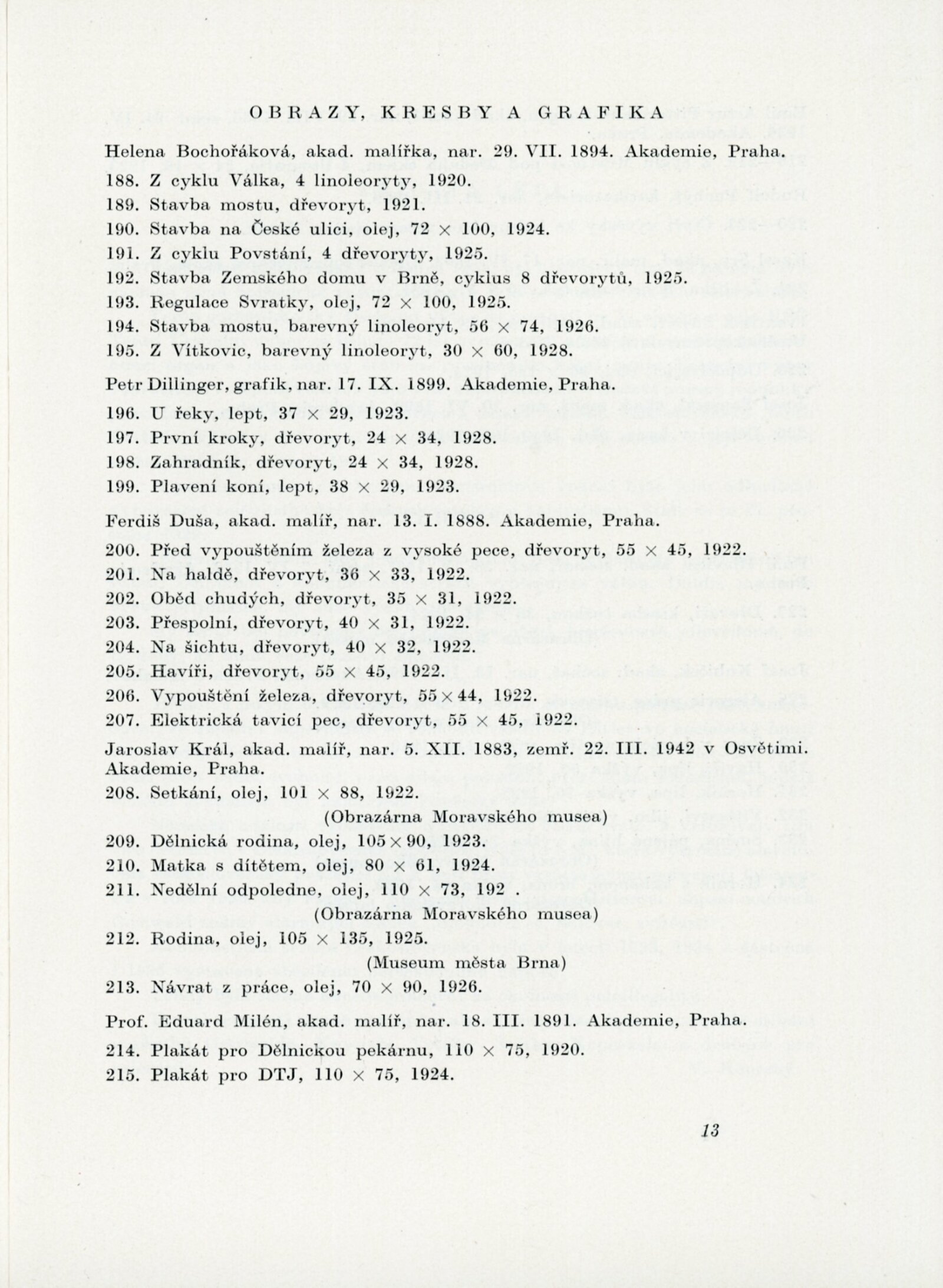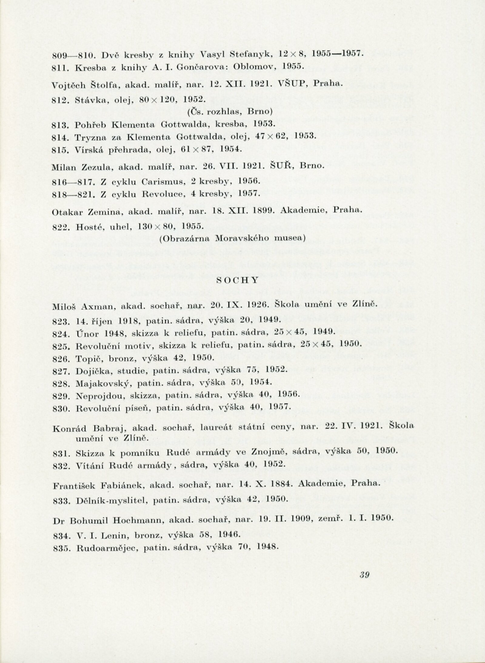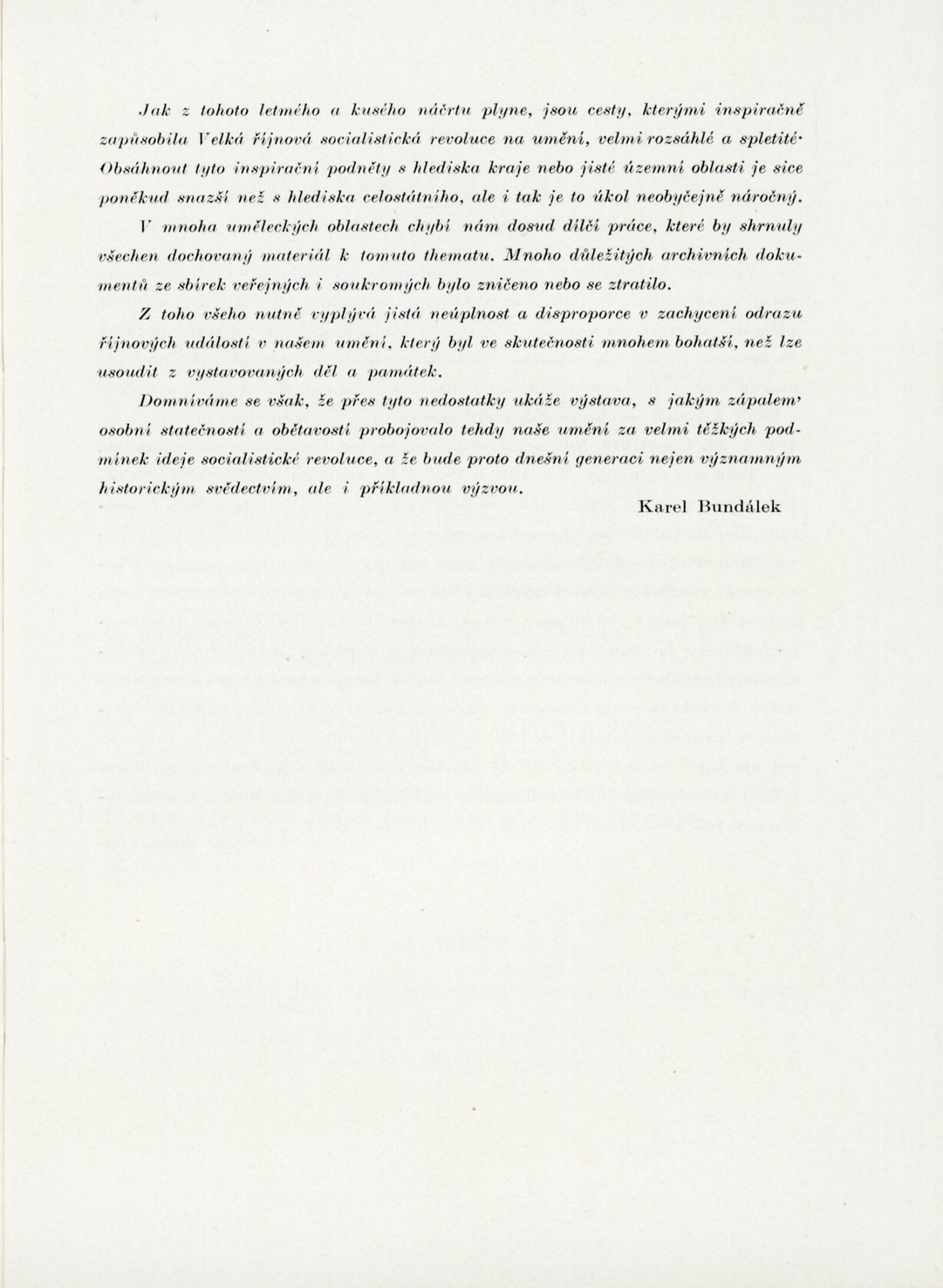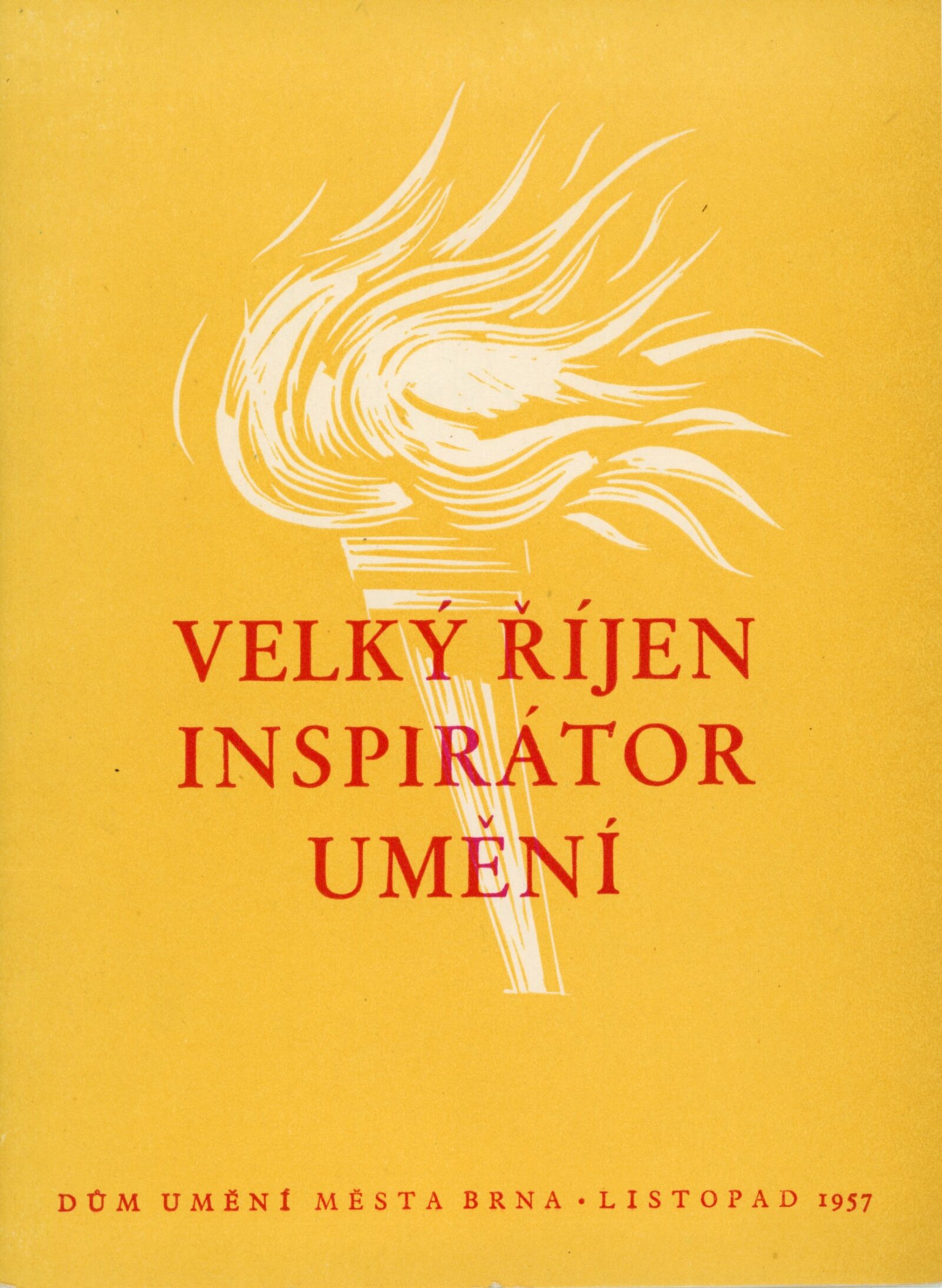 Velký Říjen inspirátor umění. Výstava k poctě 40. výročí Velké říjnové revoluce: Dům umění města Brna, 10. 11. – 8. 12. 1957 / Text: Karel Bundálek, V. Kopecký. – Brno: DUmB, 1957. – 41 s., DU 296. – MZK; MG