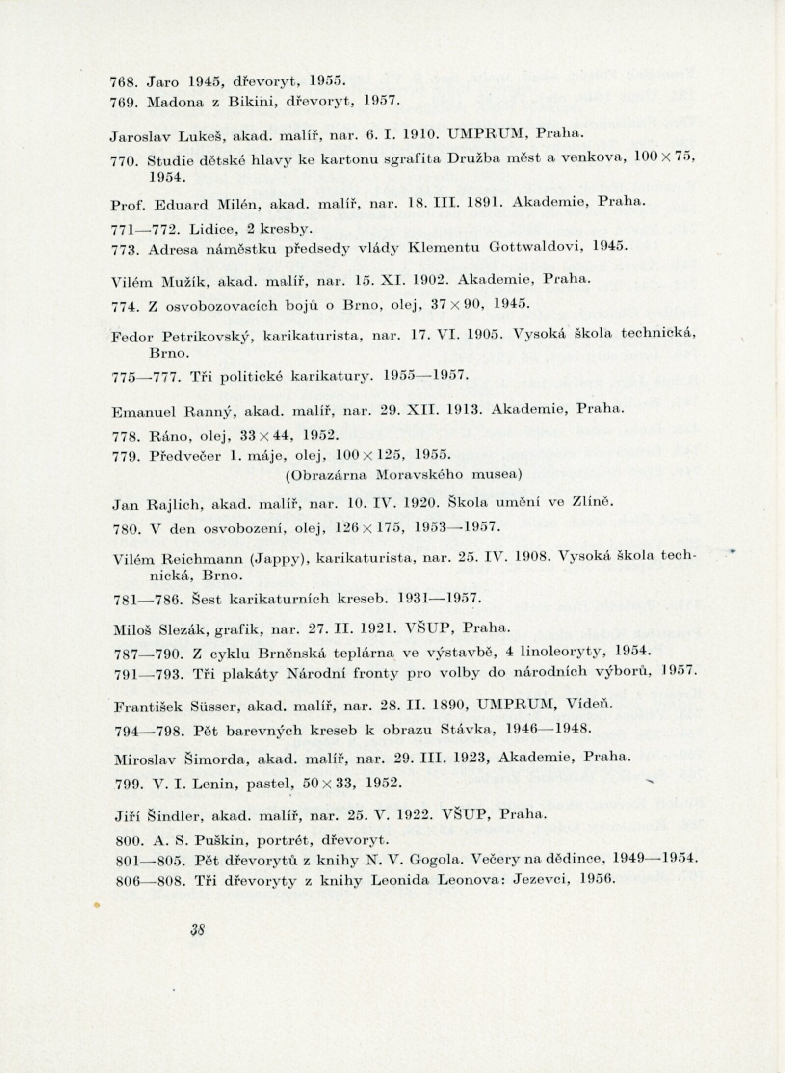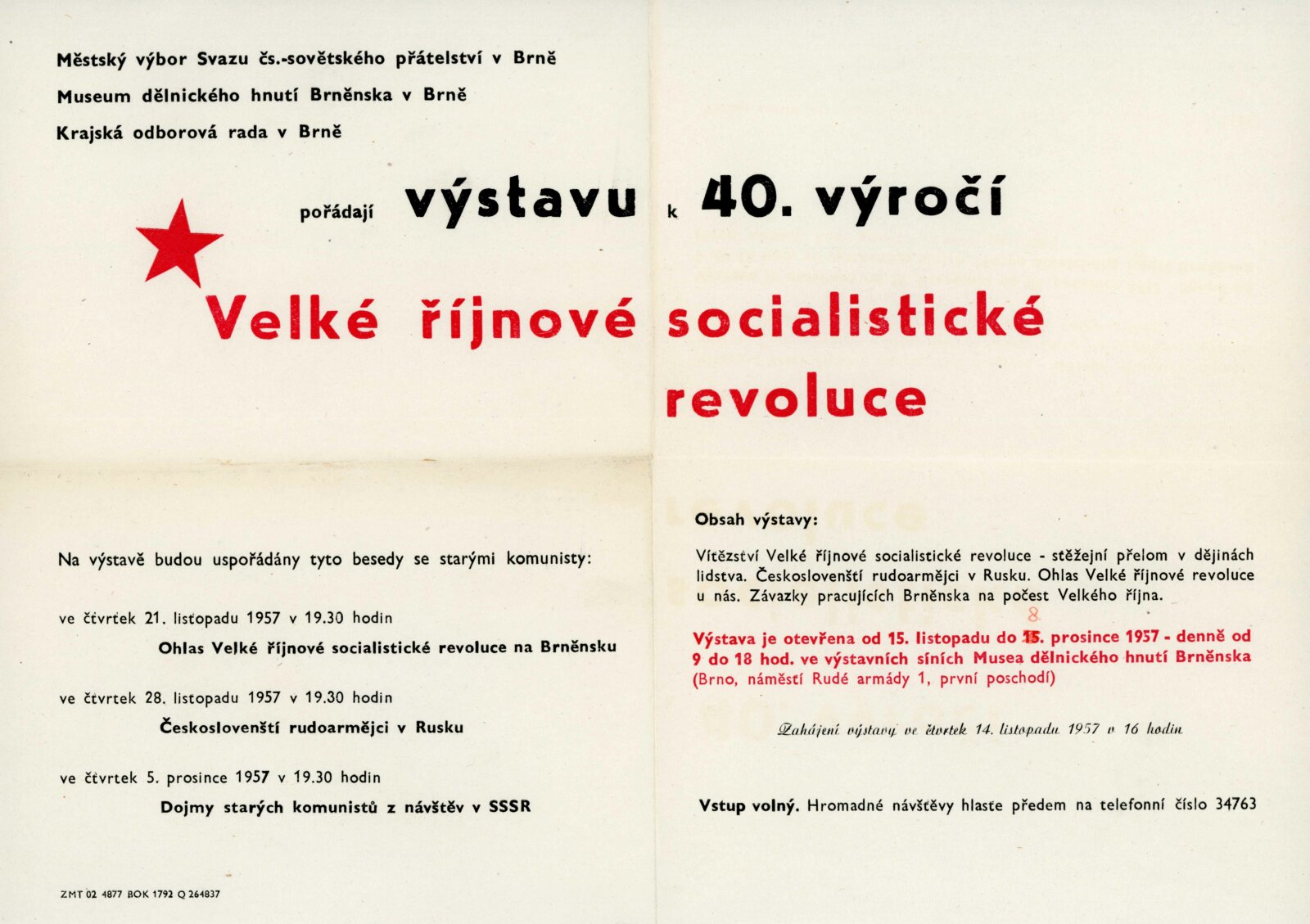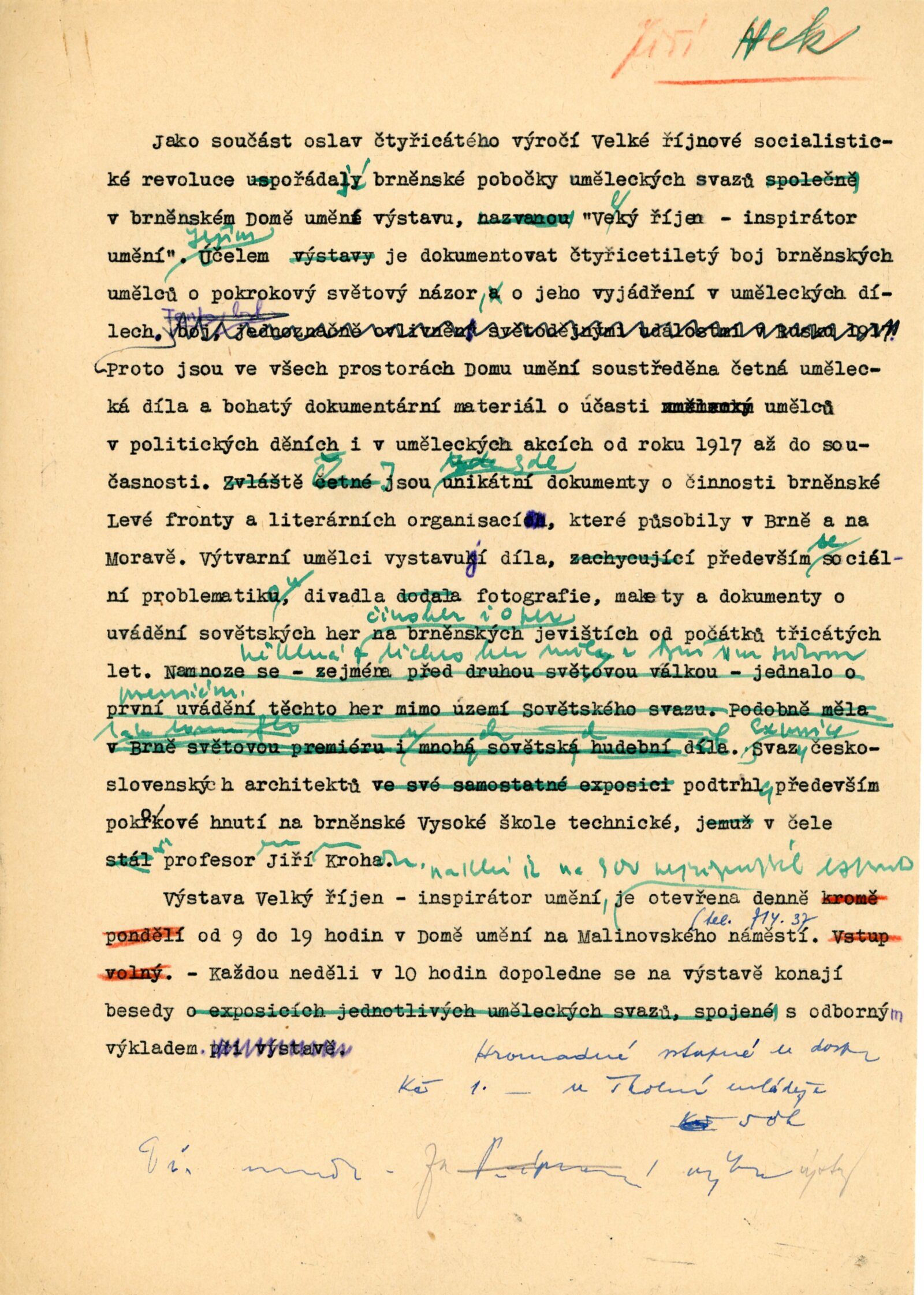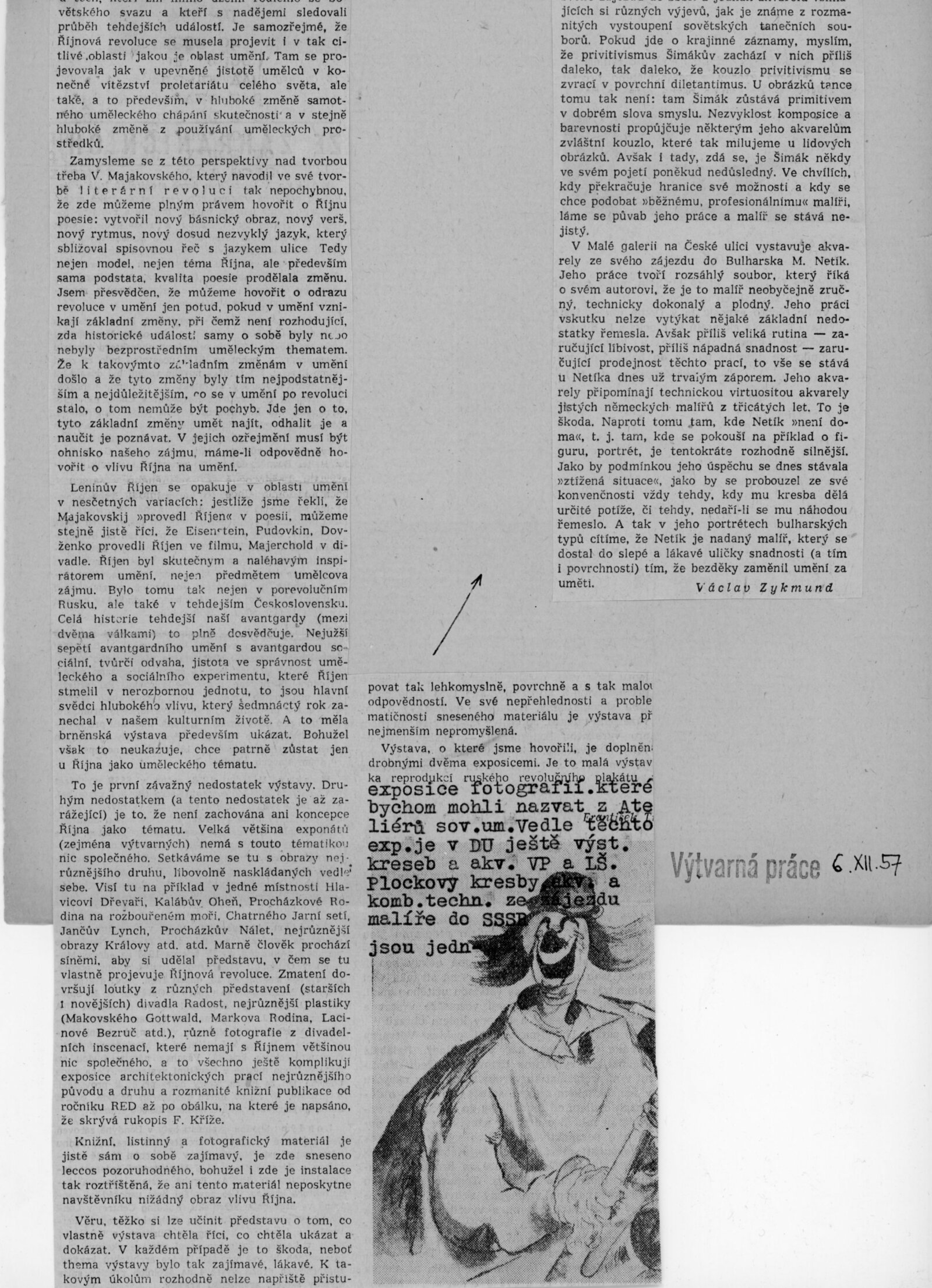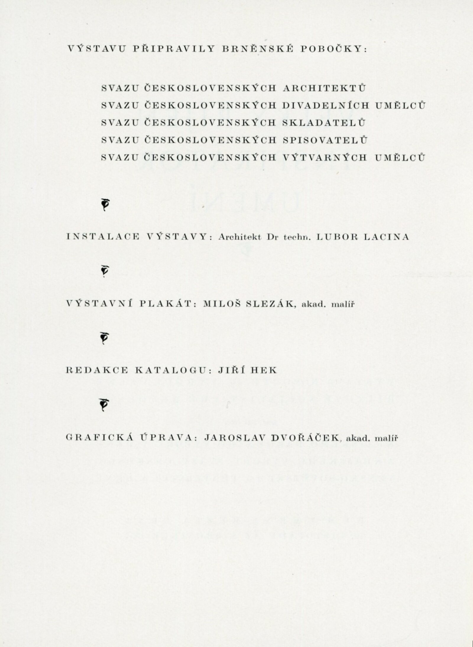 Velký Říjen inspirátor umění. Výstava k poctě 40. výročí Velké říjnové revoluce: Dům umění města Brna, 10. 11. – 8. 12. 1957 / Text: Karel Bundálek, V. Kopecký. – Brno: DUmB, 1957. – 41 s., DU 296. – MZK; MG