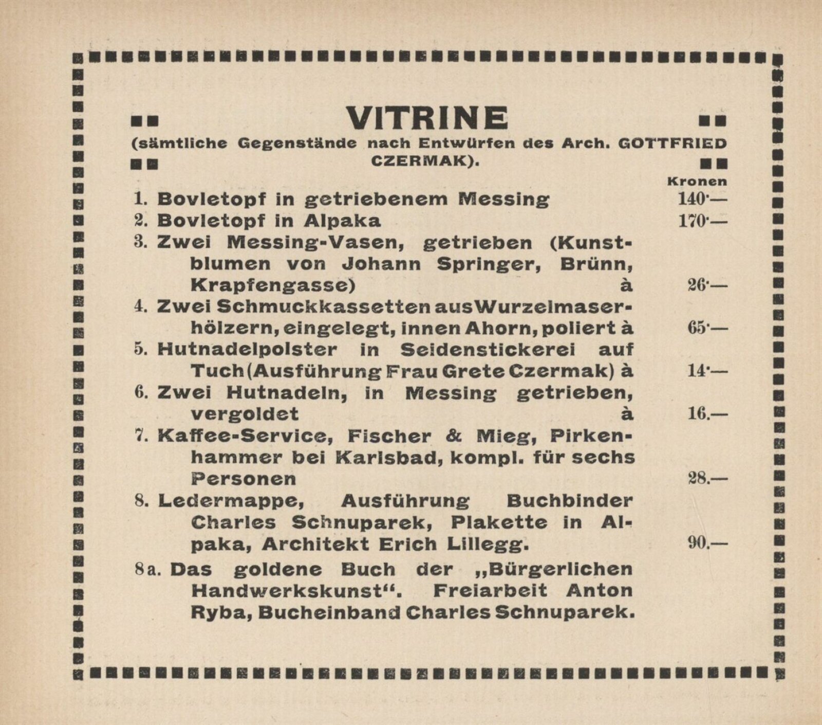 Vereinigung deutsch–mährischer bildender Künstler, als Gast Verein deutscher bild. Künstler in Böhmen: 105. Ausstellung, Mährischer Kunstverein, Kaiser Franz Josef Jubiläumskünstlerhaus April–Mai 1912 / Brünn: Mährischer Kunstverein, 1912. – 24 s. Seznam členů spolku Vereinigung. – MZK; SVKOL; MG; UPM