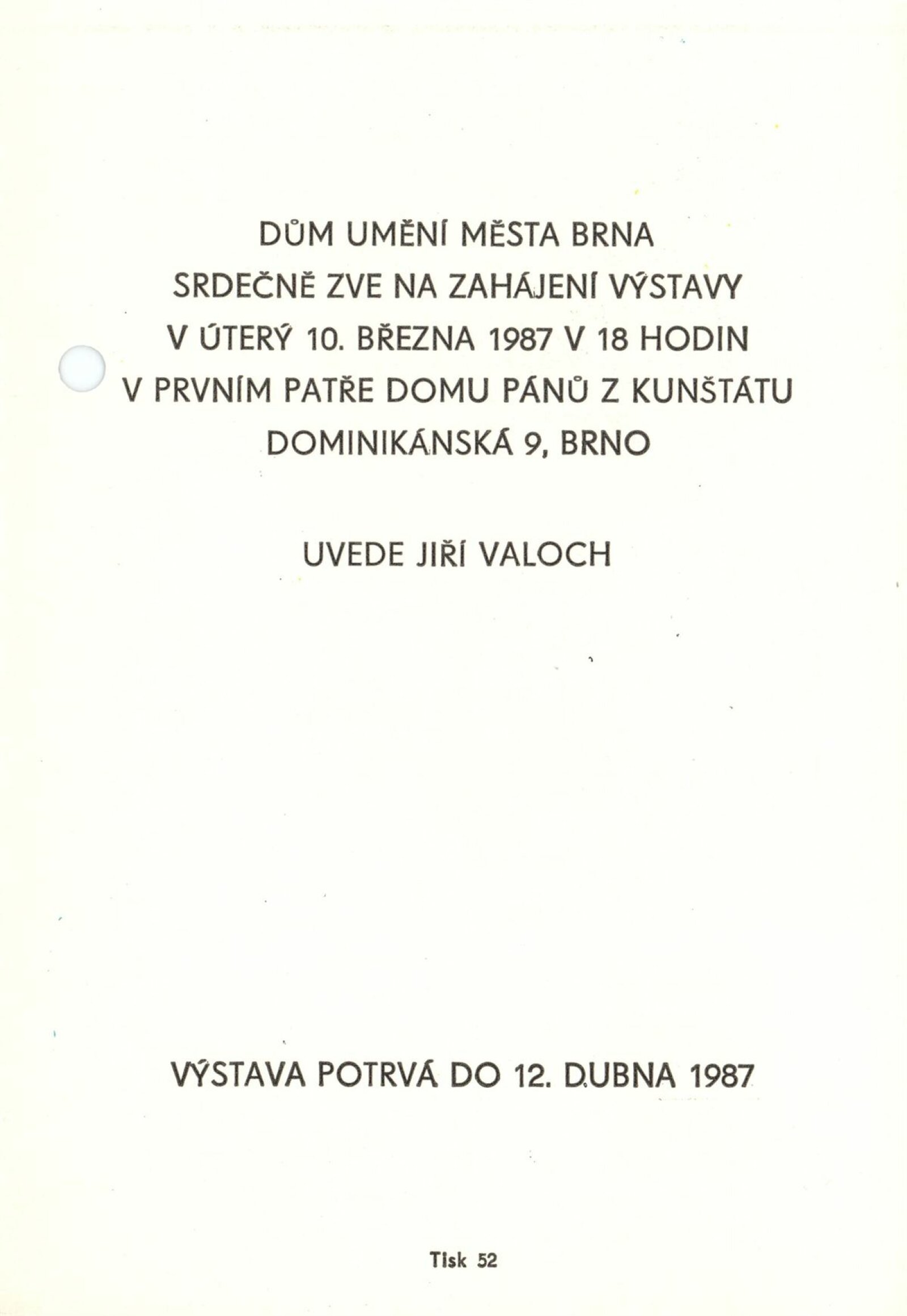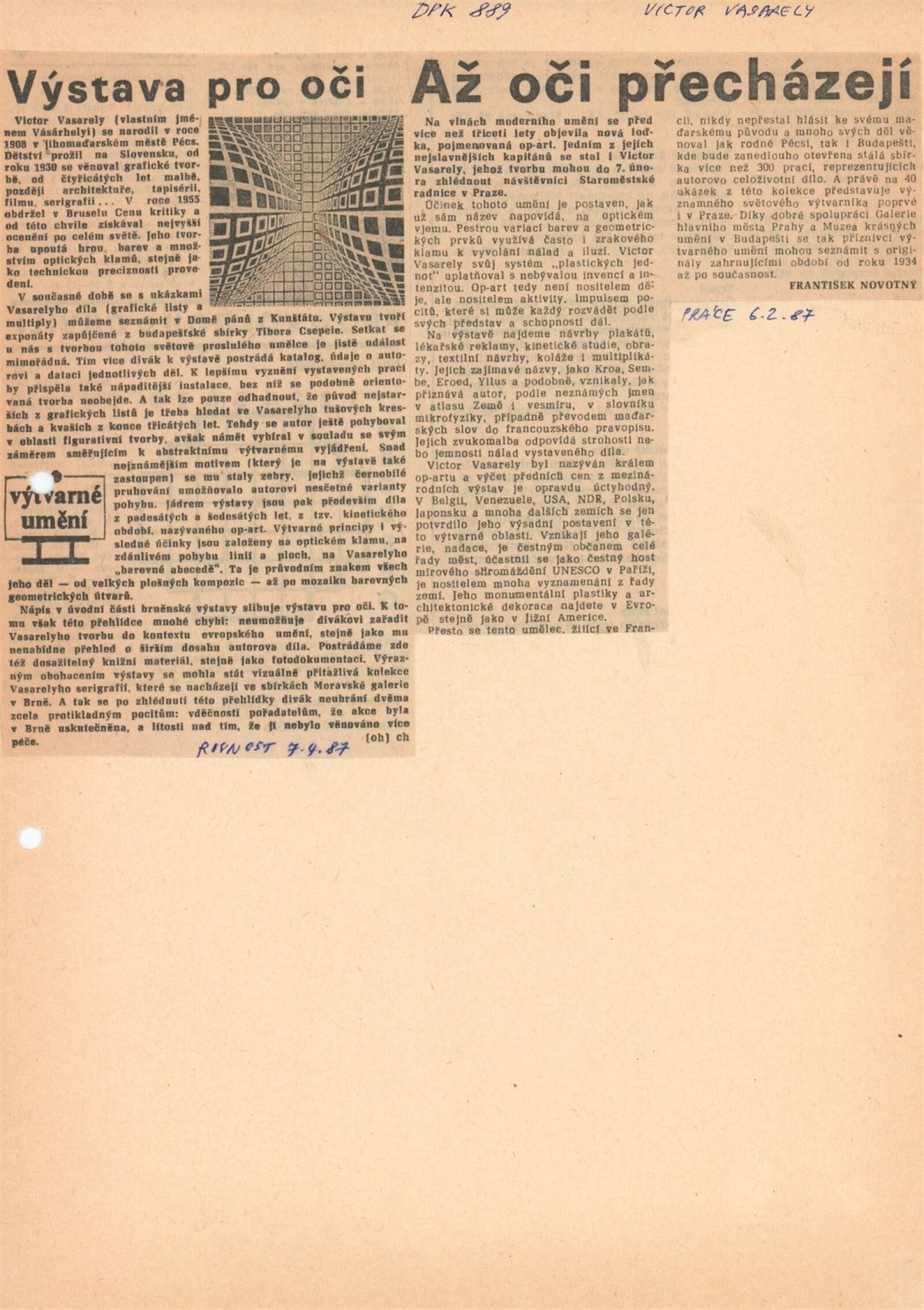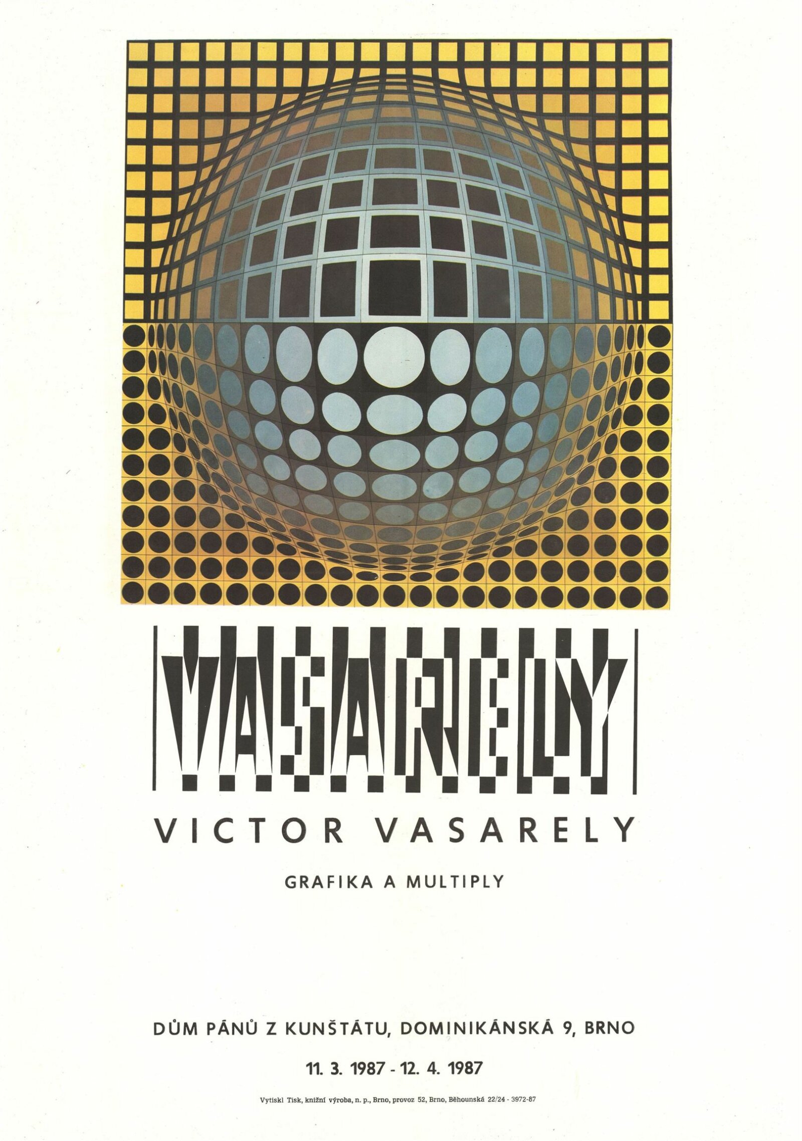 Victor Vasarely. Multiply a grafika: Dům umění / Dům pánů z Kunštátu, 10. 3. – 12. 4. 1987 / Text: Jiří Valoch. – Brno: DUmB, 1987. – [21] s., obr., portrét, životopis, výstavy, DPK 889. – MZK; MG; MMB