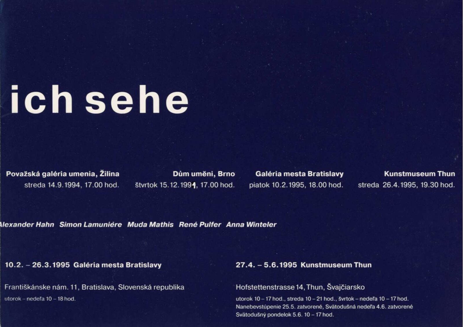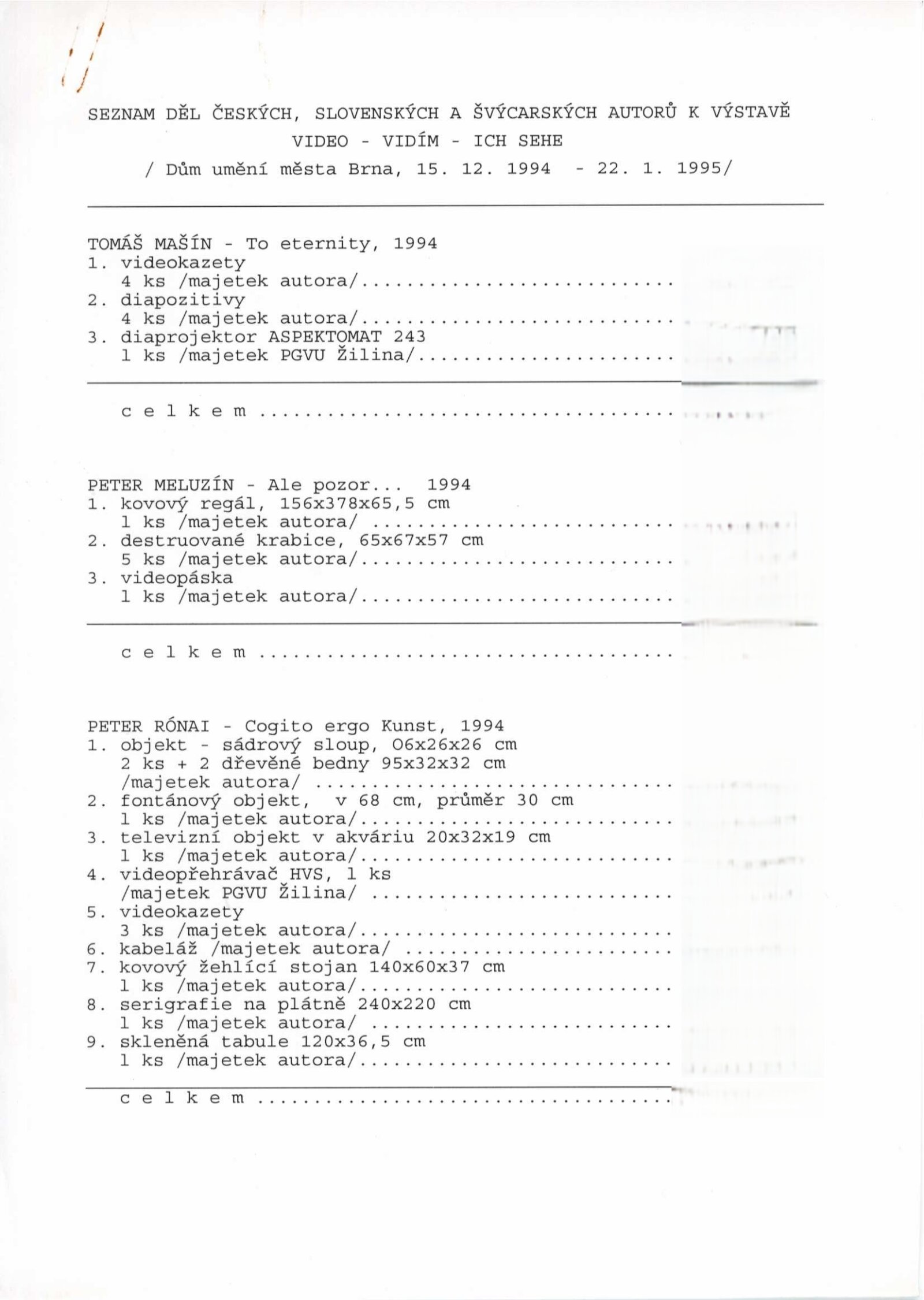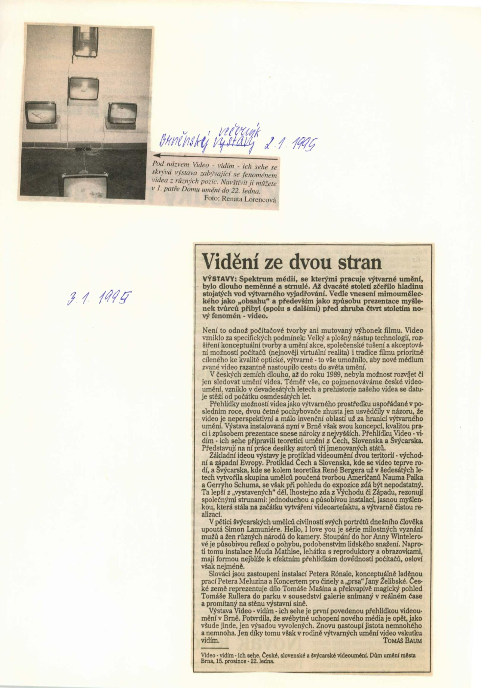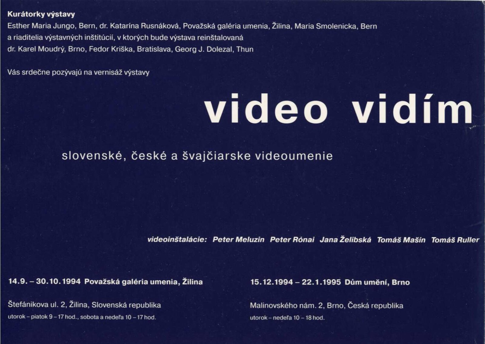 Výstava Video – vidím – ich sehe (název vychází z původního významu latinského slova video), připravená v roce 1994 mezinárodním kurátorským týmem, představila výběr z video tvorby českých, slovenských a švýcarských umělců ve vzájemné konfrontaci. Tento záměr odpovídal aktualizovanému dobovému zájmu o propojování umění bývalého východního bloku se západním diskurzem v nových kulturně politických podmínkách sjednocené Evropy. Přestože video art se ve Švýcarsku na rozdíl od Československa rozvíjel již od konce šedesátých let, došlo na výstavě podle recenzí k symbióze pečlivě kurátorsky vybraných vizuálně výrazných a působivých video instalací, jež vznikaly z větší části přímo pro výstavu. Výběru autorů pro českou a slovenskou stranu se ujala slovenská teoretička a kurátorka Katarína Rusnáková, se zaměřením na významné osobnosti v oblasti multimediální tvorby (akce, performance, instalace, objekty a další), které se video tvorbou již nějakou dobou soustavně zabývaly a používaly osobitý autorský jazyk (Petr Meluzín, Peter Rónai, Jana Želibská, Tomáš Ruller a Tomáš Mašín). Ve výběru švýcarských umělců, který připravily Esther Maria Jundo a Maria Smolenicka z Bernu, se objevili autoři Alexander Hahn, Simon Laminiere, Muda Mathis, René Pulfer a Anna Winteler. V Brně se vedle Hi-tech výstavy jednalo o první výstavu zaměřenou na umění videa a elektronického obrazu. Výstava byla uvedena na několika místech: v Považské galerii umenia v Žilině (14. 9. – 30. 10. 1994), v Domě umění města Brna (15.12. 1994 – 22.1. 1995), v Galérii hlavního města Bratislavy (10. 2. – 26. 3. 1995) a v Kunstmuseu Thun ve Švýcarsku (27. 4. – 6. 5. 1995). Organizačně, technicky a realizačně náročná výstava byla podpořena různými místními institucemi, nadacemi a sponzory včetně švýcarské Nadace Pro Helvetia a švýcarského ministerstva kultury. Na přípravě výstavy v Brně se podílel Dům umění města Brna a Ateliér Video-Multimedia-Performance z Fakulty výtvarných umění při VUT v Brně. Výstavu doprovázel program s video ukázkami českých, slovenských a švýcarských umělců a informačně obsáhlý katalog. (MS)