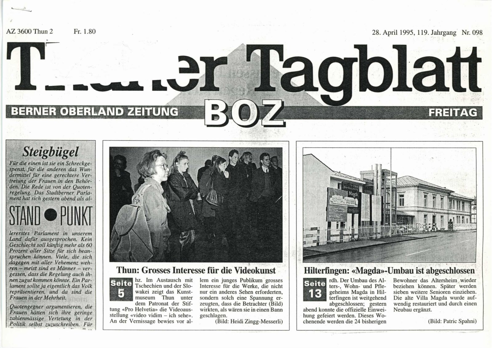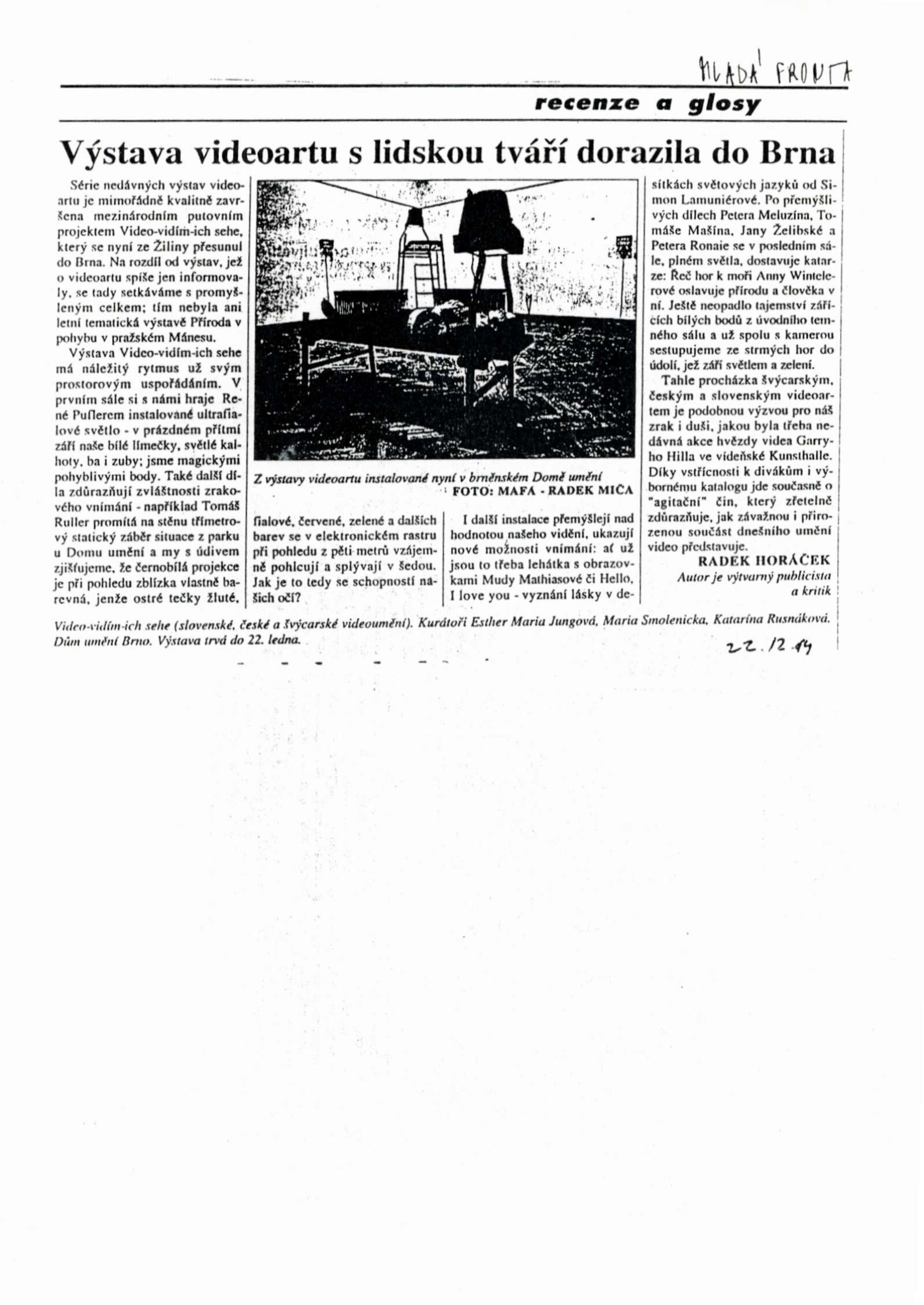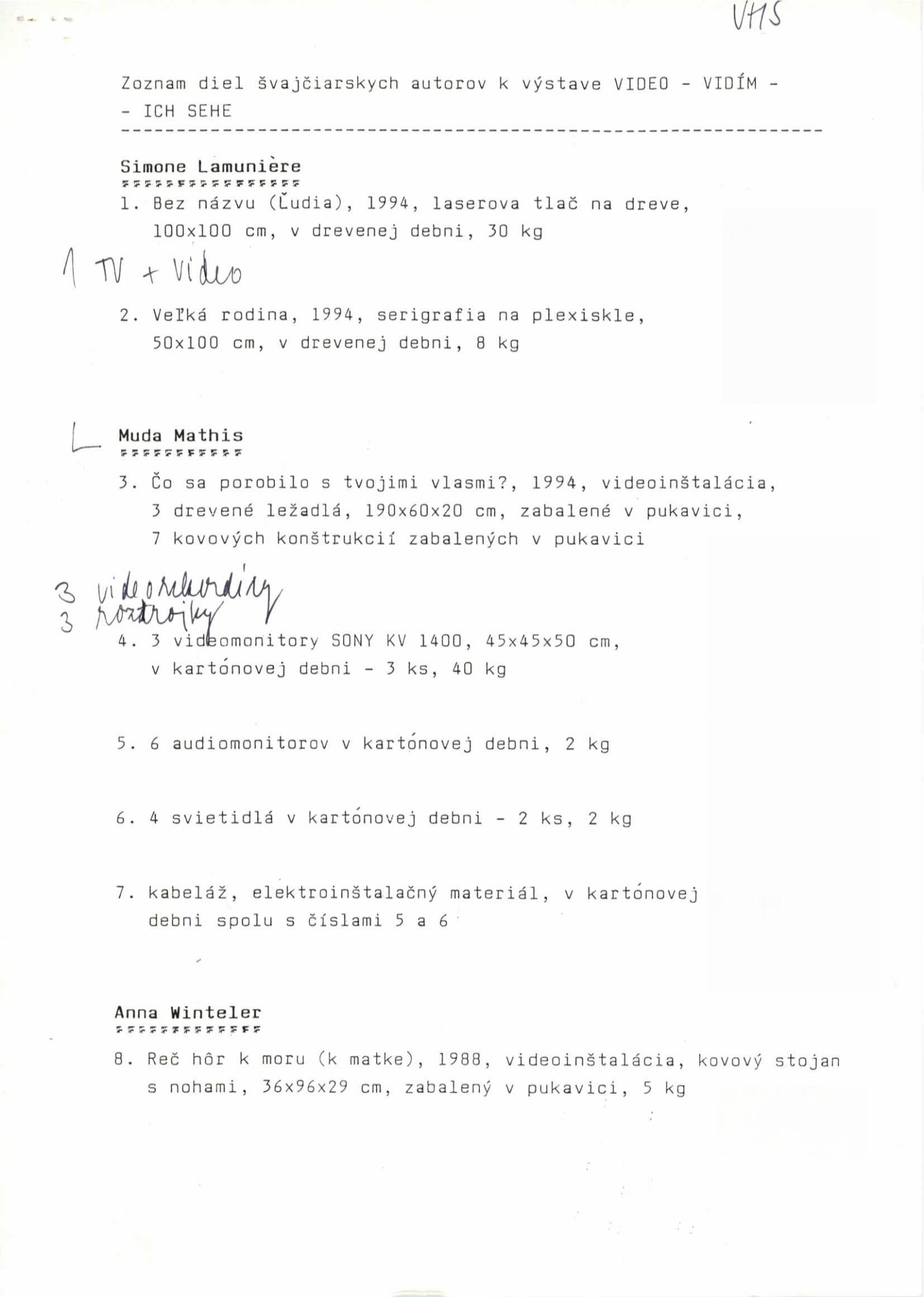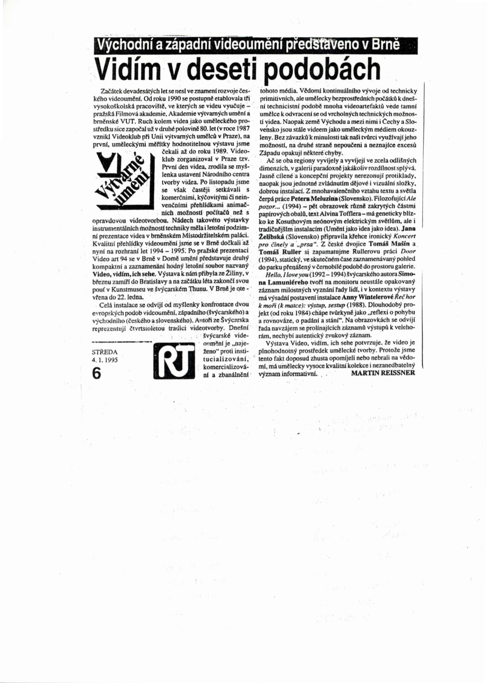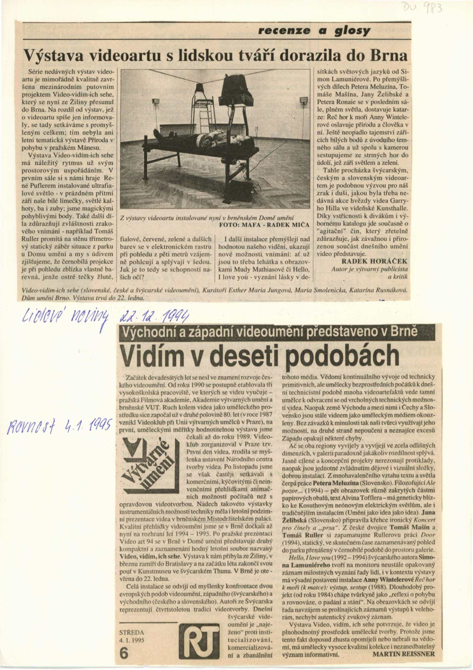 Výstava Video – vidím – ich sehe (název vychází z původního významu latinského slova video), připravená v roce 1994 mezinárodním kurátorským týmem, představila výběr z video tvorby českých, slovenských a švýcarských umělců ve vzájemné konfrontaci. Tento záměr odpovídal aktualizovanému dobovému zájmu o propojování umění bývalého východního bloku se západním diskurzem v nových kulturně politických podmínkách sjednocené Evropy. Přestože video art se ve Švýcarsku na rozdíl od Československa rozvíjel již od konce šedesátých let, došlo na výstavě podle recenzí k symbióze pečlivě kurátorsky vybraných vizuálně výrazných a působivých video instalací, jež vznikaly z větší části přímo pro výstavu. Výběru autorů pro českou a slovenskou stranu se ujala slovenská teoretička a kurátorka Katarína Rusnáková, se zaměřením na významné osobnosti v oblasti multimediální tvorby (akce, performance, instalace, objekty a další), které se video tvorbou již nějakou dobou soustavně zabývaly a používaly osobitý autorský jazyk (Petr Meluzín, Peter Rónai, Jana Želibská, Tomáš Ruller a Tomáš Mašín). Ve výběru švýcarských umělců, který připravily Esther Maria Jundo a Maria Smolenicka z Bernu, se objevili autoři Alexander Hahn, Simon Laminiere, Muda Mathis, René Pulfer a Anna Winteler. V Brně se vedle Hi-tech výstavy jednalo o první výstavu zaměřenou na umění videa a elektronického obrazu. Výstava byla uvedena na několika místech: v Považské galerii umenia v Žilině (14. 9. – 30. 10. 1994), v Domě umění města Brna (15.12. 1994 – 22.1. 1995), v Galérii hlavního města Bratislavy (10. 2. – 26. 3. 1995) a v Kunstmuseu Thun ve Švýcarsku (27. 4. – 6. 5. 1995). Organizačně, technicky a realizačně náročná výstava byla podpořena různými místními institucemi, nadacemi a sponzory včetně švýcarské Nadace Pro Helvetia a švýcarského ministerstva kultury. Na přípravě výstavy v Brně se podílel Dům umění města Brna a Ateliér Video-Multimedia-Performance z Fakulty výtvarných umění při VUT v Brně. Výstavu doprovázel program s video ukázkami českých, slovenských a švýcarských umělců a informačně obsáhlý katalog. (MS)