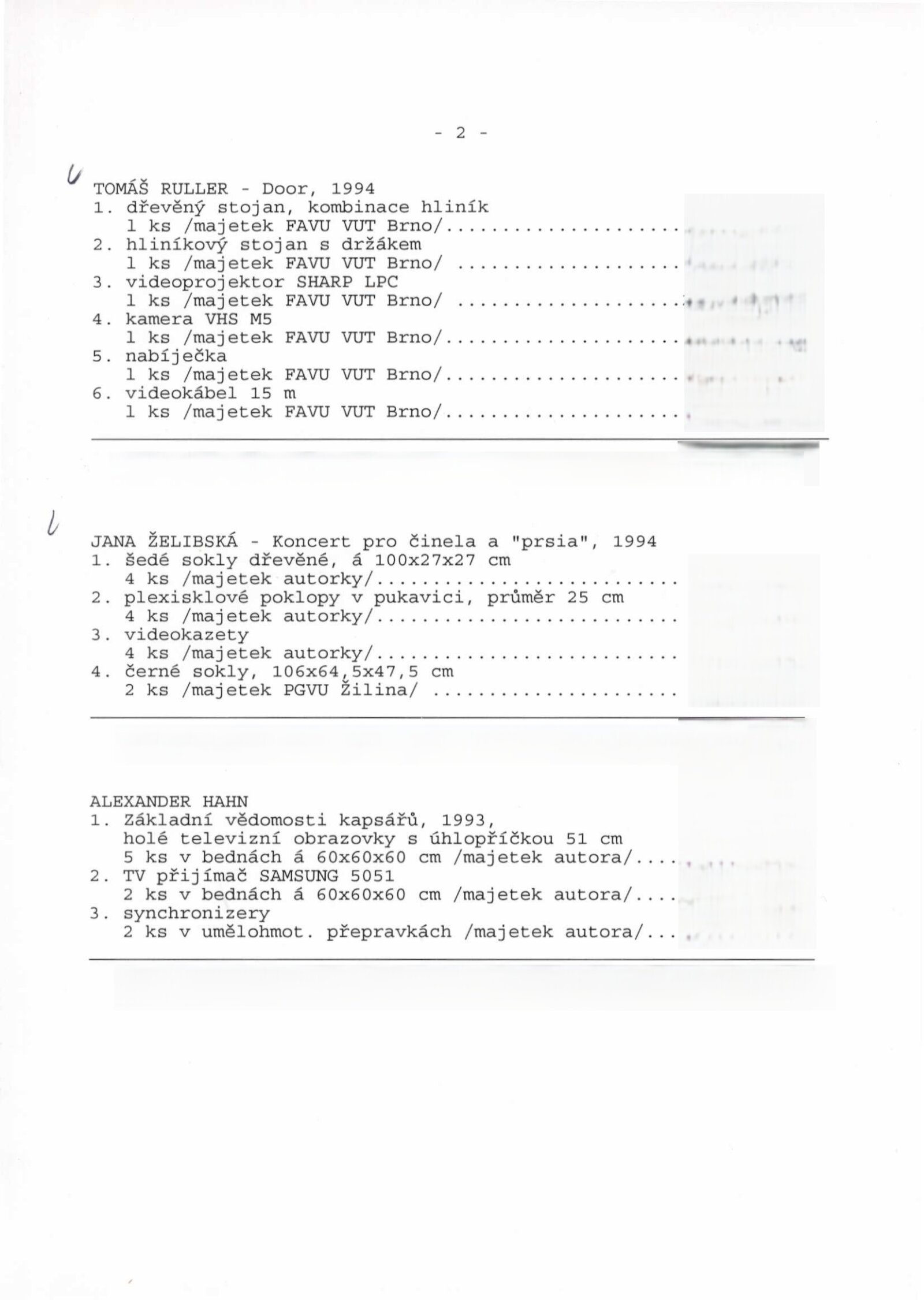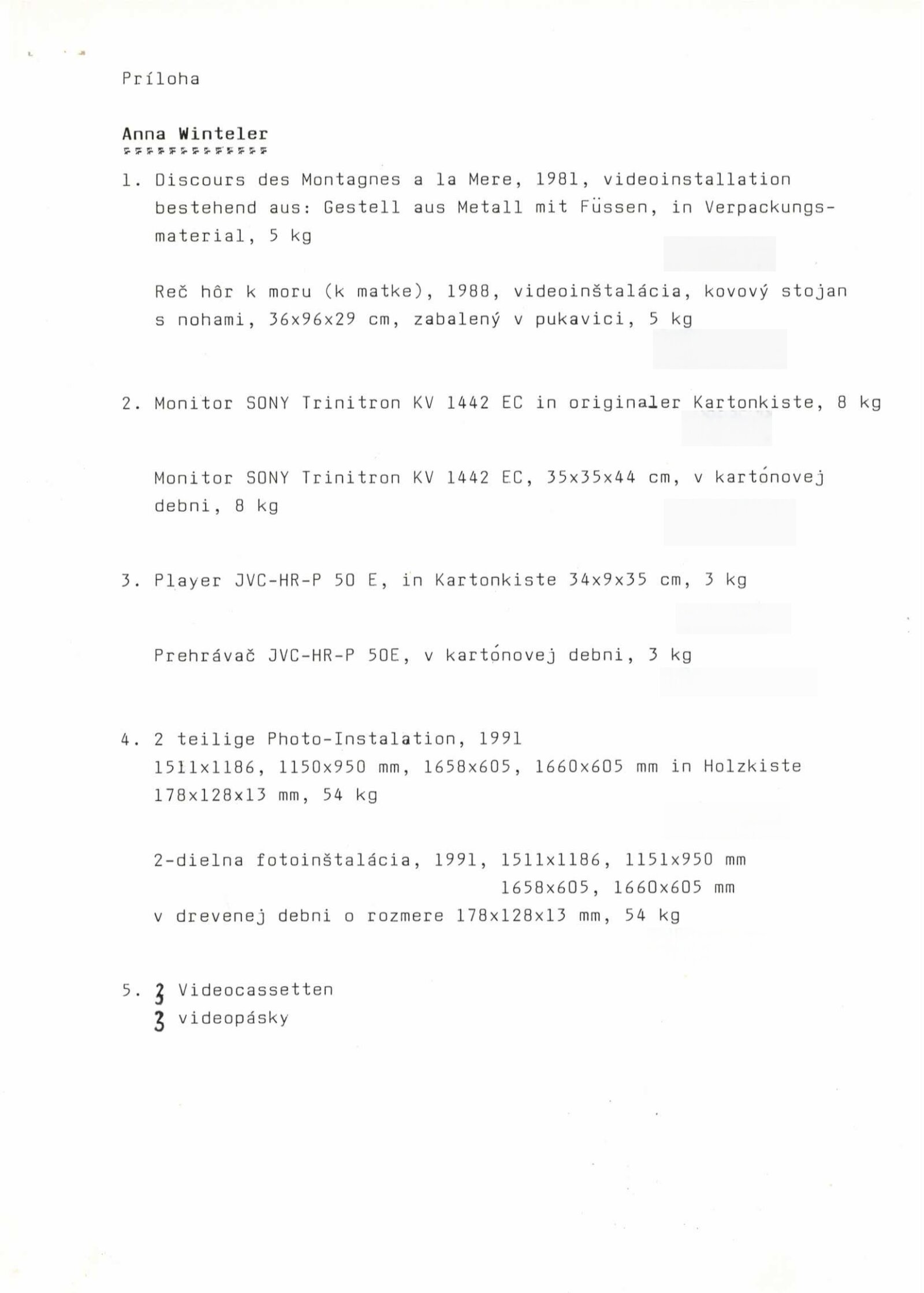 pozvánka, katalog, tisková zpráva, texty k výstavě, fotografie výstavy, seznamy vystavených děl, popisky, poznámky k instalaci výstavy, videoprogram, korespondence o realizaci výstavy, potvrzení o zapůjčení a převzetí, celní dokumenty, smlouvy k výstavě, recenze v tisku, poznámky, doplňující materiály