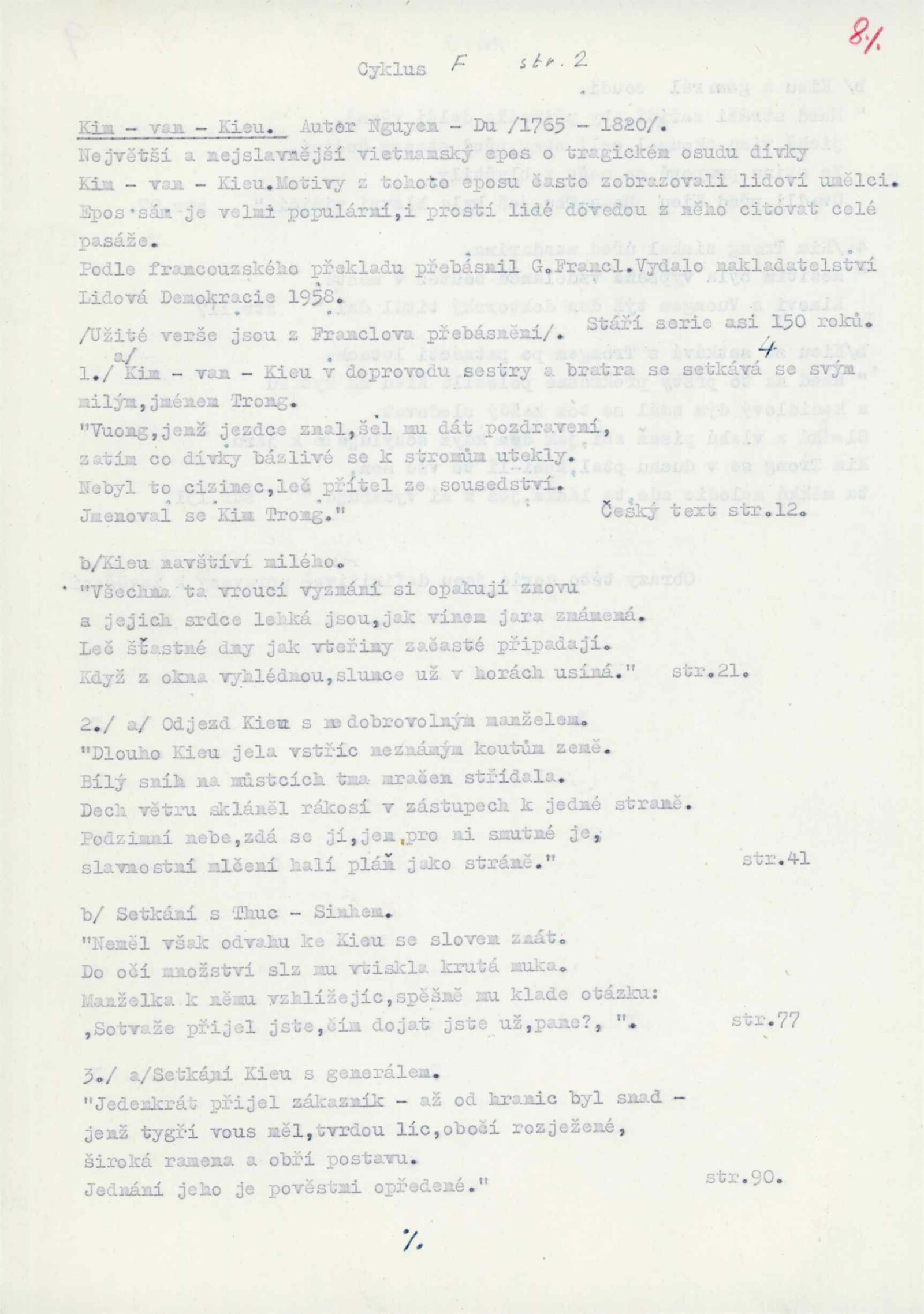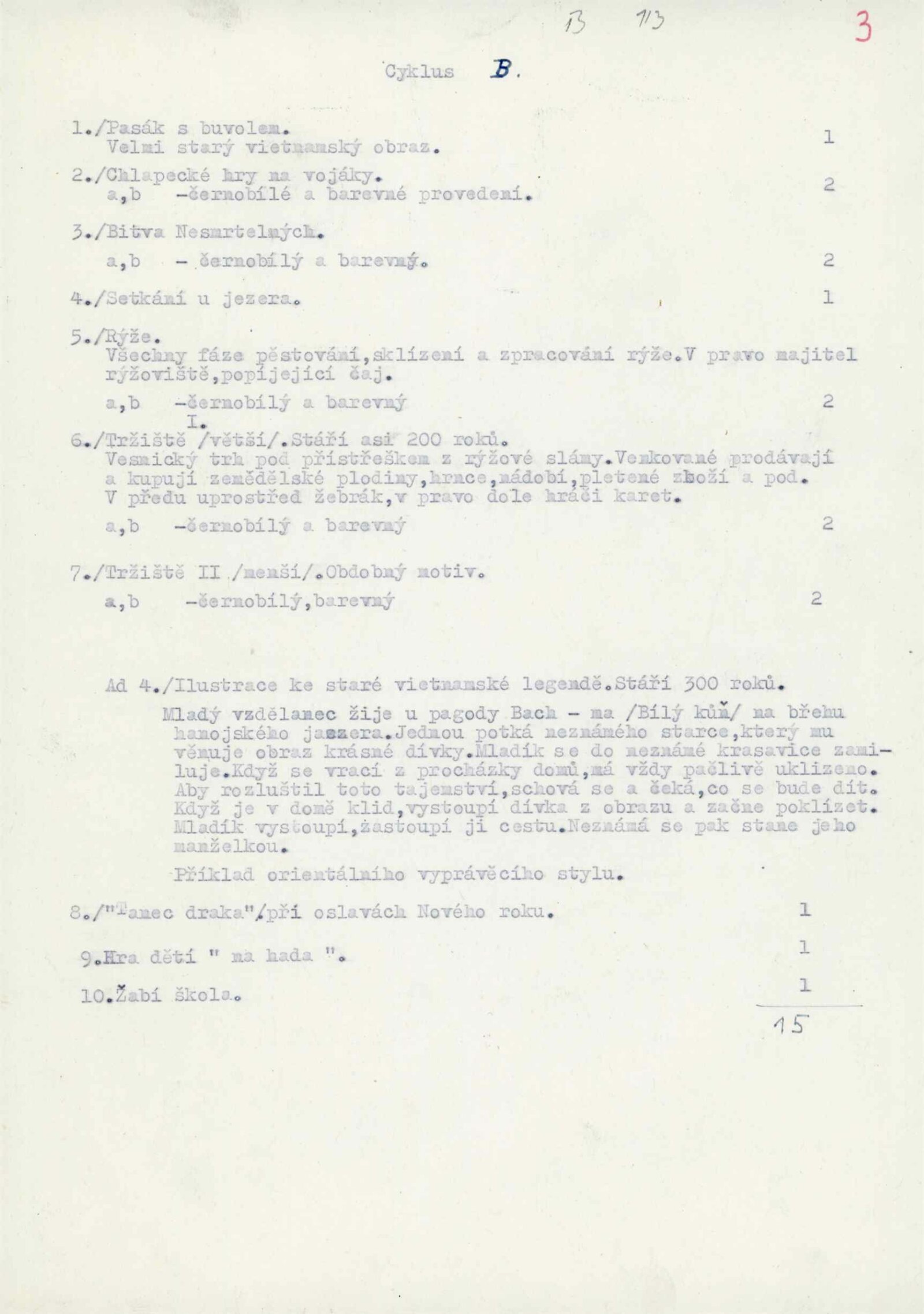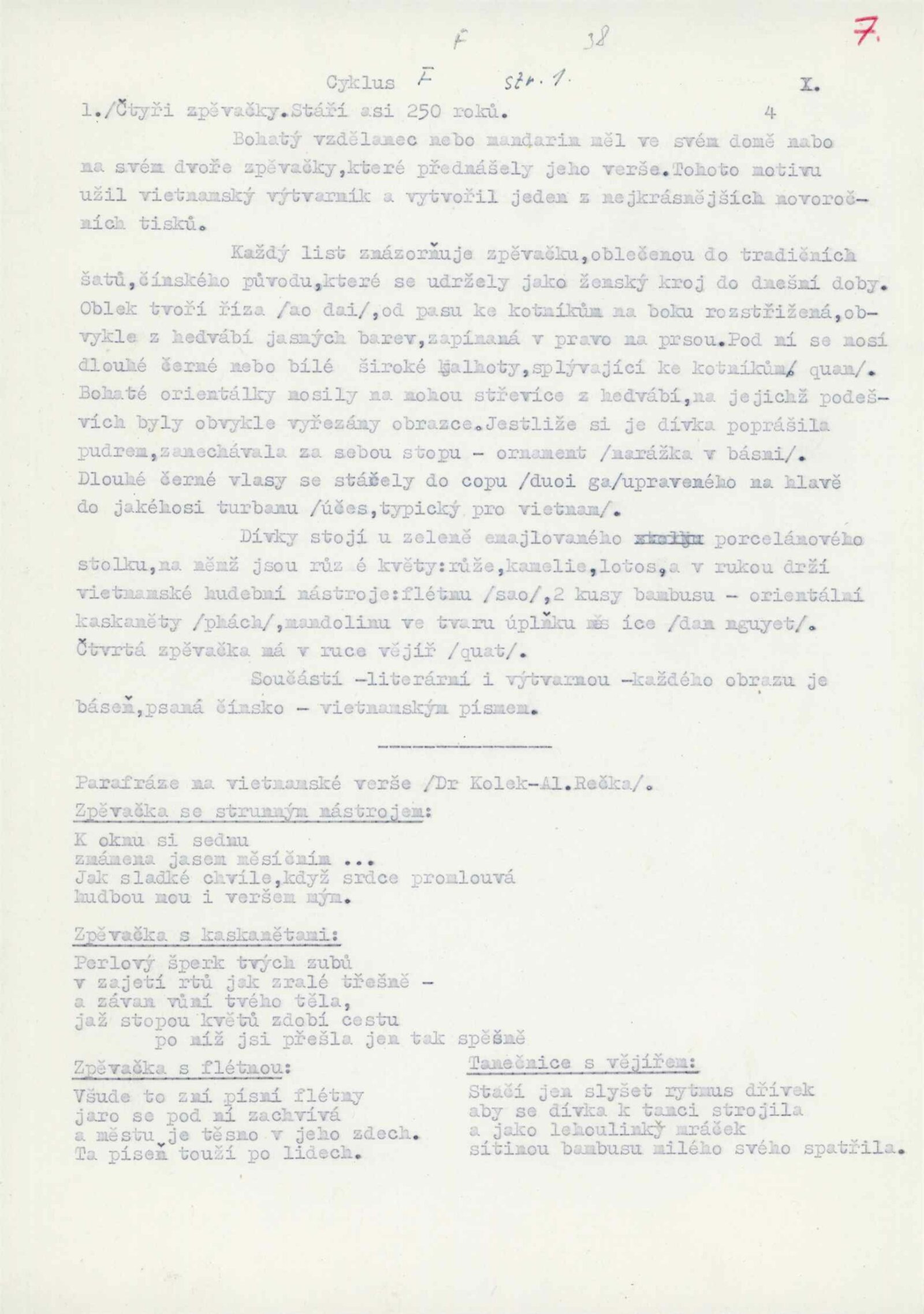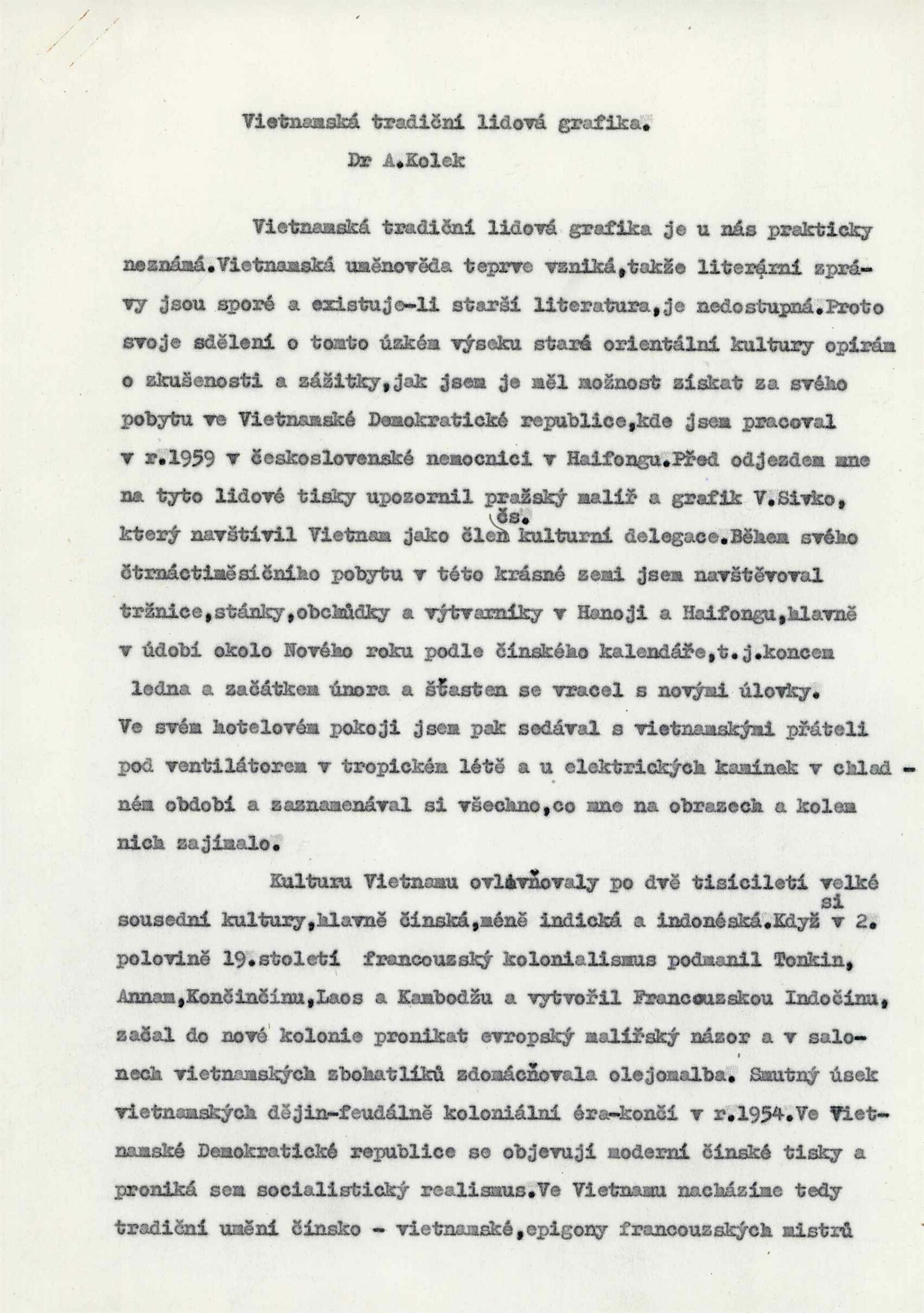 pozvánka, prospekt, úvodní slovo Dr. Antonína Kolka, příklady vietnamských básní a prózy, seznam exponátů s popisy a básněmi, korespondence (s A. Kolkem), reversy, štítky k exponátům, recenze v tisku