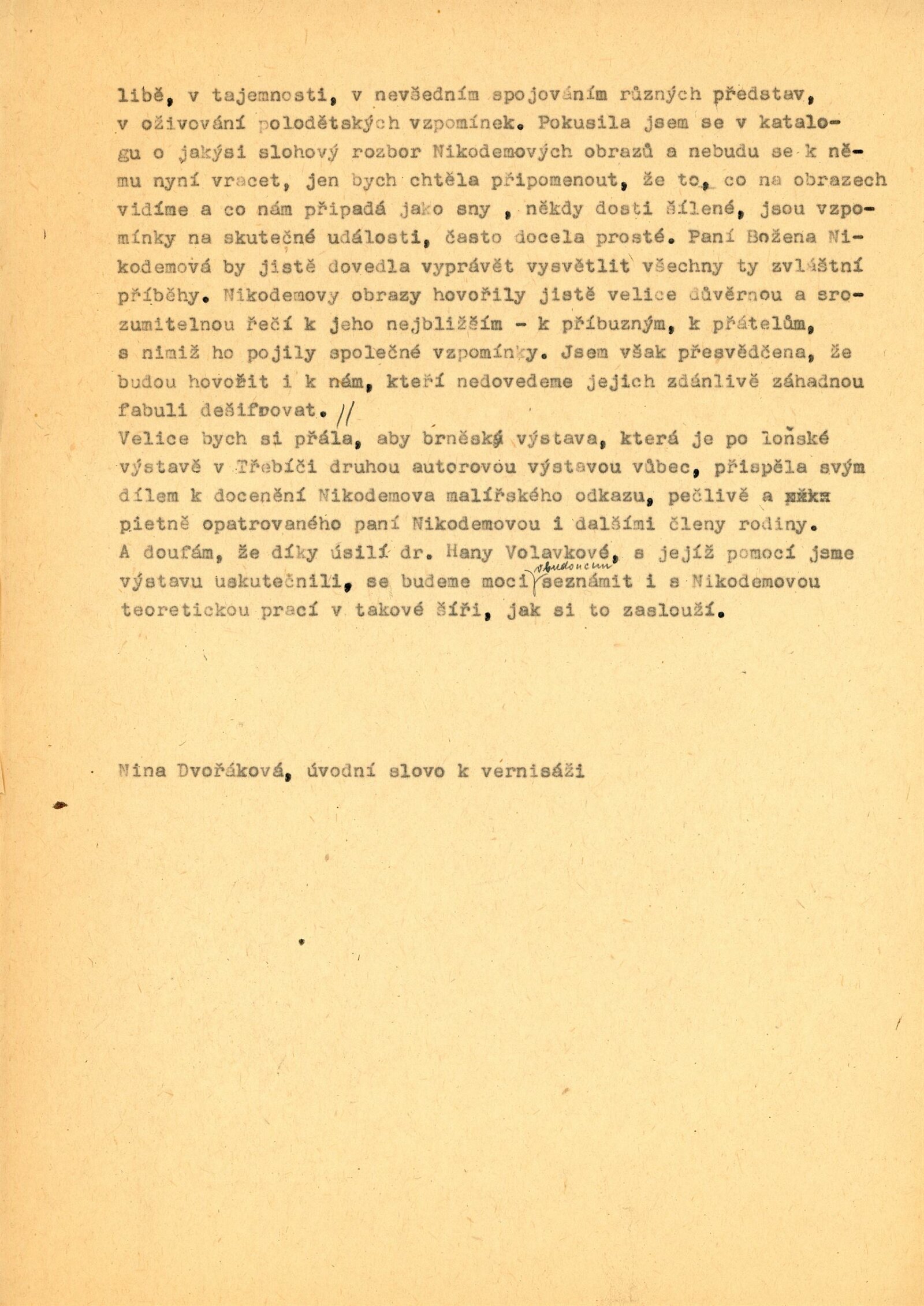 pozvánka, katalog, plakát výstavy (Třebíč), seznam vystavených děl, fotografie výstavy, strojopis úvodního slova k vernisáži (Nina Dvořáková), korespondence (DU + rukopisy Boženy Nikodémové, Karla Lidického, Josefa Věromíra Plevy), provozní korespondence, žádost o povolení výstavy, recenze v tisku, katalog převzaté výstavy (Třebíč)