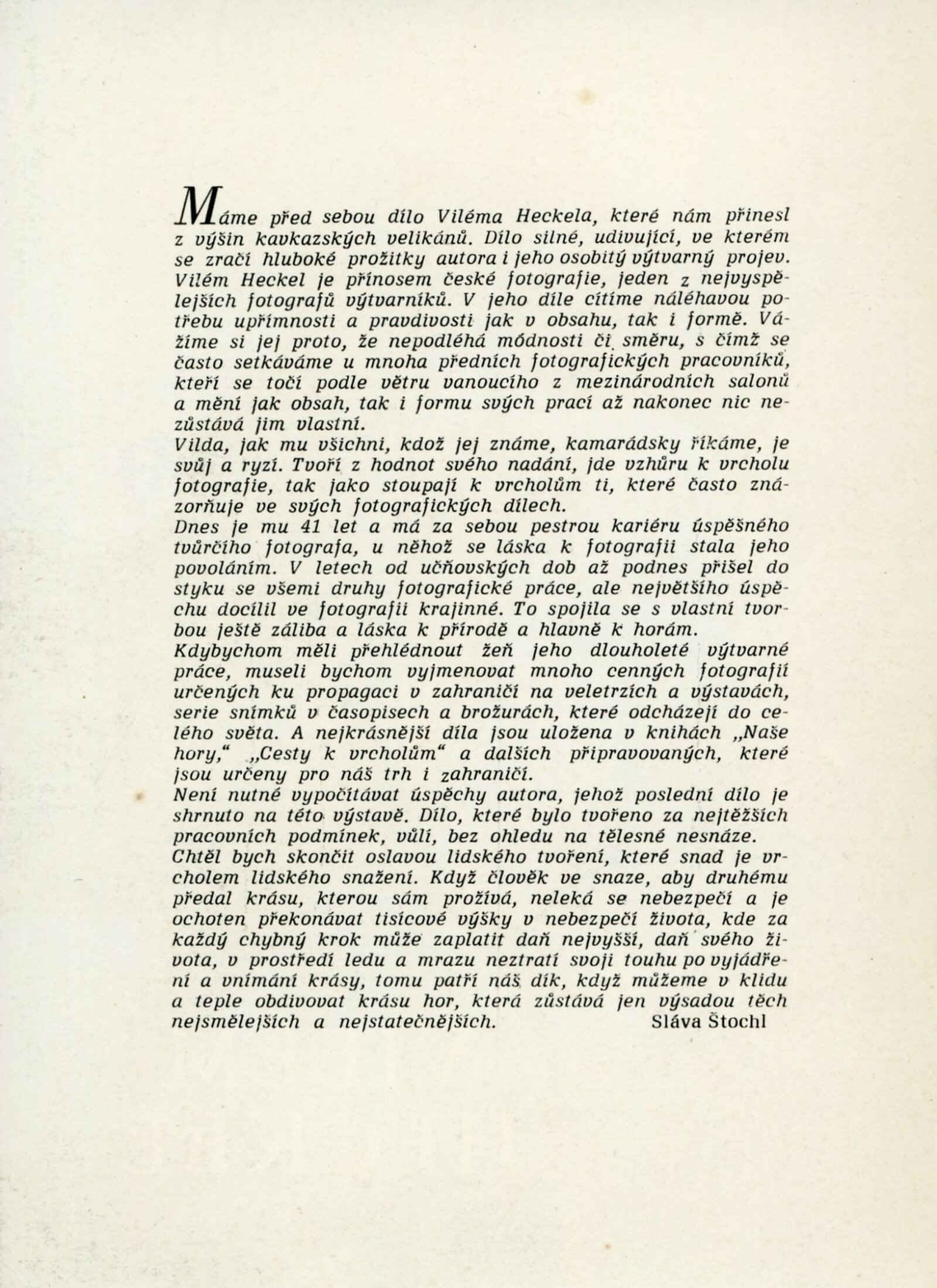 Vilém Heckel. Království slunce a ledu. Fotografie z Kavkazu: Dům umění města Brna / Dům pánů z Poděbrad, Kabinet fotografie J. Funka, 7. výstava, 30. 4. – 24. 5. 1959 / Text: Sláva Štochl. – Brno: DUmB, 1959. – skládačka, 6 s., obr., životopis, DPK 37. – MG