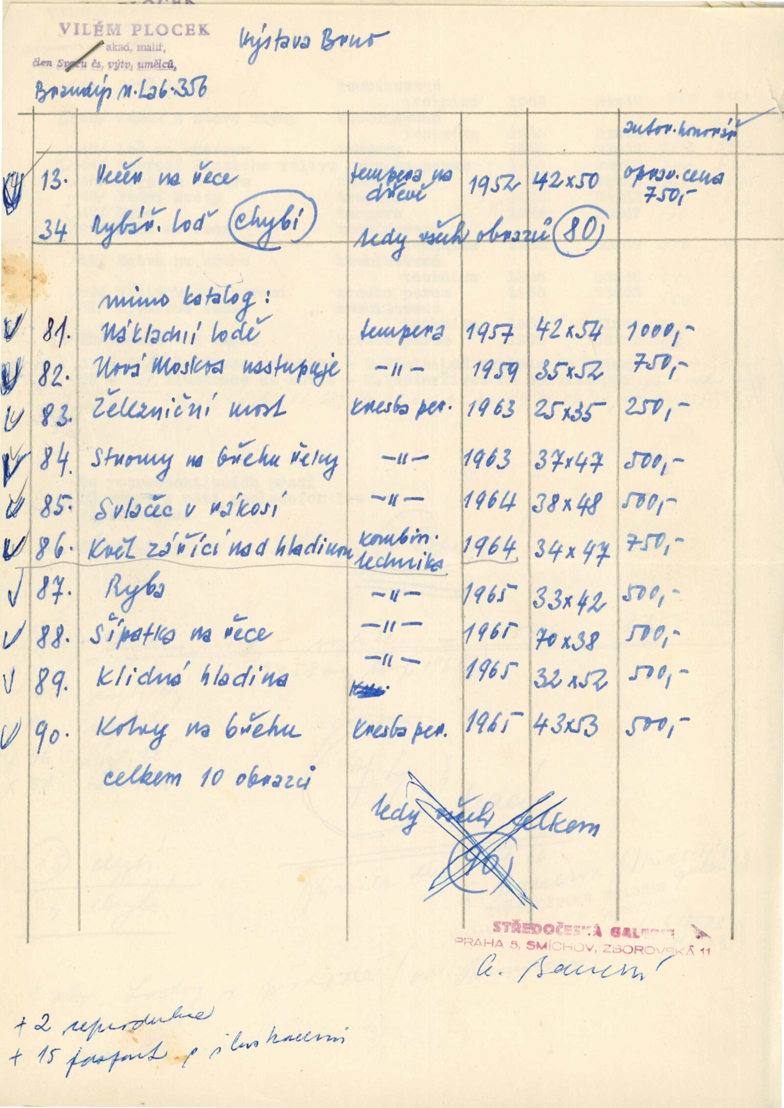 pozvánka, katalog, texty o autorovi, seznamy vystavených děl, fotografie děl, korespondence (Adolf Kroupa s Vilémem Plockem), revers, smlouva DU s vystavovatelem, recenze v tisku, pozvánka na Plockovu výstavu (Brandýs n. L., pořad Studia soudobé hudby Janáčkovy akademie)